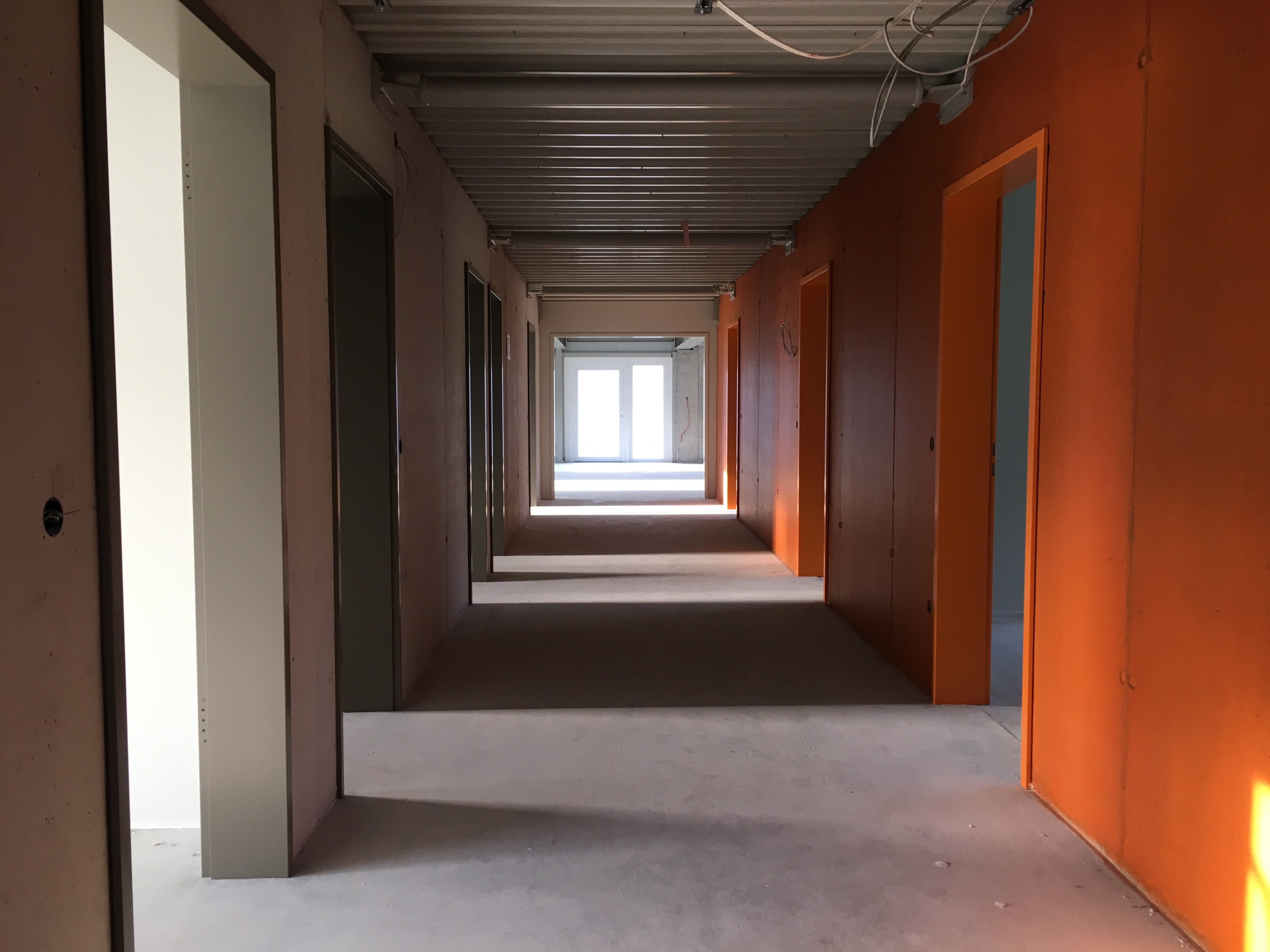 Werkstatt für Menschen mit Behinderung 'Team Pirmin'. 3600,00 m² Nutzfläche. Sichtbetonkonstruktion und Stahlkonstruktion. Farbkonzept mit Betonlasuren in unterschiedlichen Farben. Die Architektur des Gebäudes wird bestimmt durch naturbelassene Materialien und ein klares Farbkonzept.