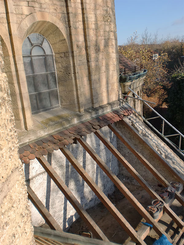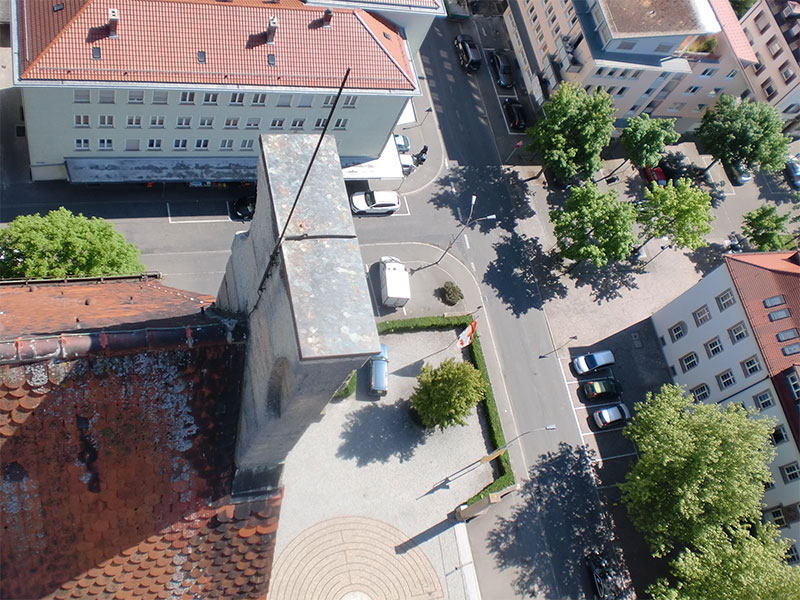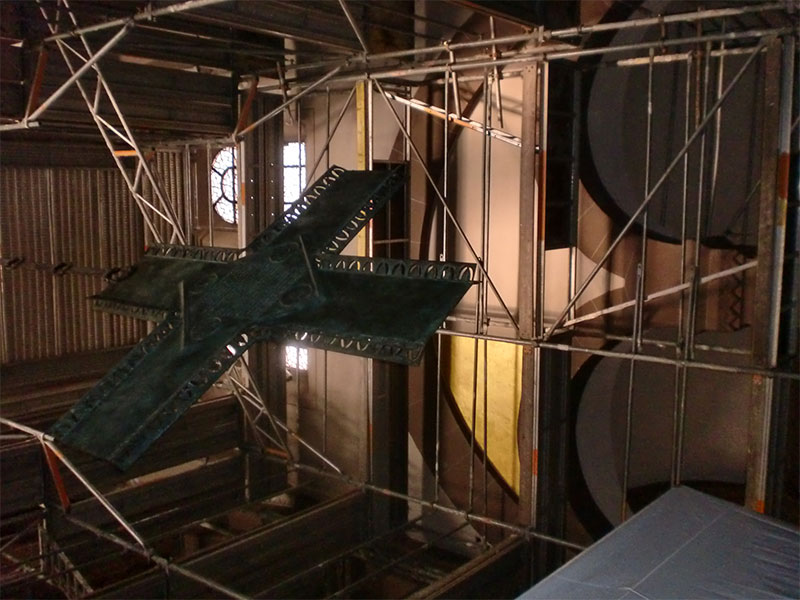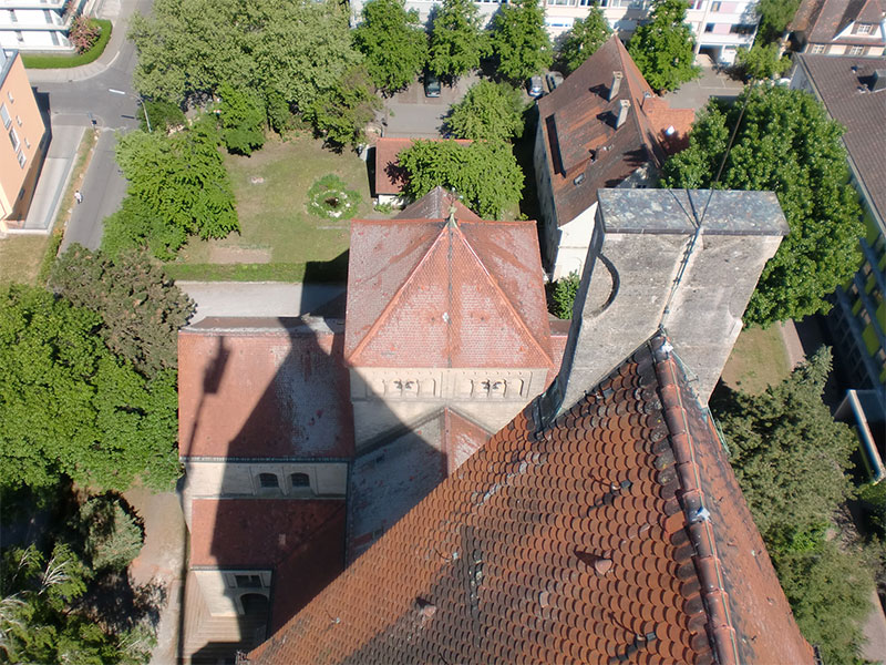 Sanierung der Raumschale der neoromanischen Herz-Jesu-Kirche in Singen. Unsere Planung umfasste nicht nur die Innenarchitektur sondern auch den Vorplatz mit dem Labyrinth. Das Zentrum des Labyrinths bildet ein Ankerkreuz, welches sich im Inneren der Kirche an der Decke und rechts und links des Chores in der Goldfläche wiederholt.
