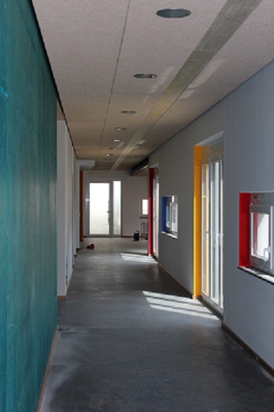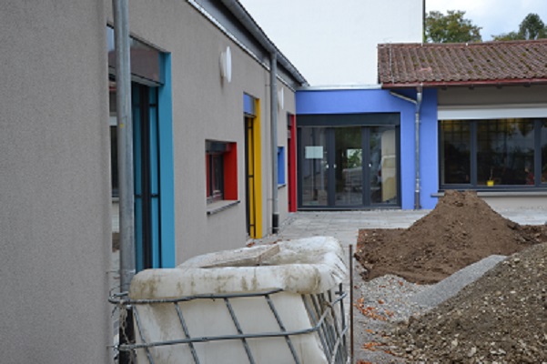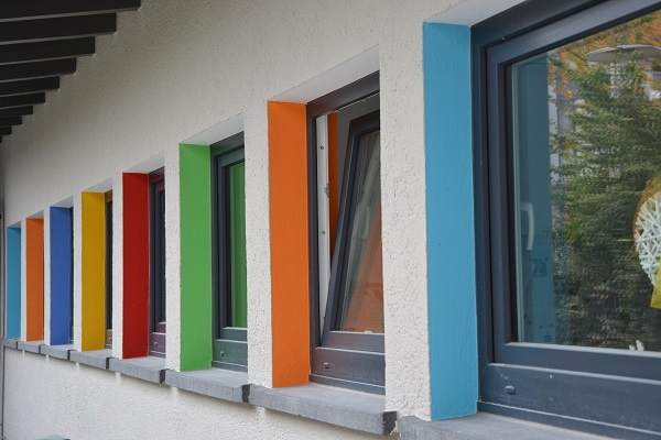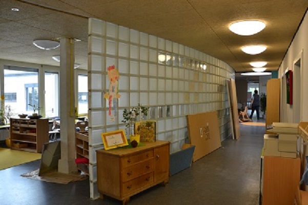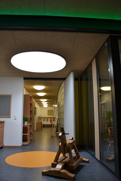 Umbau und Erweiterung der KiTa St. Nikolaus in Singen. Farbkonzept mit versteckten Farben. Beim Betreten der KiTa kaum wahrgenommen, sieht man viele Farben, wenn man sich umdreht somit können die Kinder die Architektur erleben und entdecken.