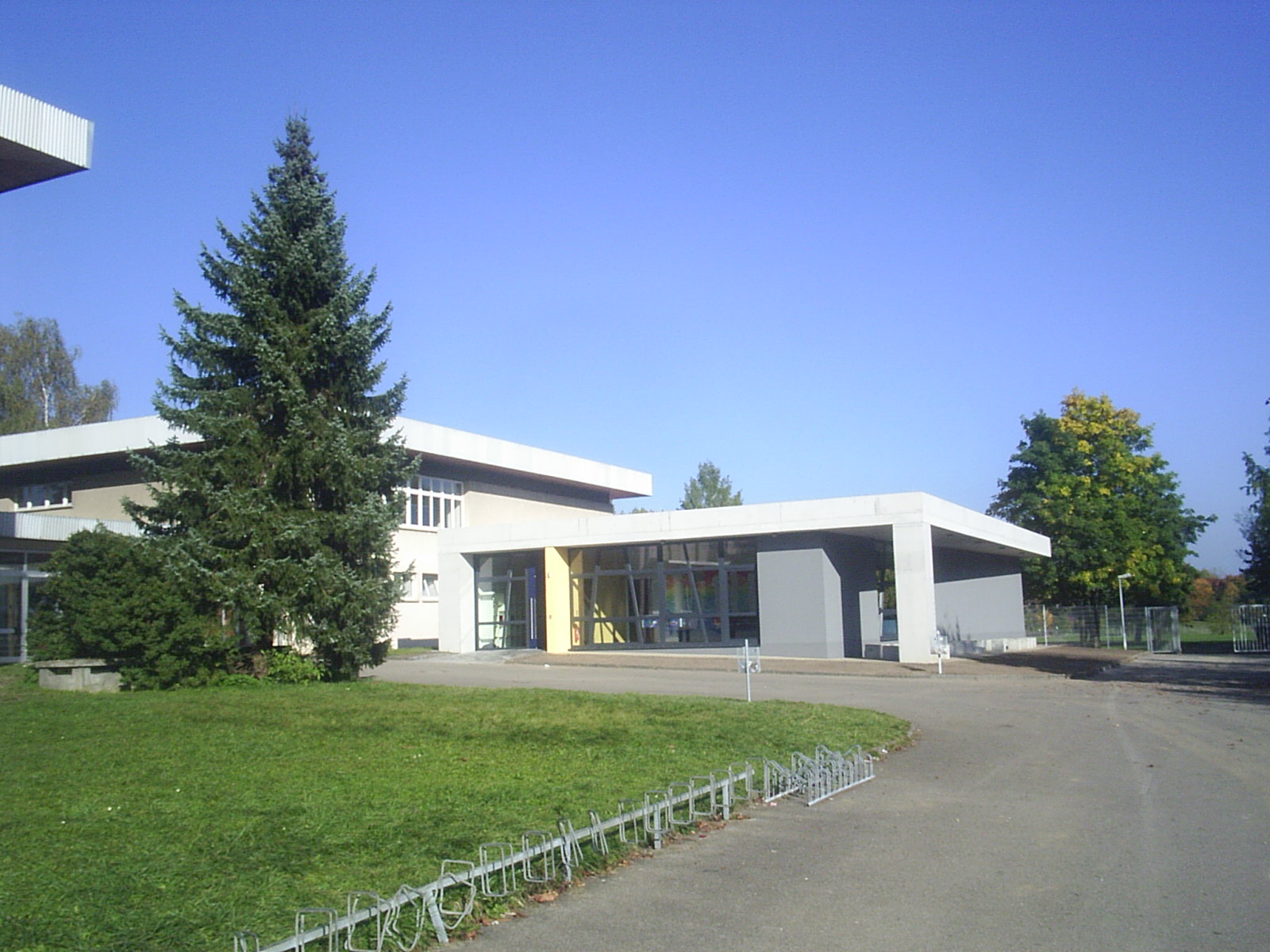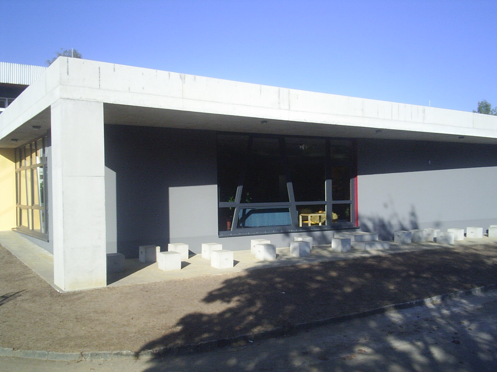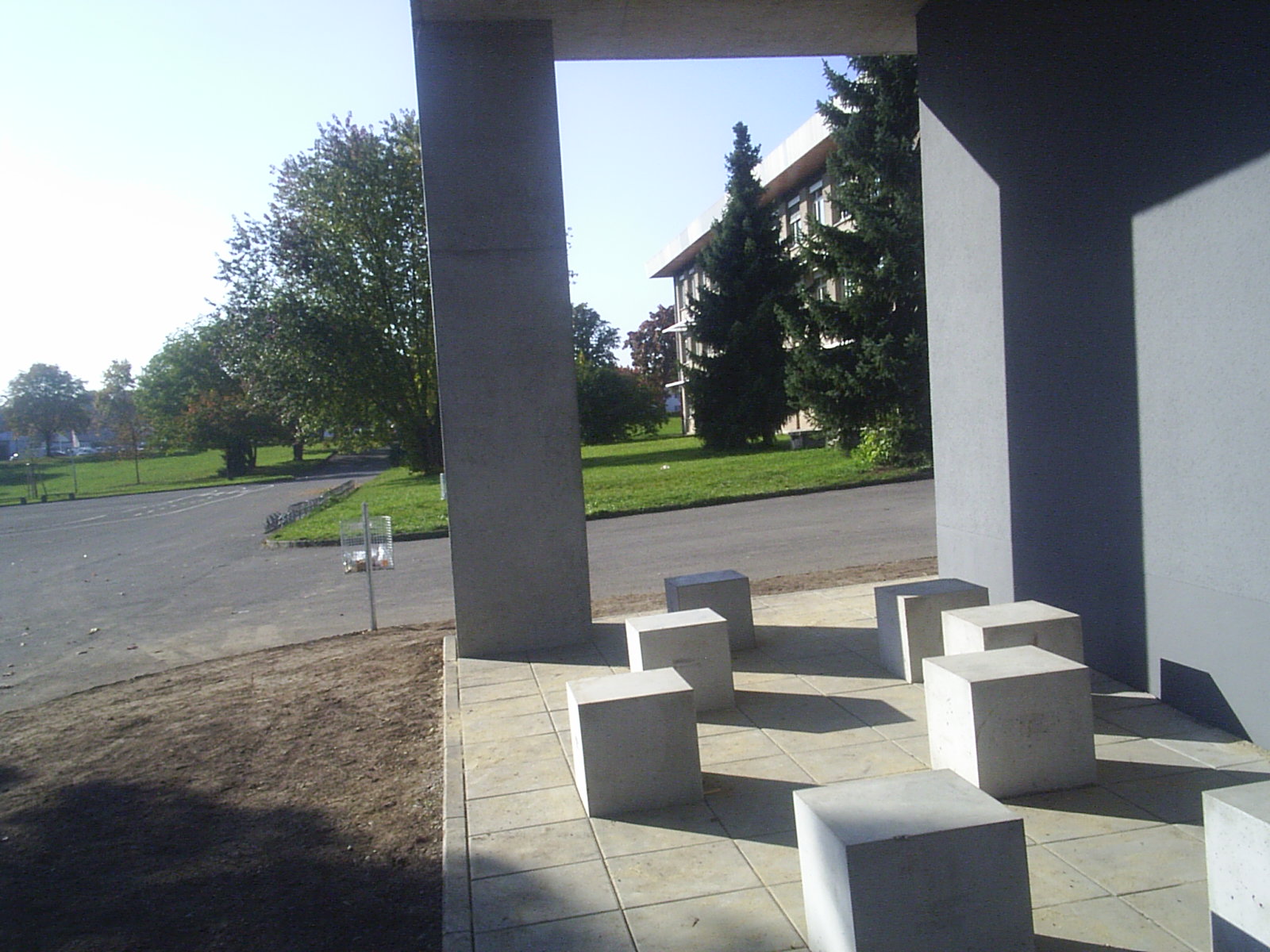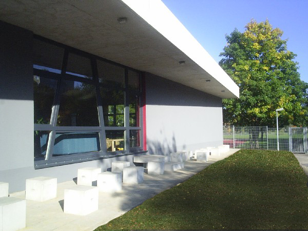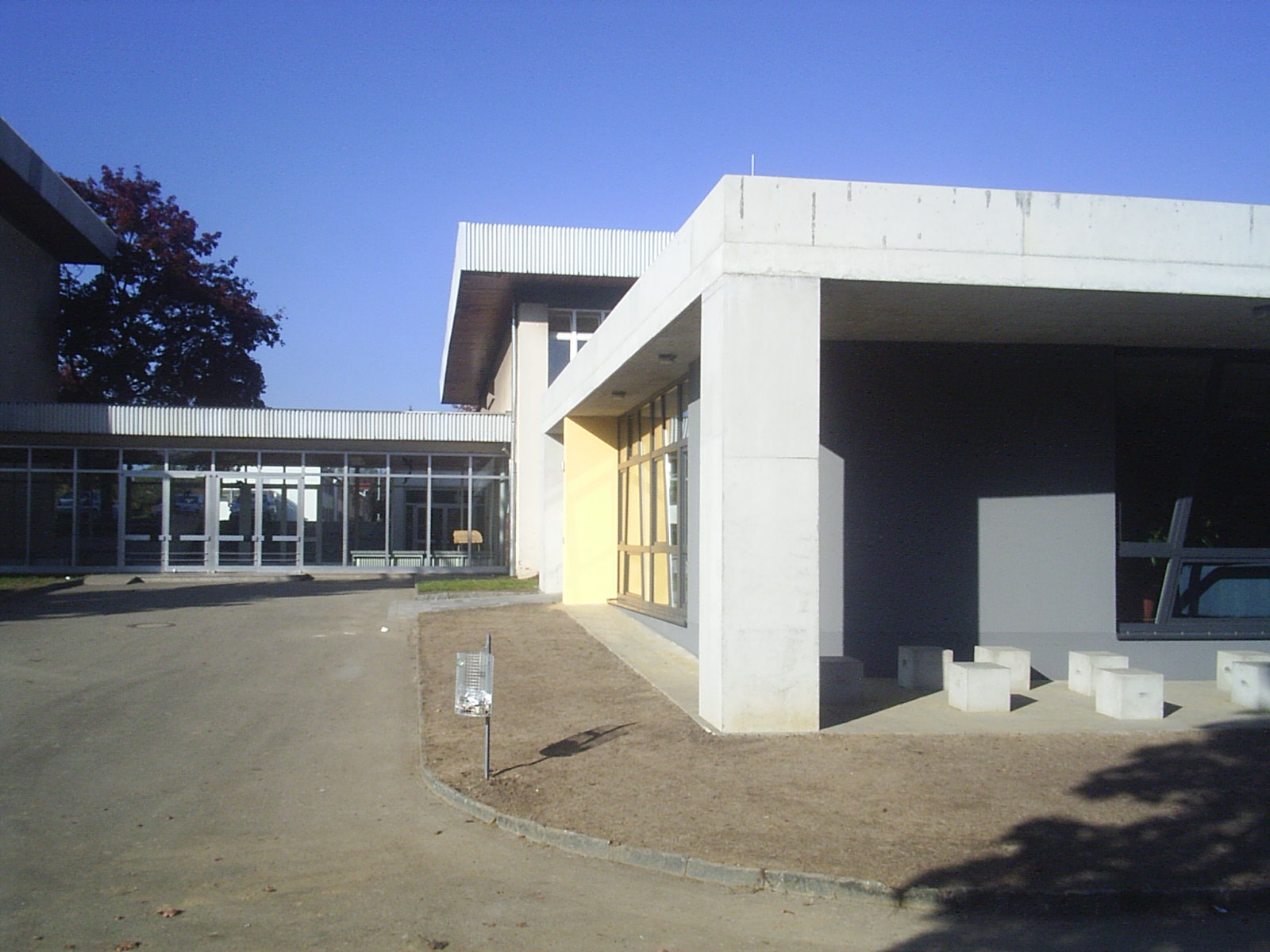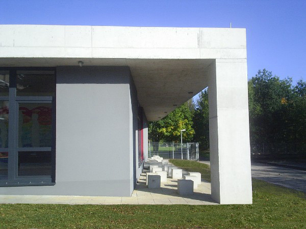 Anbau eines Mensagebäudes an die Johann-Peter-Hebel-Schule in Singen. Das Gebäude ist eine Sichtbetonkonstruktion. Formale Übernahme der Propotionen des Bestandsgebäudes