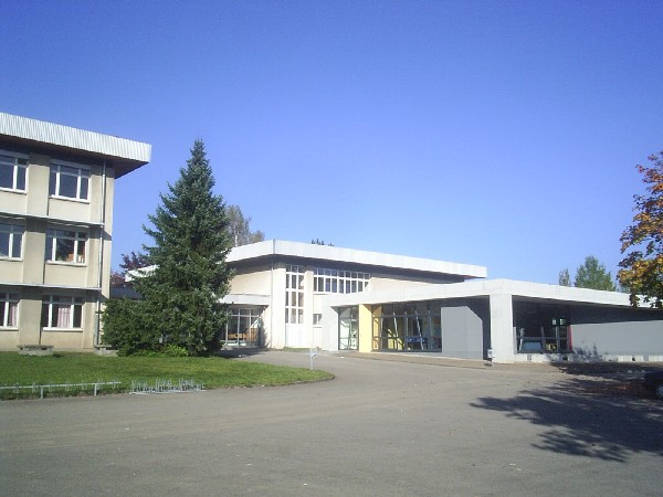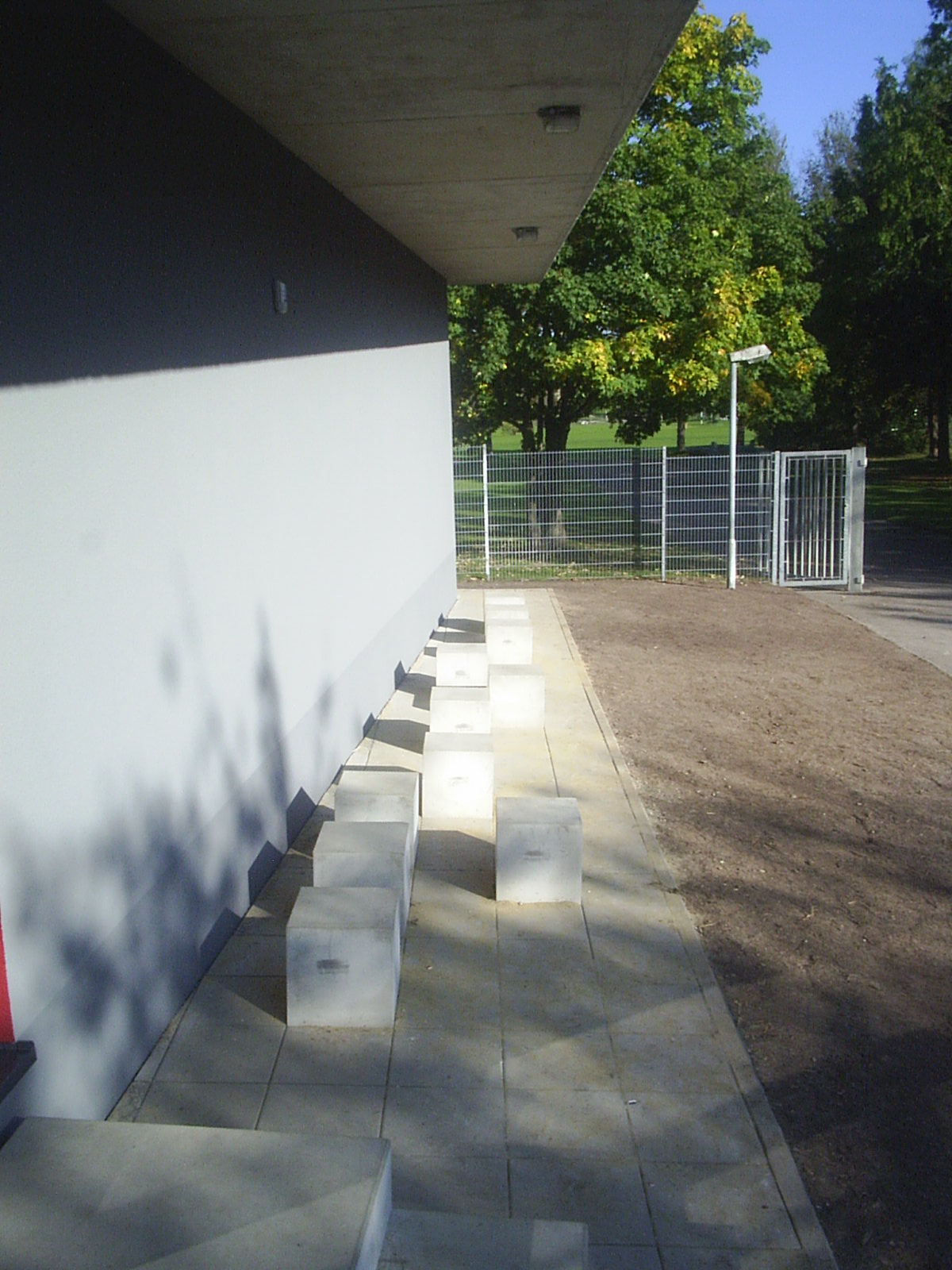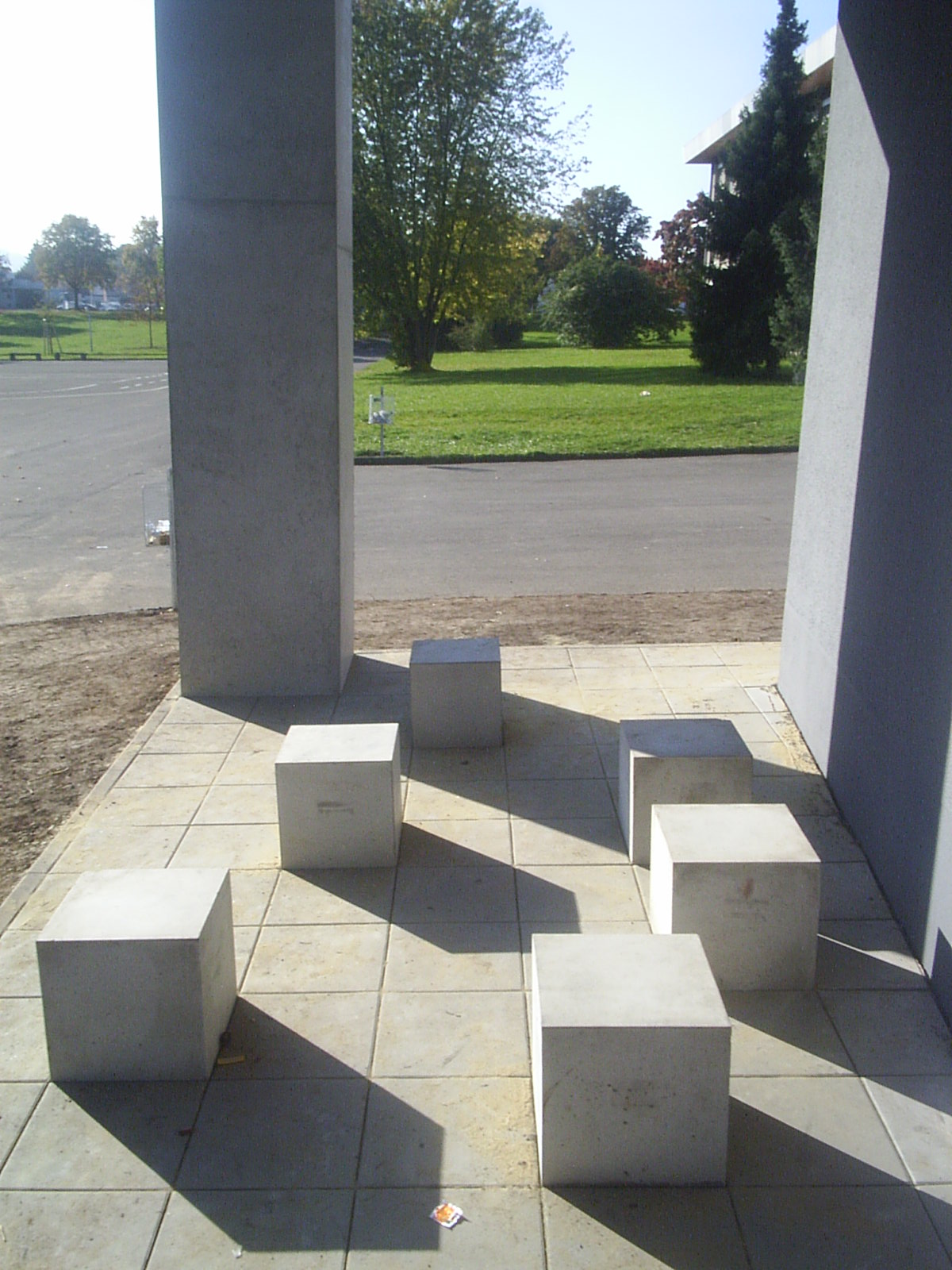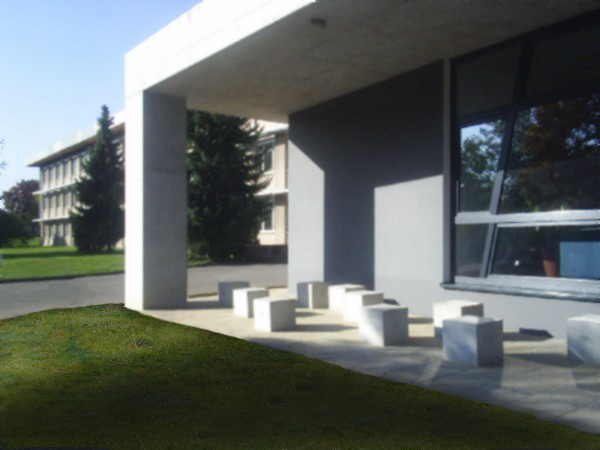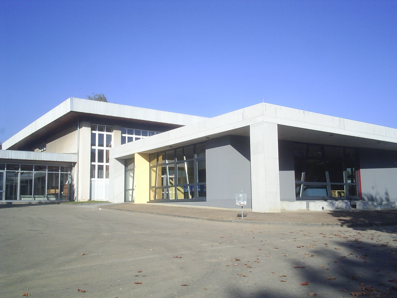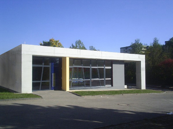 Anbau eines Mensagebäudes an die Johann-Peter-Hebel-Schule in Singen. Das Gebäude ist eine Sichtbetonkonstruktion. Formale Übernahme der Propotionen des Bestandsgebäudes