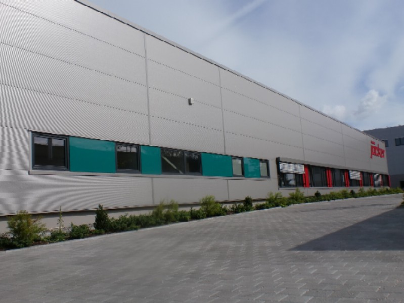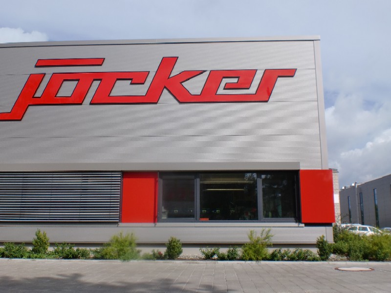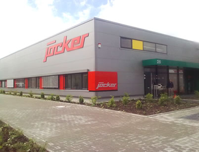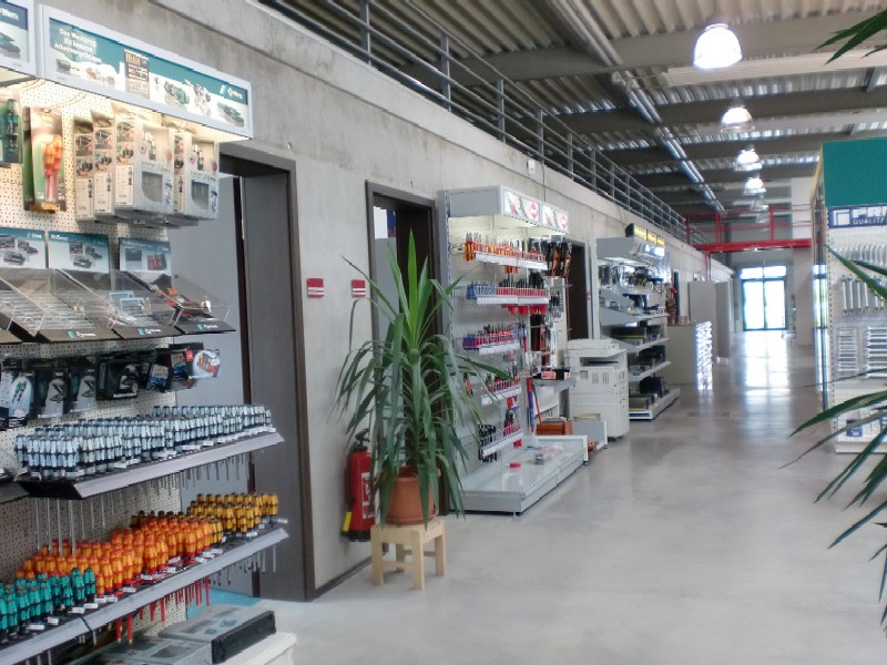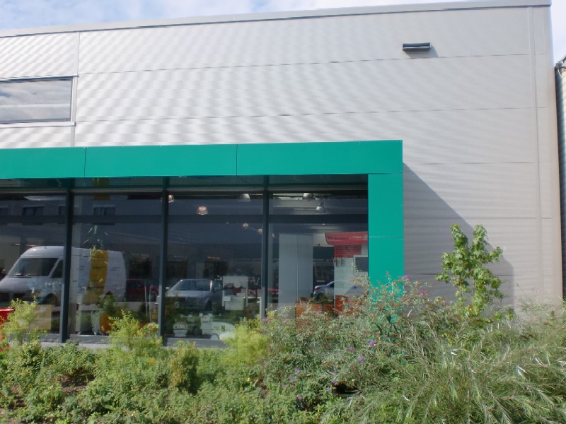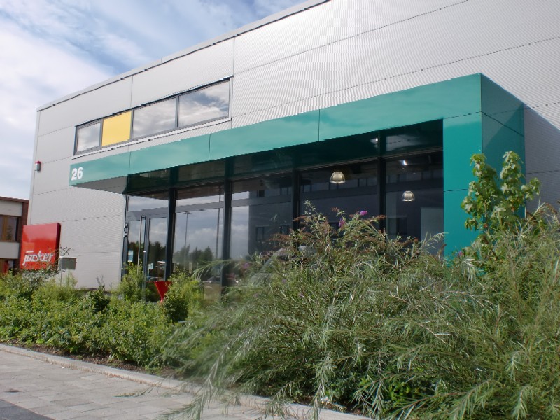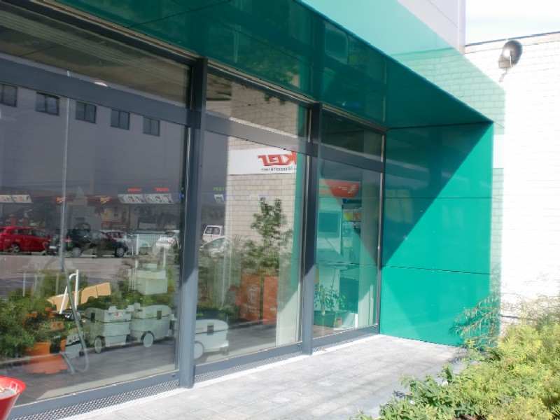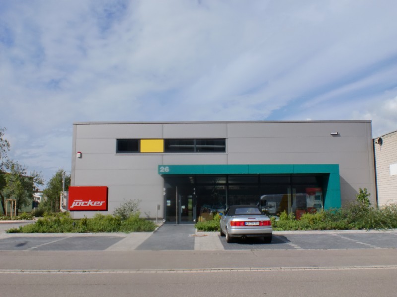 Verwaltung mit Verkaufshalle für Großhandel für Werkzeuge und Maschinen in Singen. Stahlbetonkonstruktion und Stahlkonstruktion. Nahwärmeversorgung. Die Architekturfarben an diesem Objekt werden bestimmt durch die Firmenfarben und die Verbandsfarben.