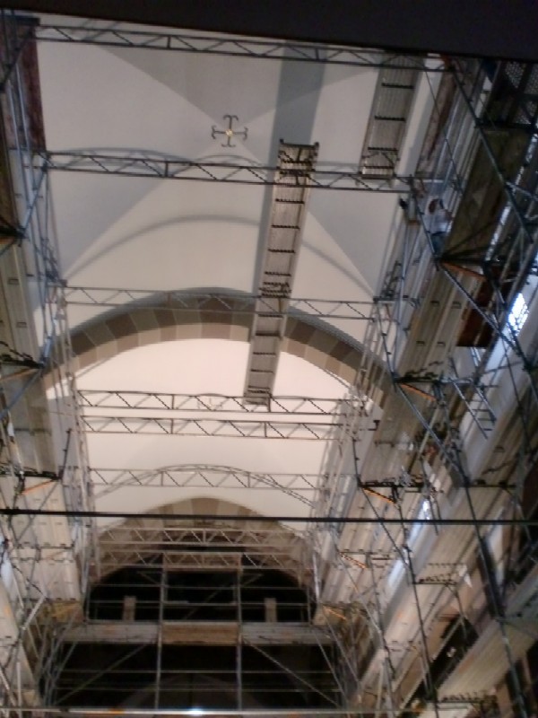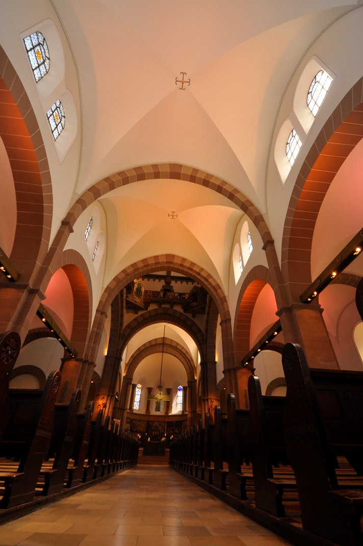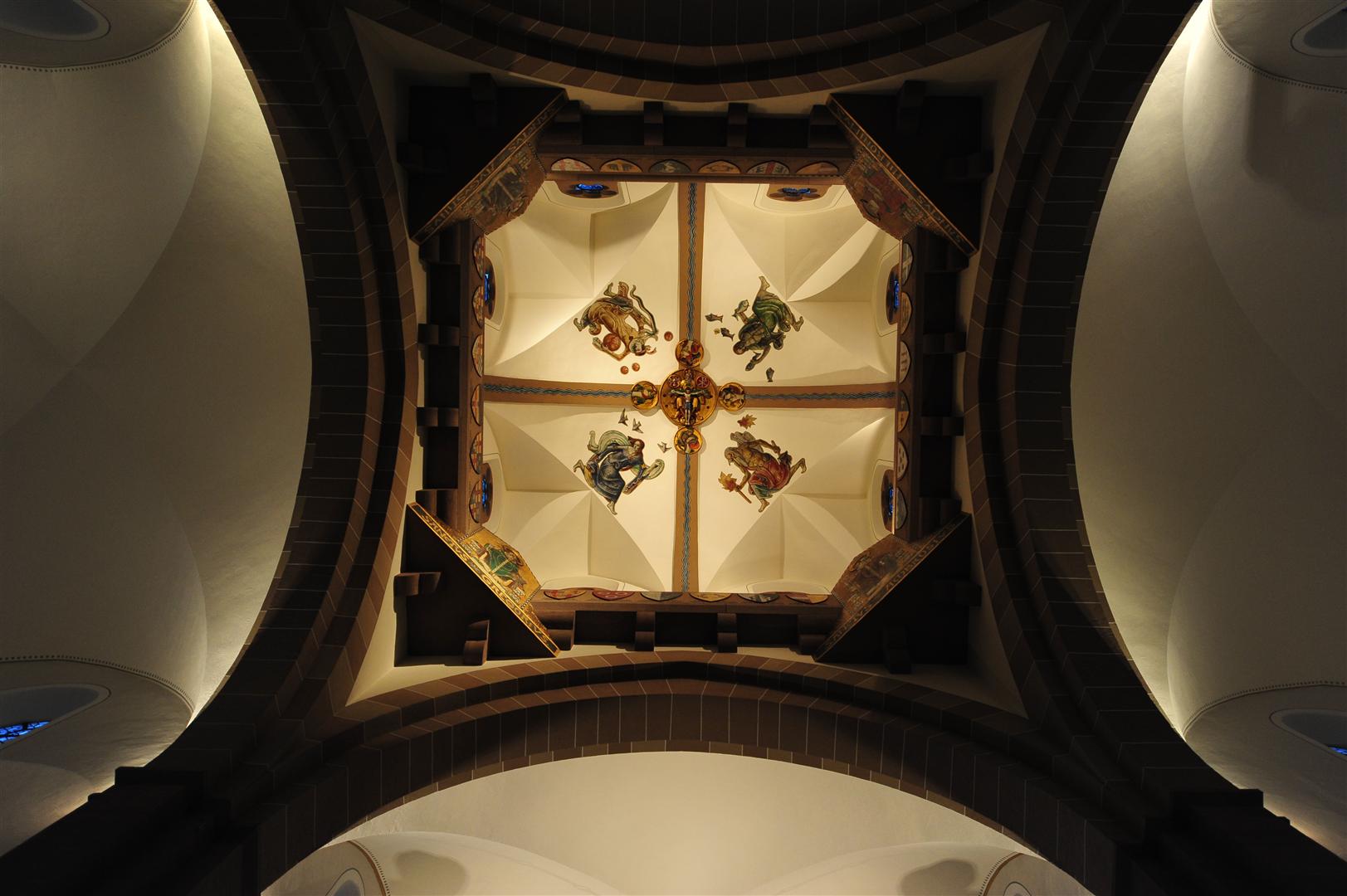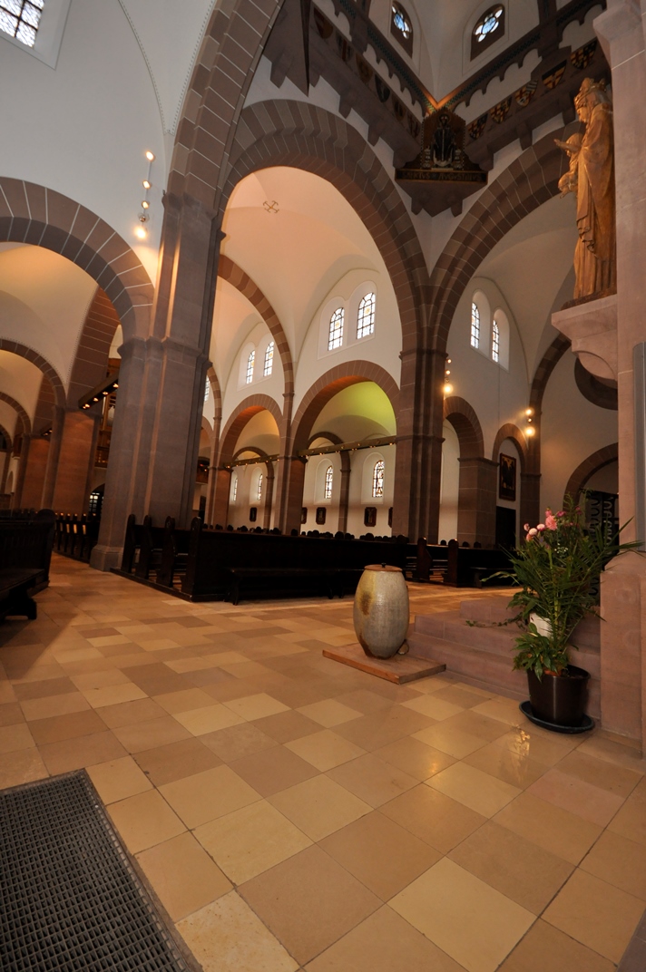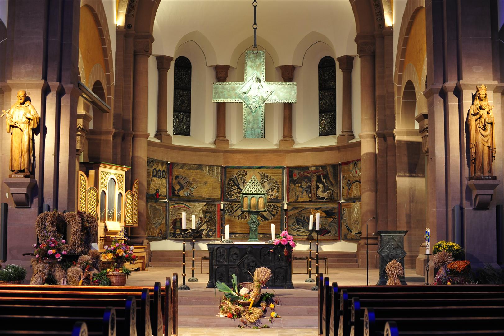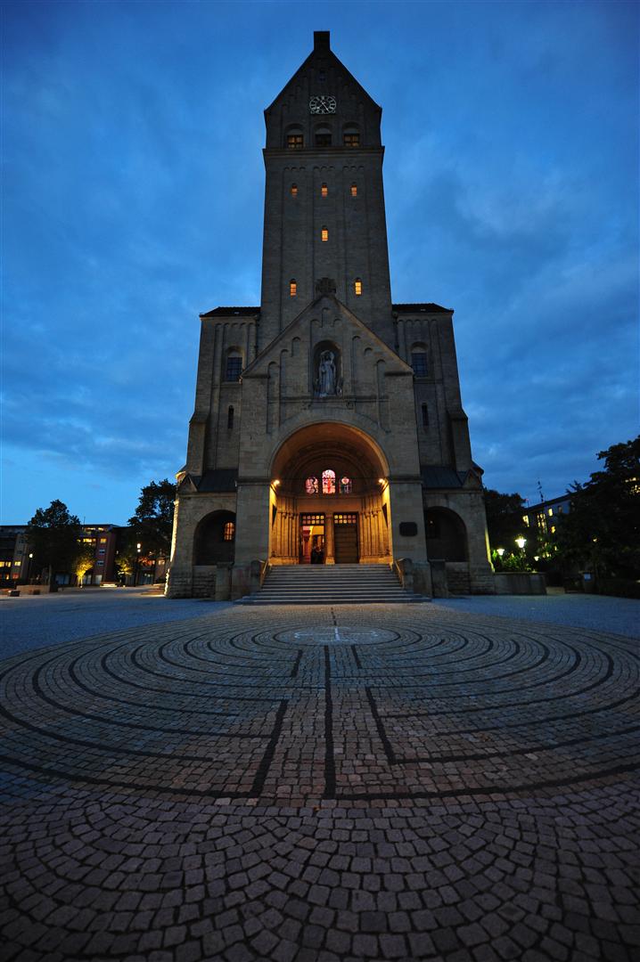 Sanierung der Raumschale der neoromanischen Herz-Jesu-Kirche in Singen. Unsere Planung umfasste nicht nur die Innenarchitektur sondern auch den Vorplatz mit dem Labyrinth. Das Zentrum des Labyrinths bildet ein Ankerkreuz, welches sich im Inneren der Kirche an der Decke und rechts und links des Chores in der Goldfläche wiederholt.