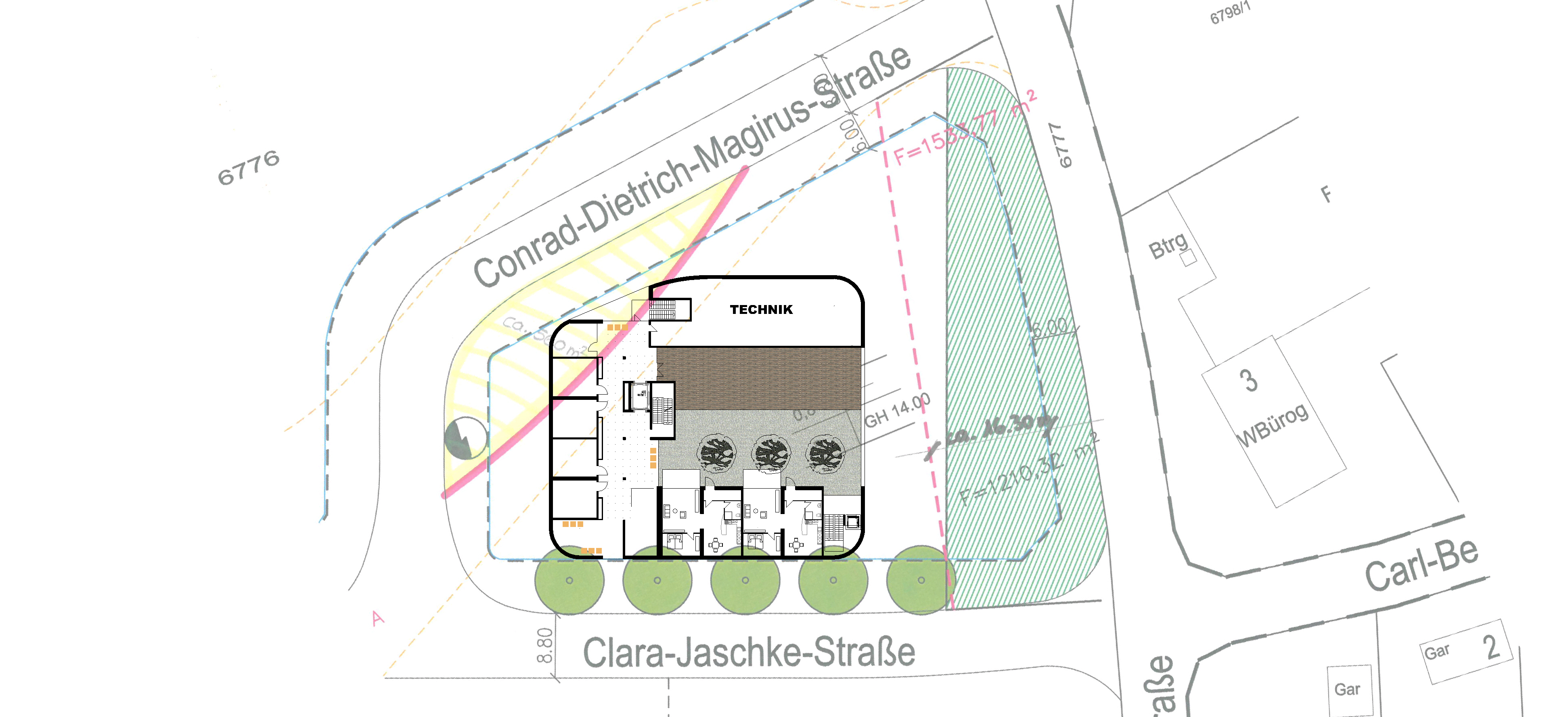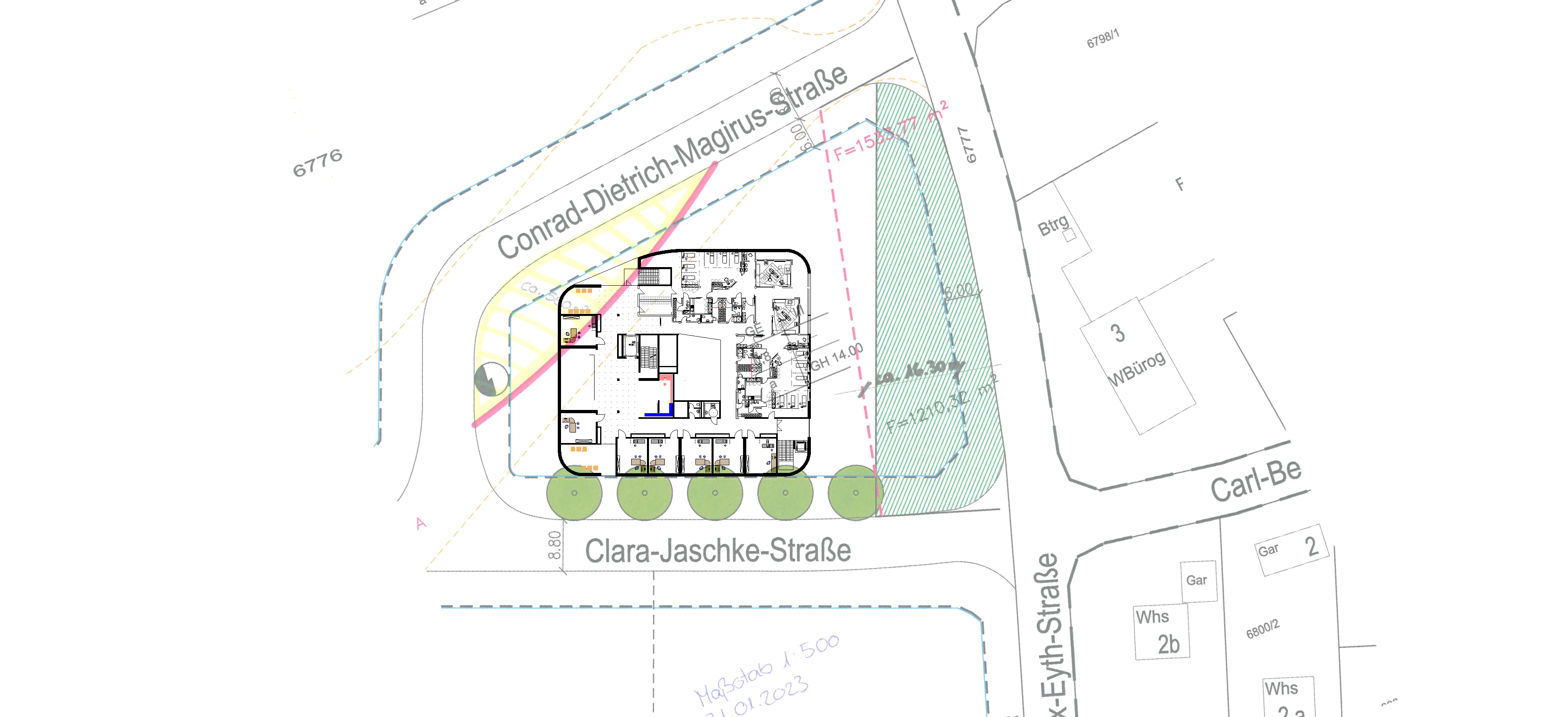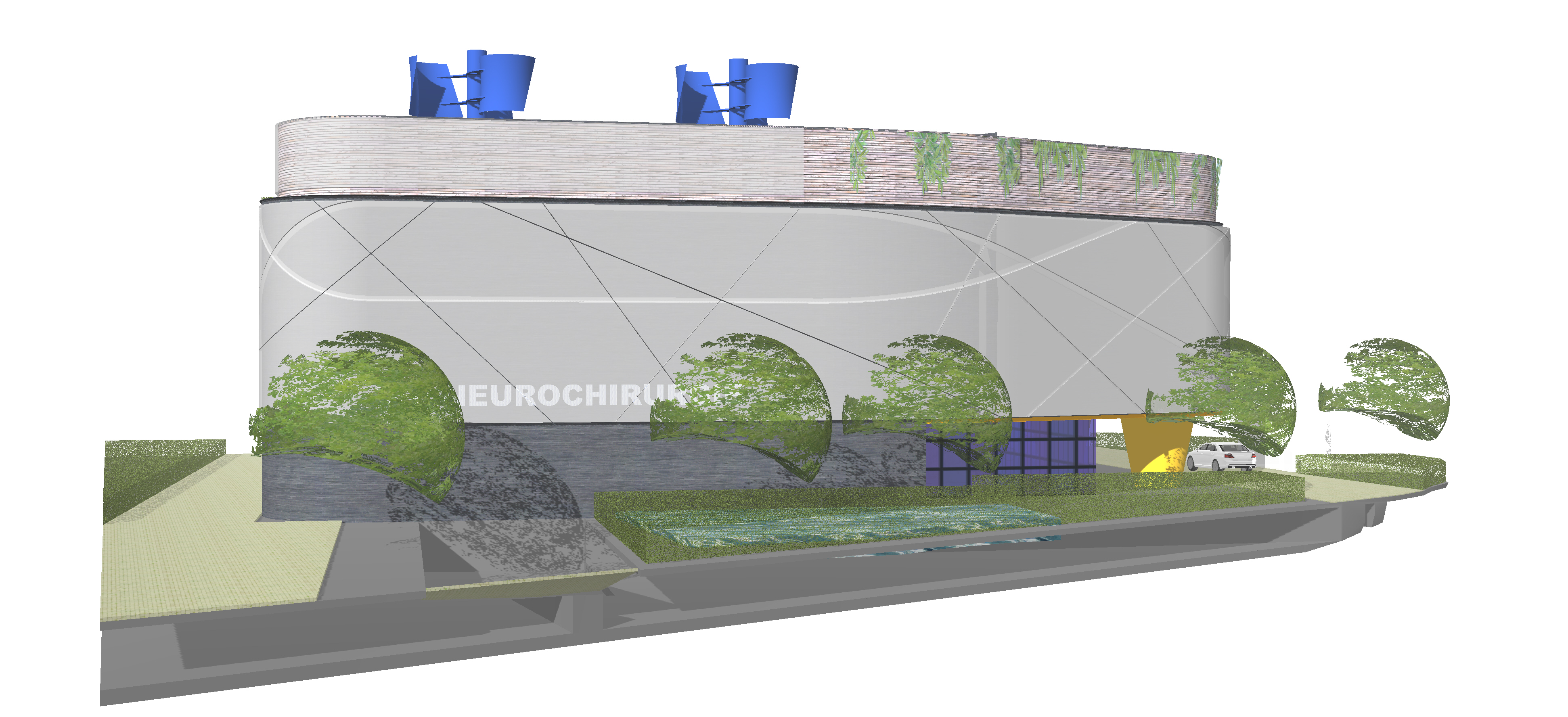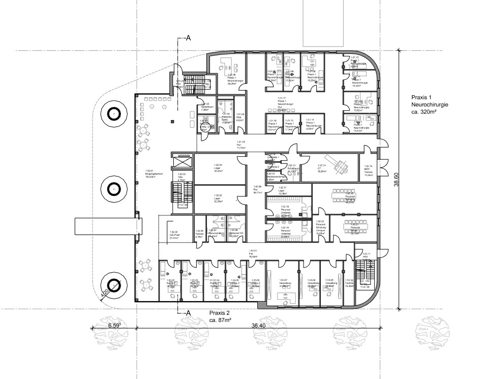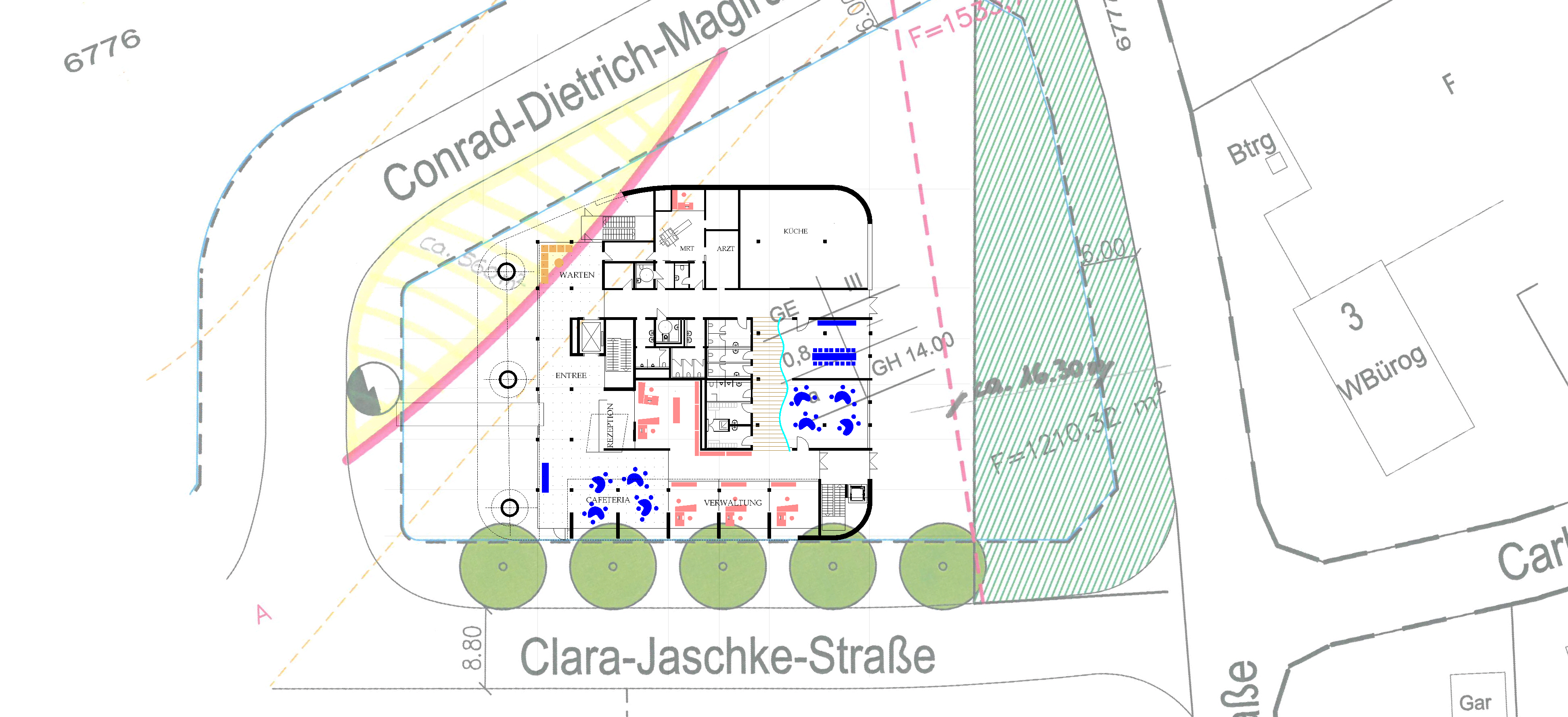 Planung eines MVZ (Medizinisches Versorgungszentrums) in Rielasingen-Worblingen mit mehreren OP-Räumen und mehreren Arztpraxen. Windkraftanlage und PV auf dem Dach. Architektur mit weitgehend recycelbaren Materialien.