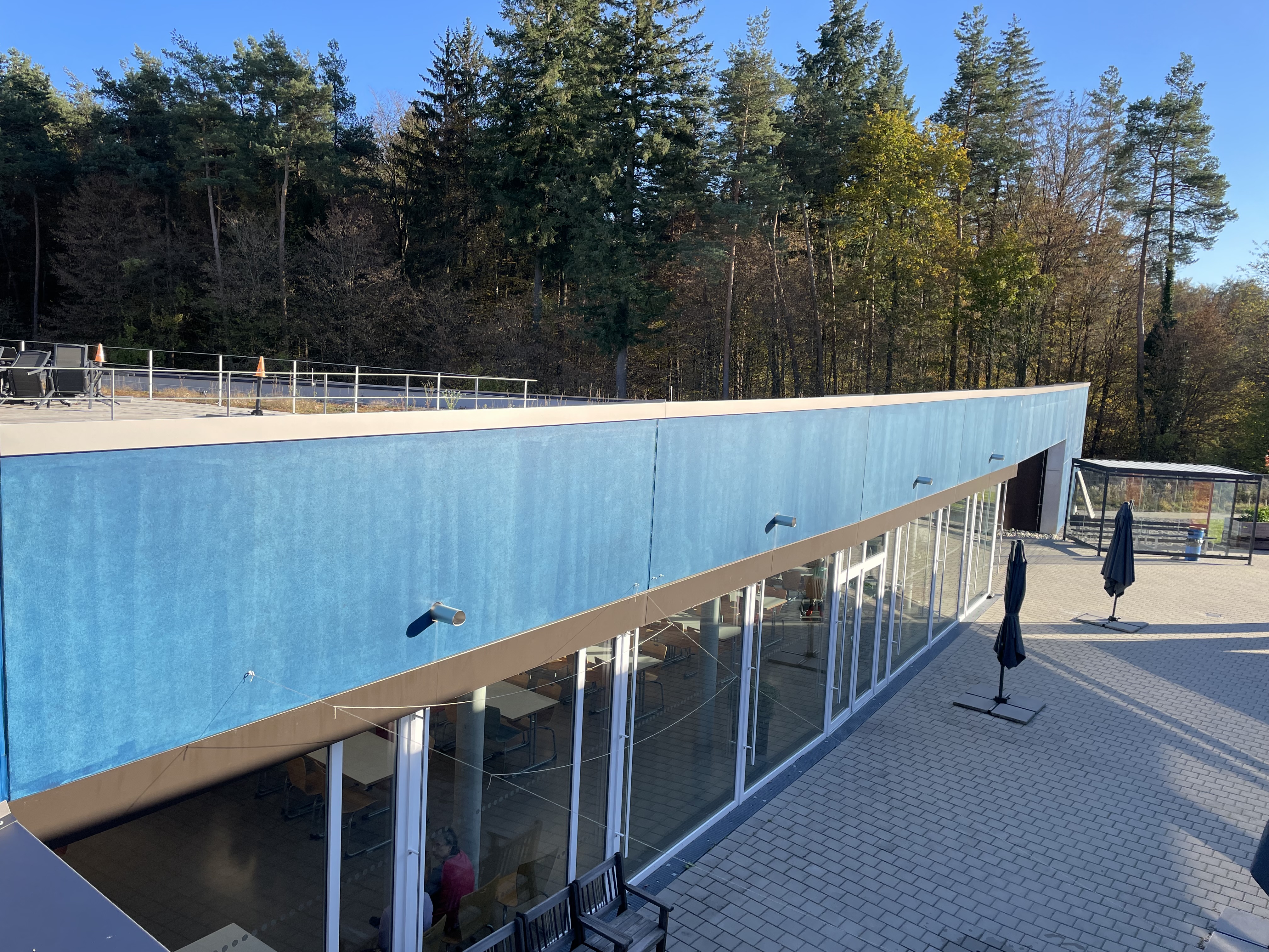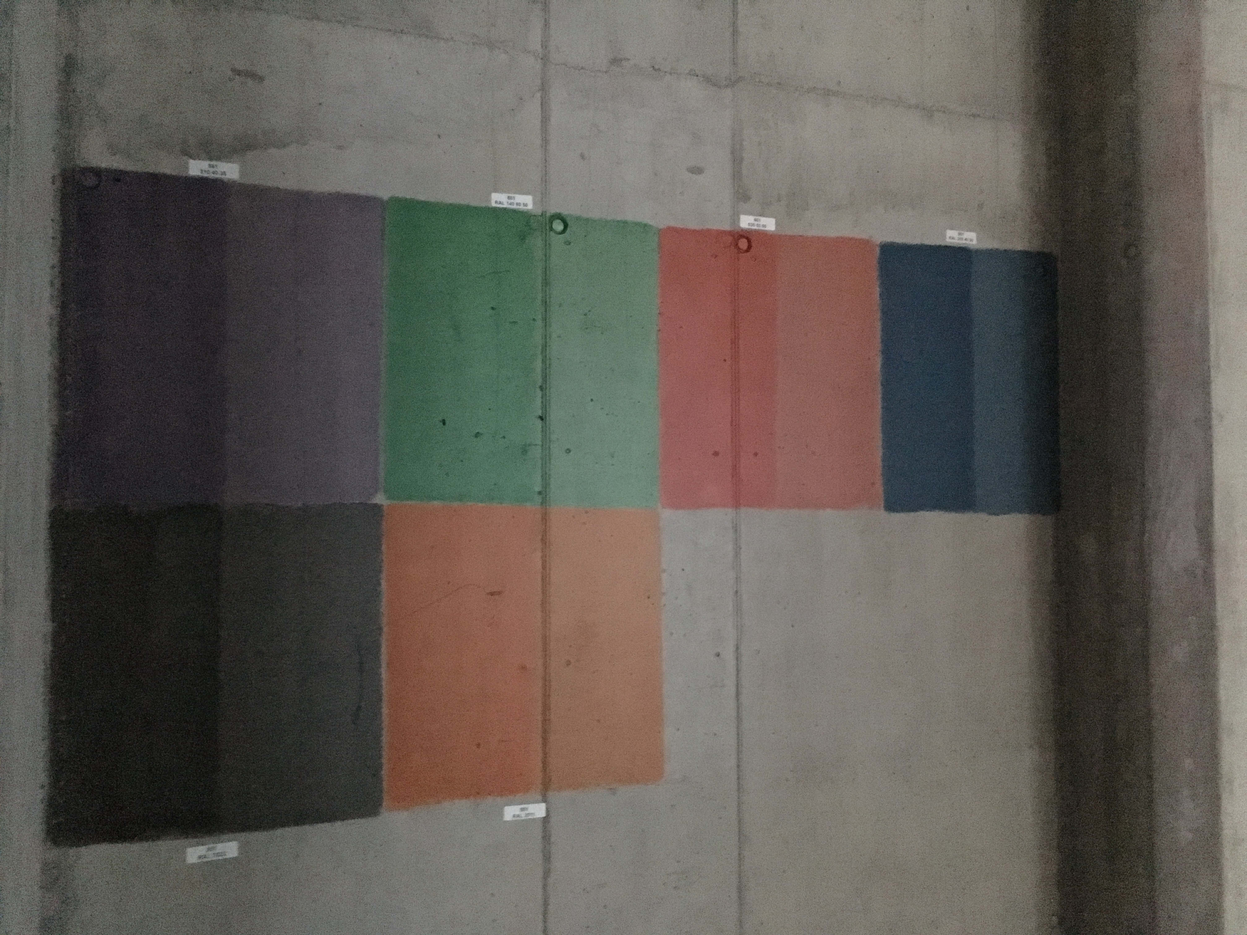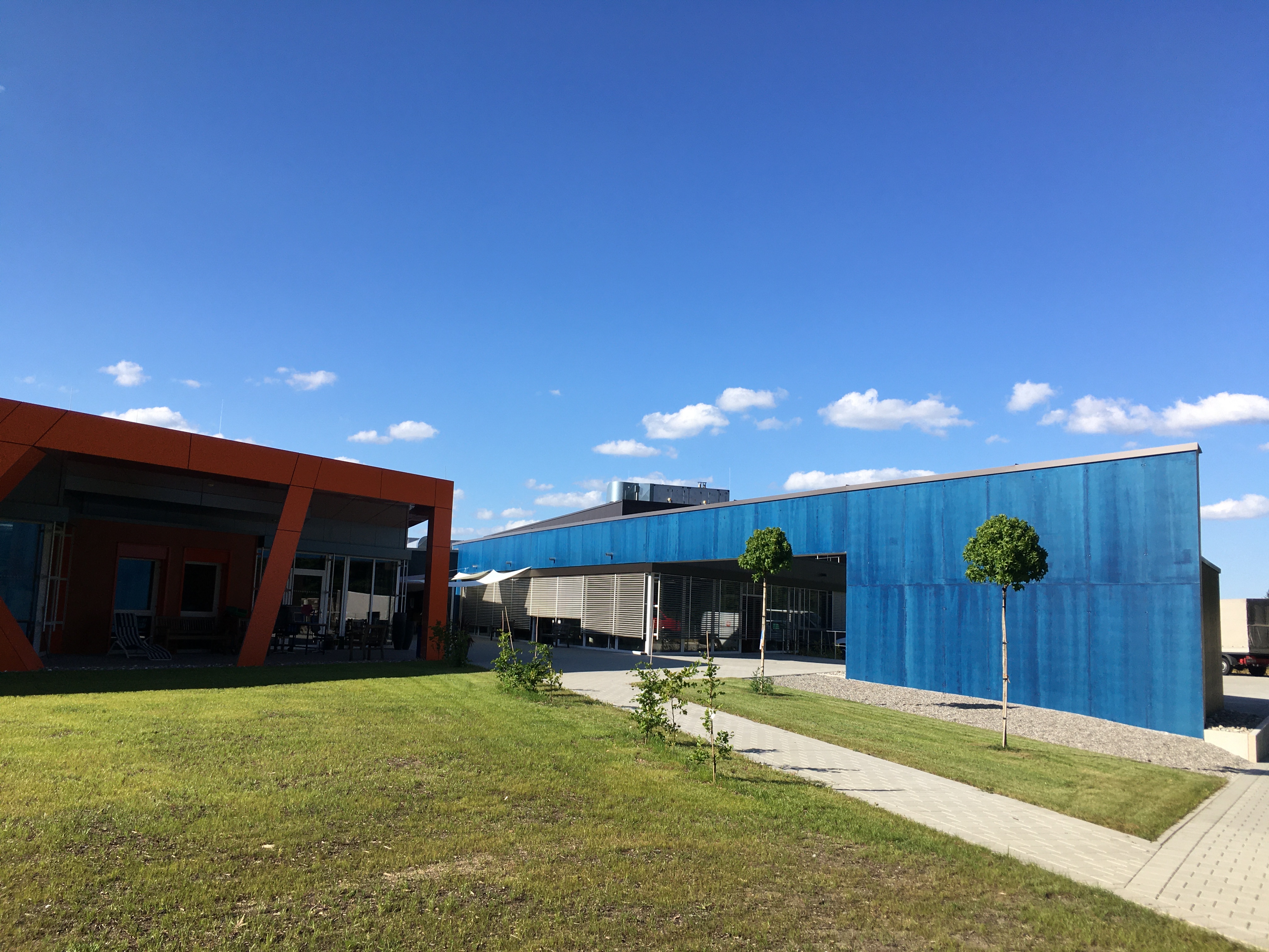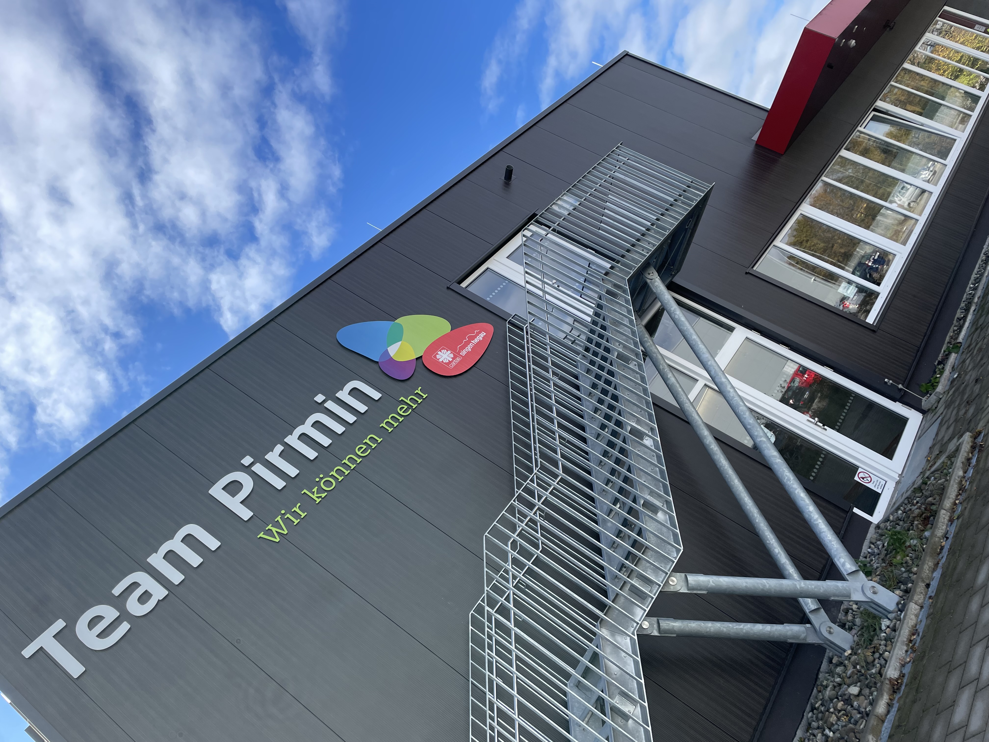 Werkstatt für Menschen mit Behinderung 'Team Pirmin'. 3600,00 m² Nutzfläche. Sichtbetonkonstruktion und Stahlkonstruktion. Farbkonzept mit Betonlasuren in unterschiedlichen Farben. Die Architektur des Gebäudes wird bestimmt durch naturbelassene Materialien und ein klares Farbkonzept.