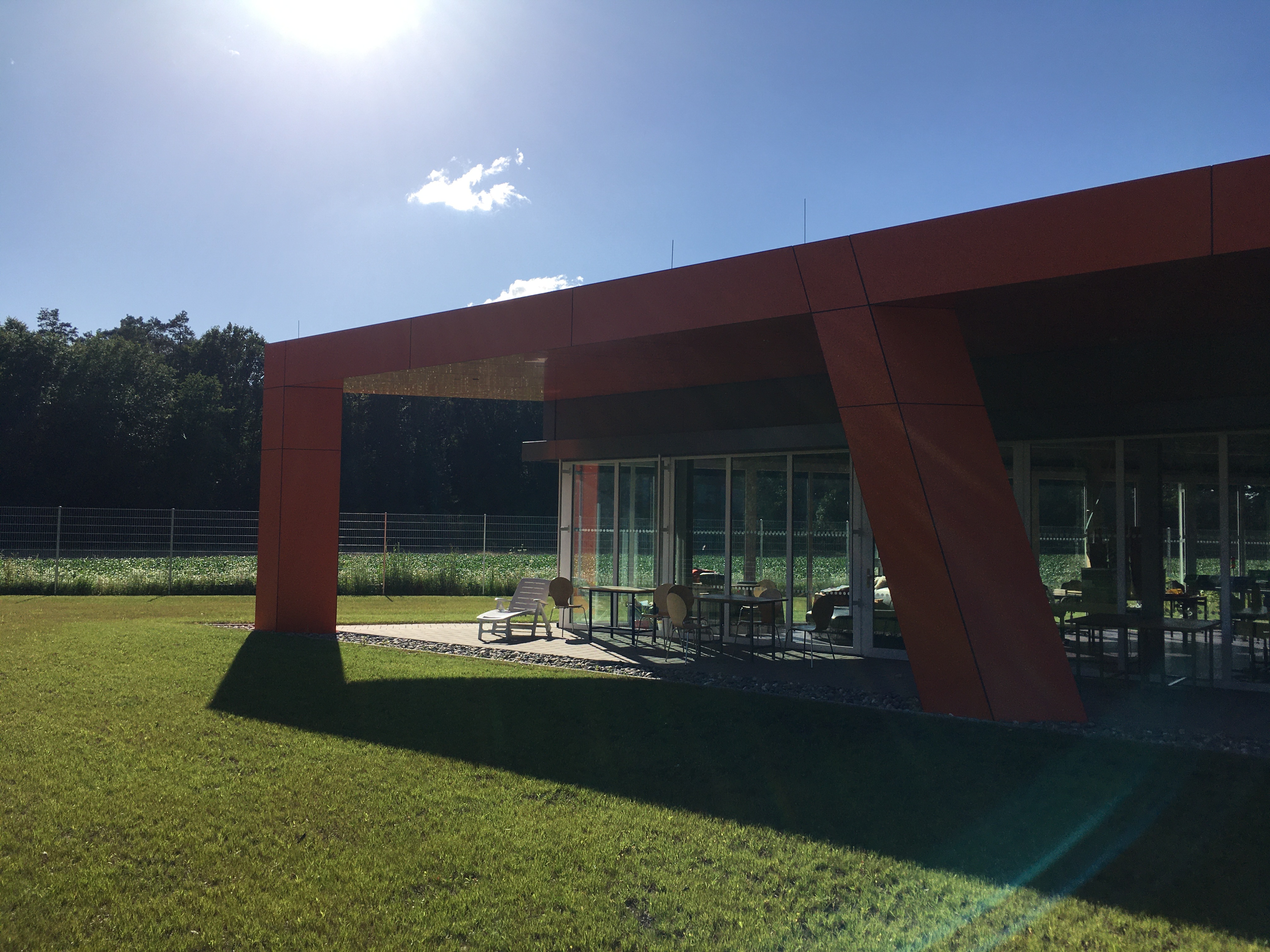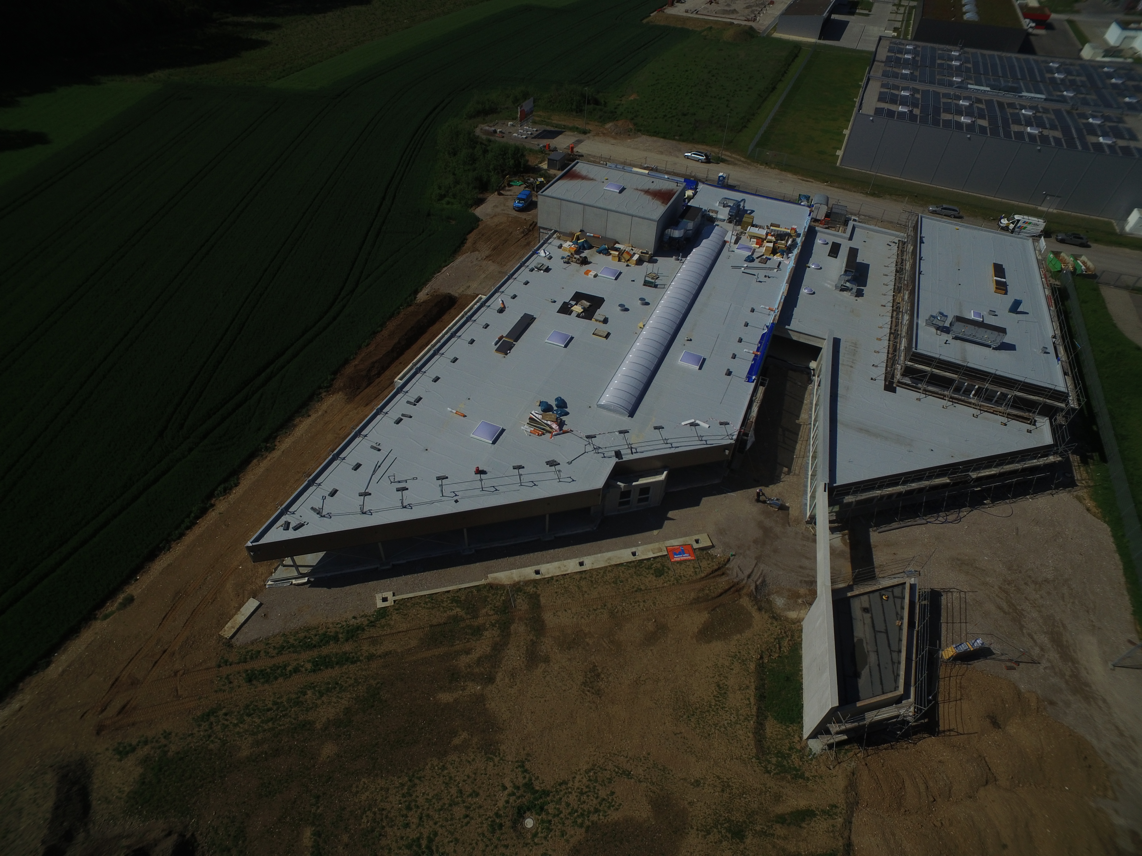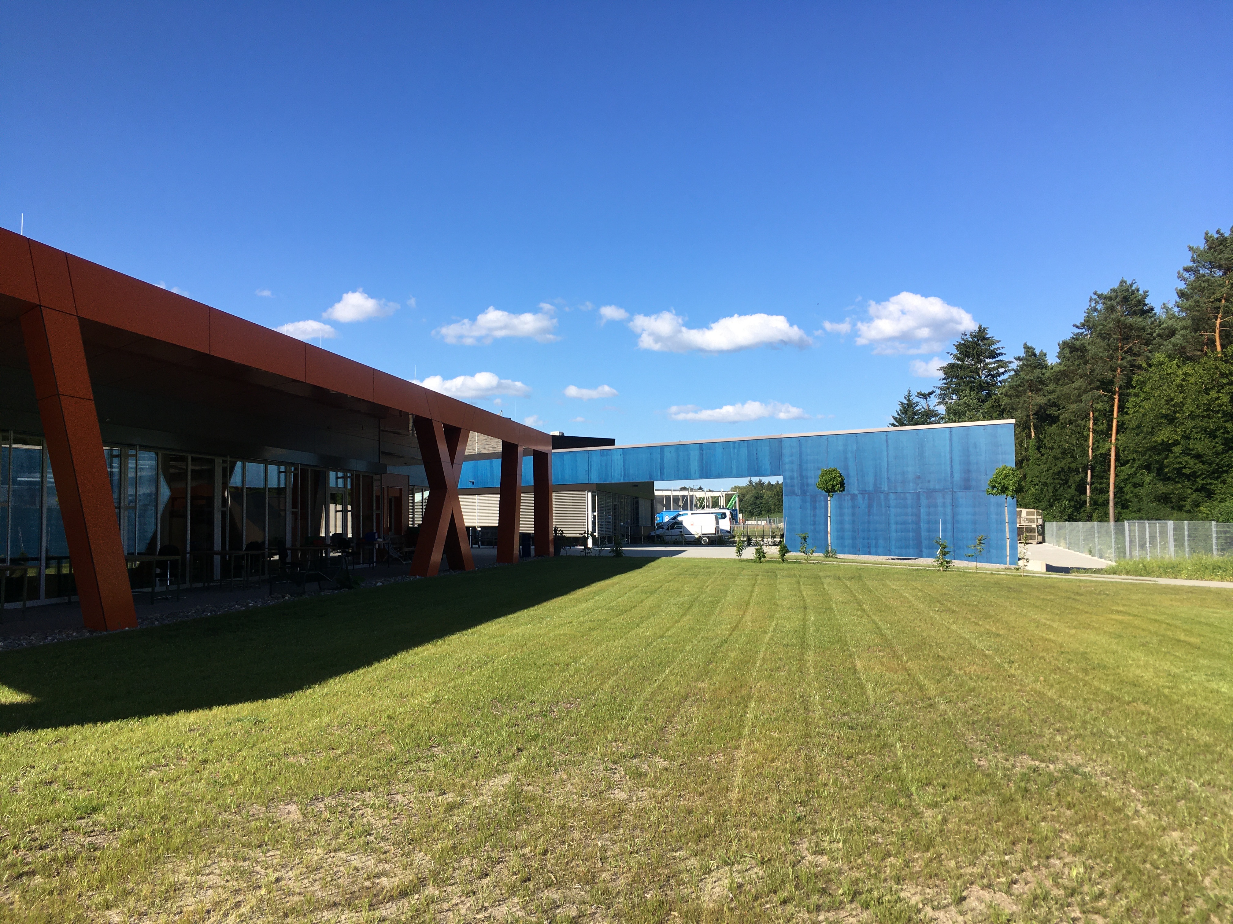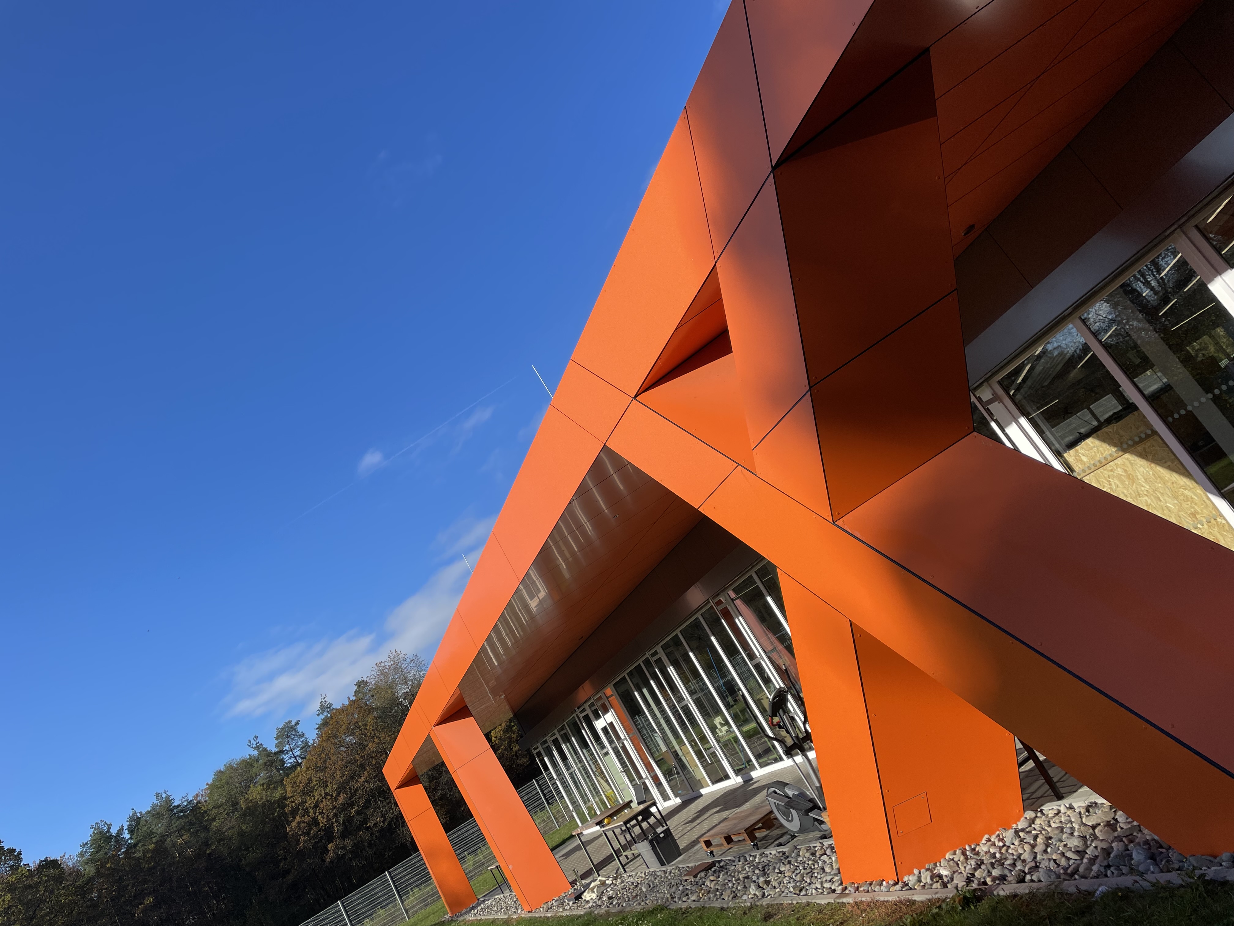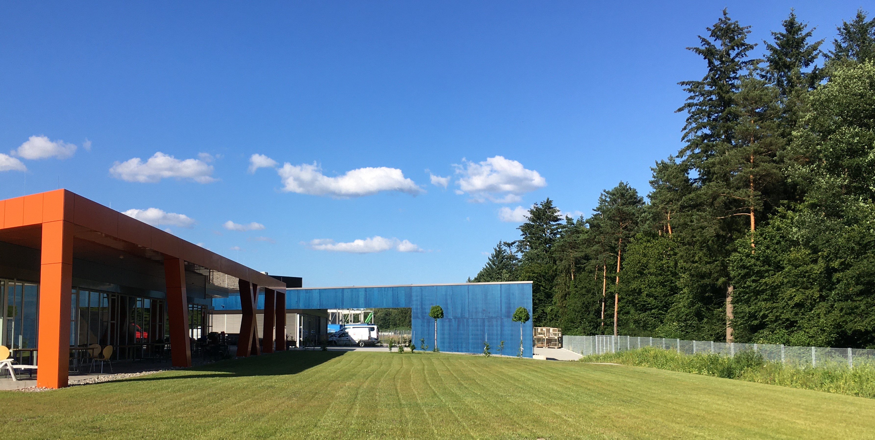Werkstatt für Menschen mit Behinderung 'Team Pirmin'. 3600,00 m² Nutzfläche. Sichtbetonkonstruktion und Stahlkonstruktion. Farbkonzept mit Betonlasuren in unterschiedlichen Farben. Die Architektur des Gebäudes wird bestimmt durch naturbelassene Materialien und ein klares Farbkonzept.