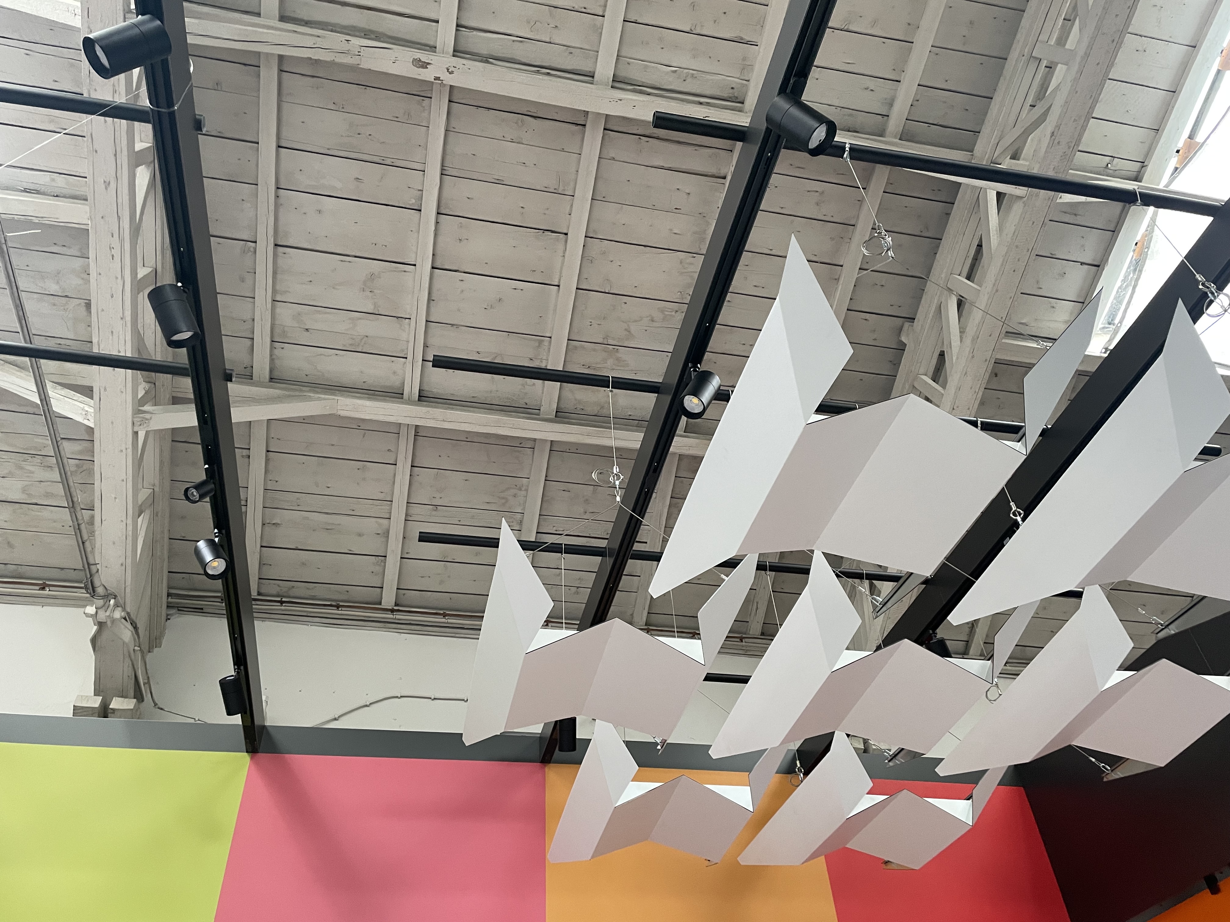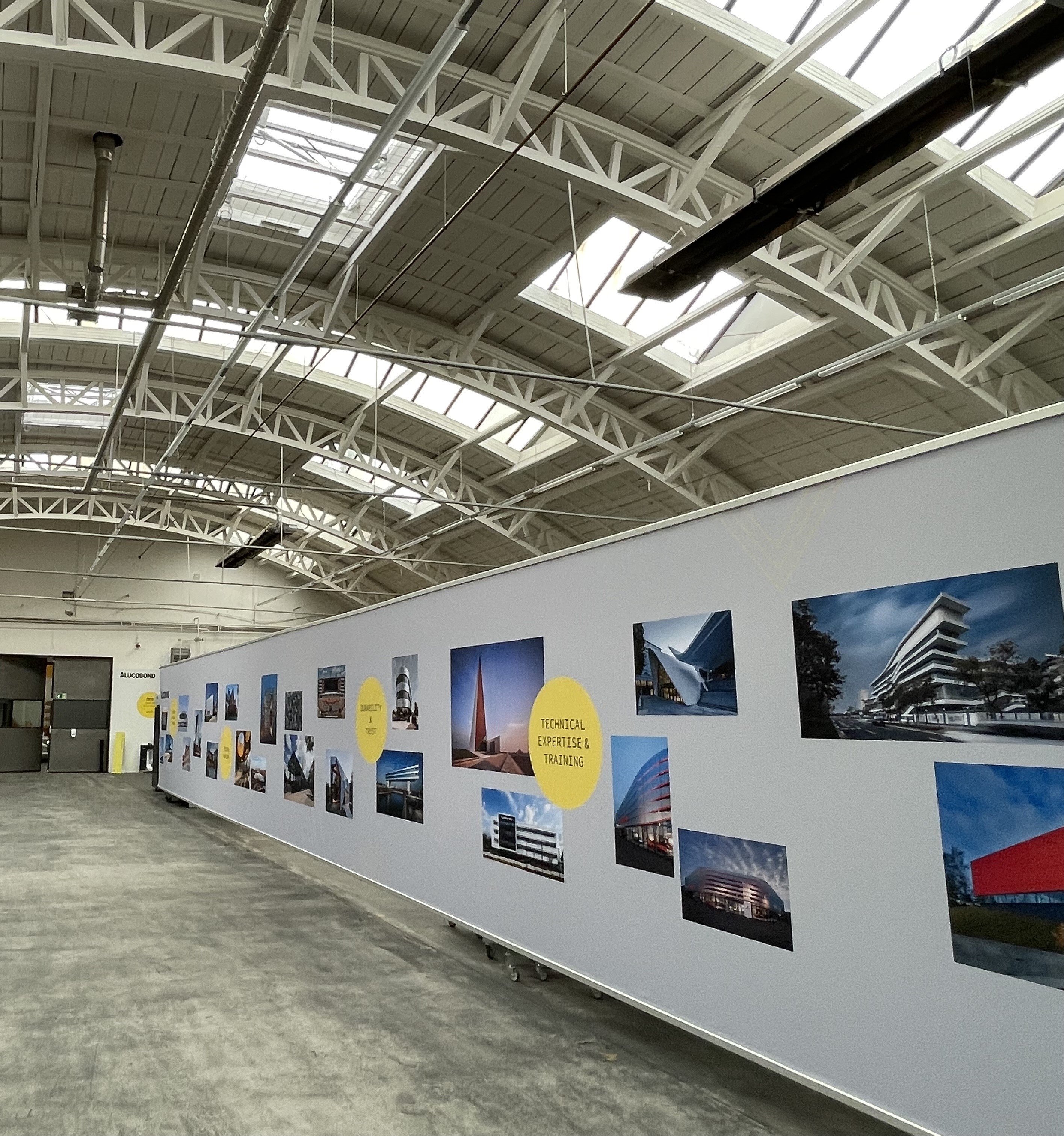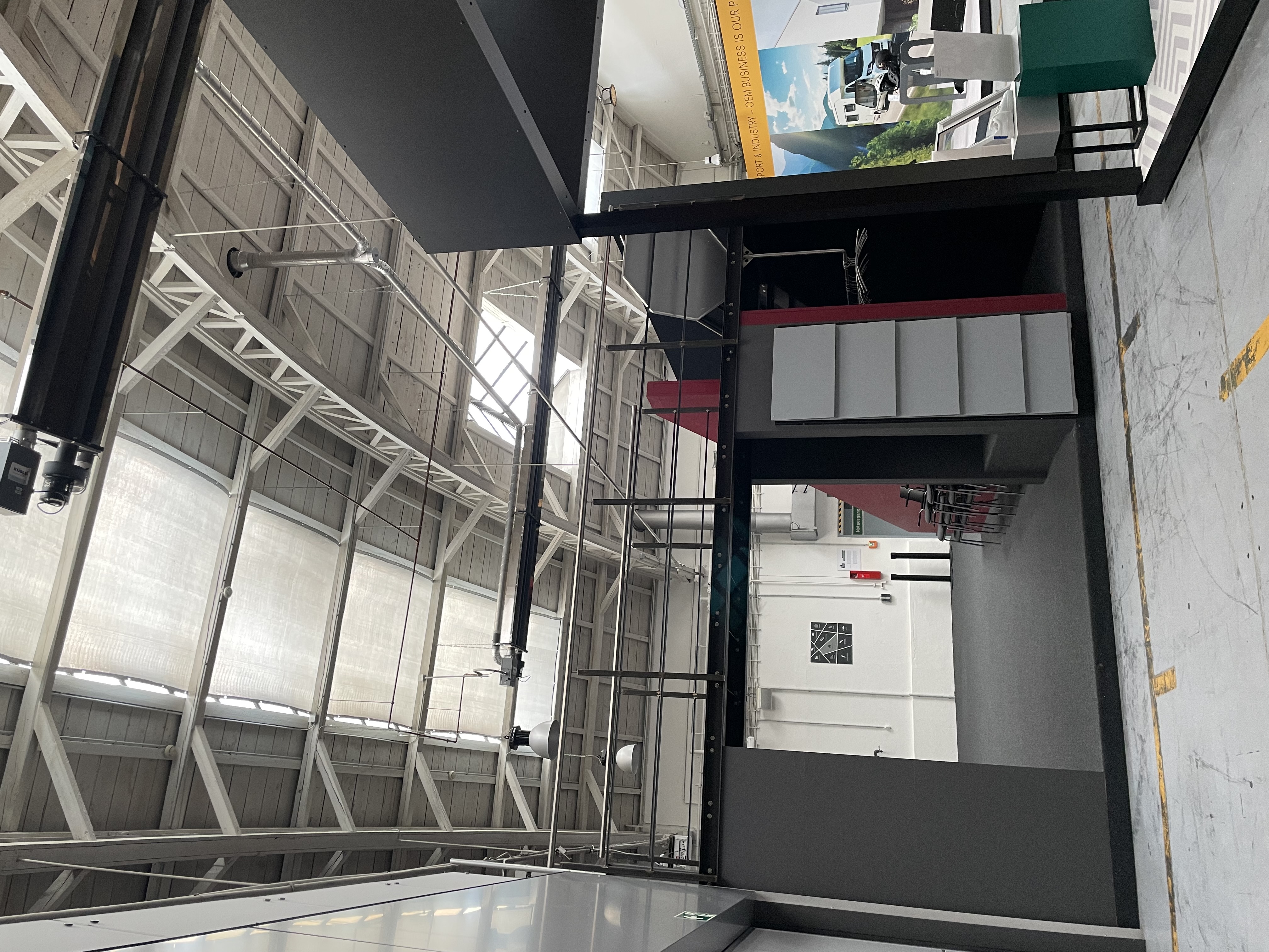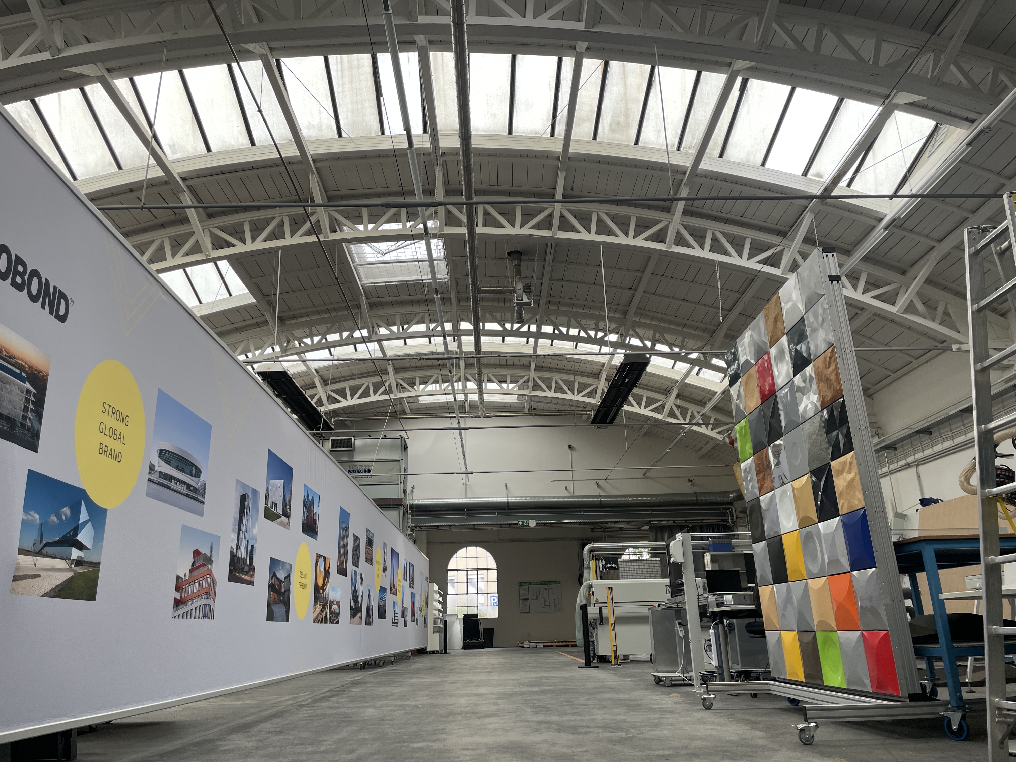 100 jährige Lagerhalle in Singen Neuausrichtung der Architektur einer 100-jährigen Lagerhalle in Singen zu Produktentwicklung und Schulung. Dazu wurde das Hallentragwerk/Holzfachwerk freigelegt, erhalten und mit einem neuen Anstrich versehen. Die Wände wurden nicht überarbeitet sondern ebenfalls „nur“ gestrichen der 100-jährige beschichtete Betonestrich wurde nur gereinigt, somit sind die Gebrauchsspuren erhalten geblieben.