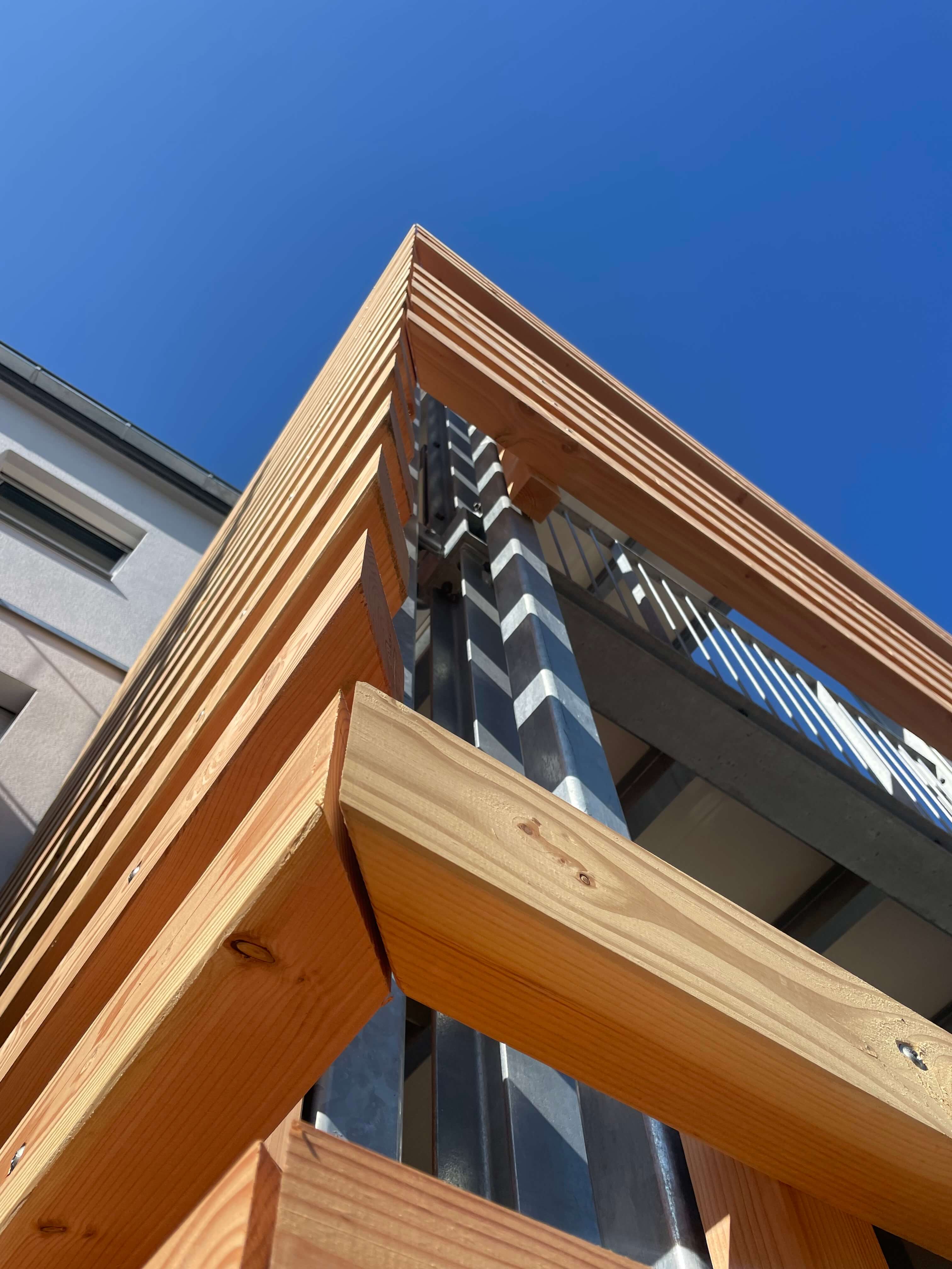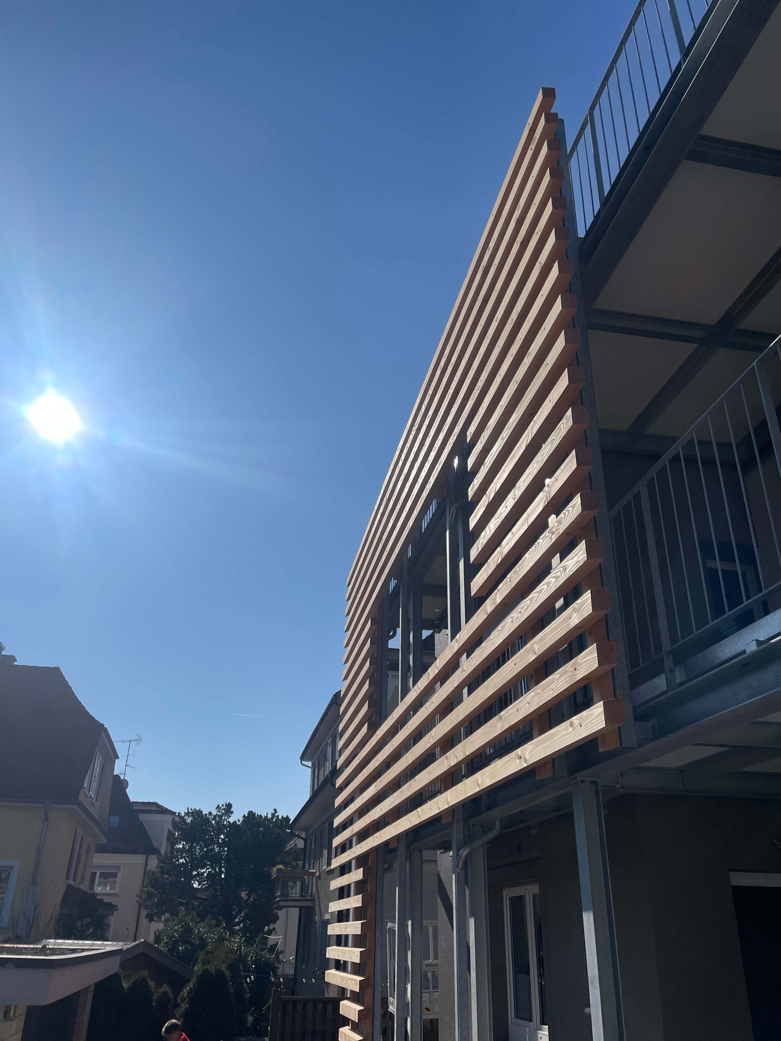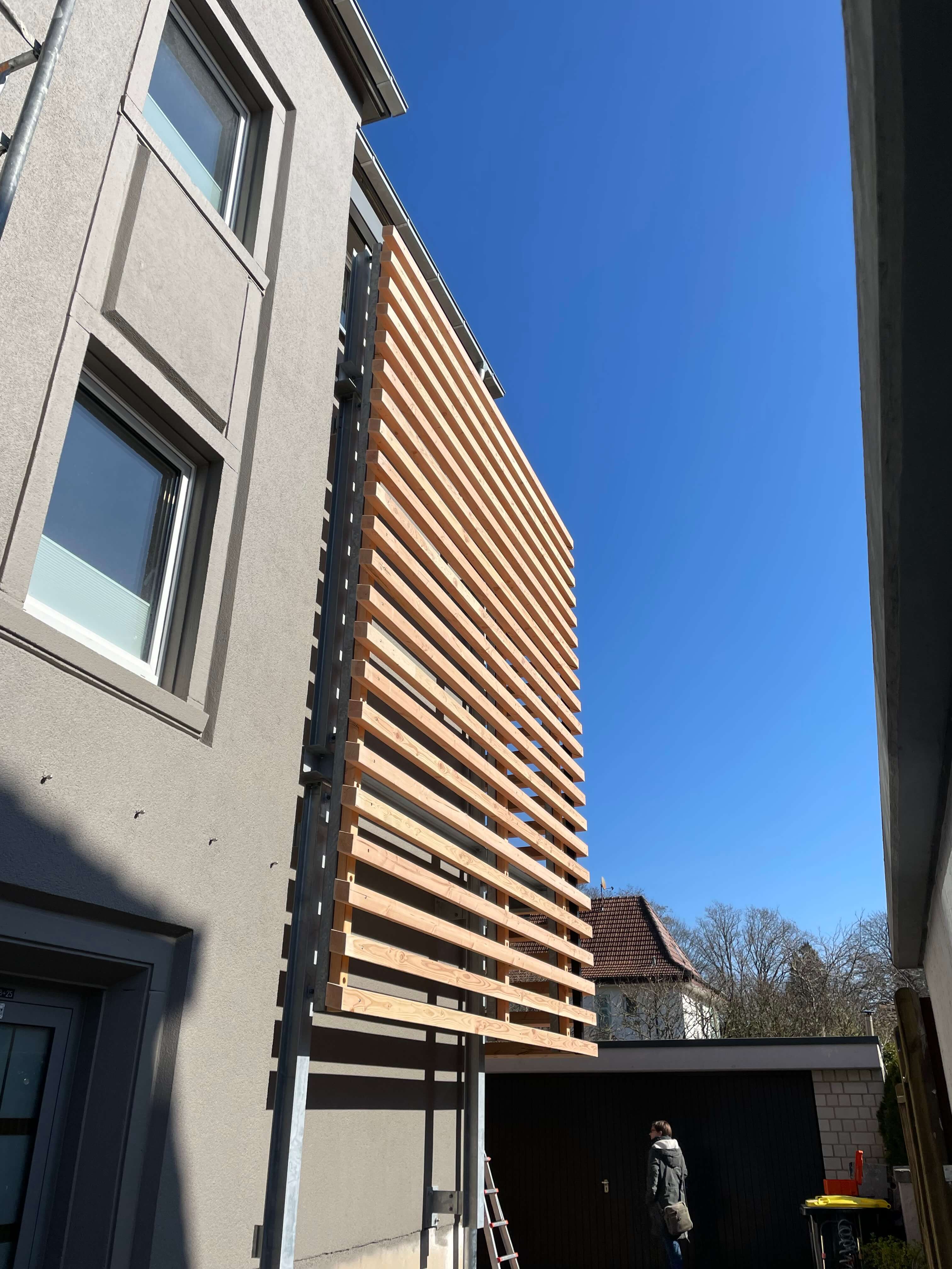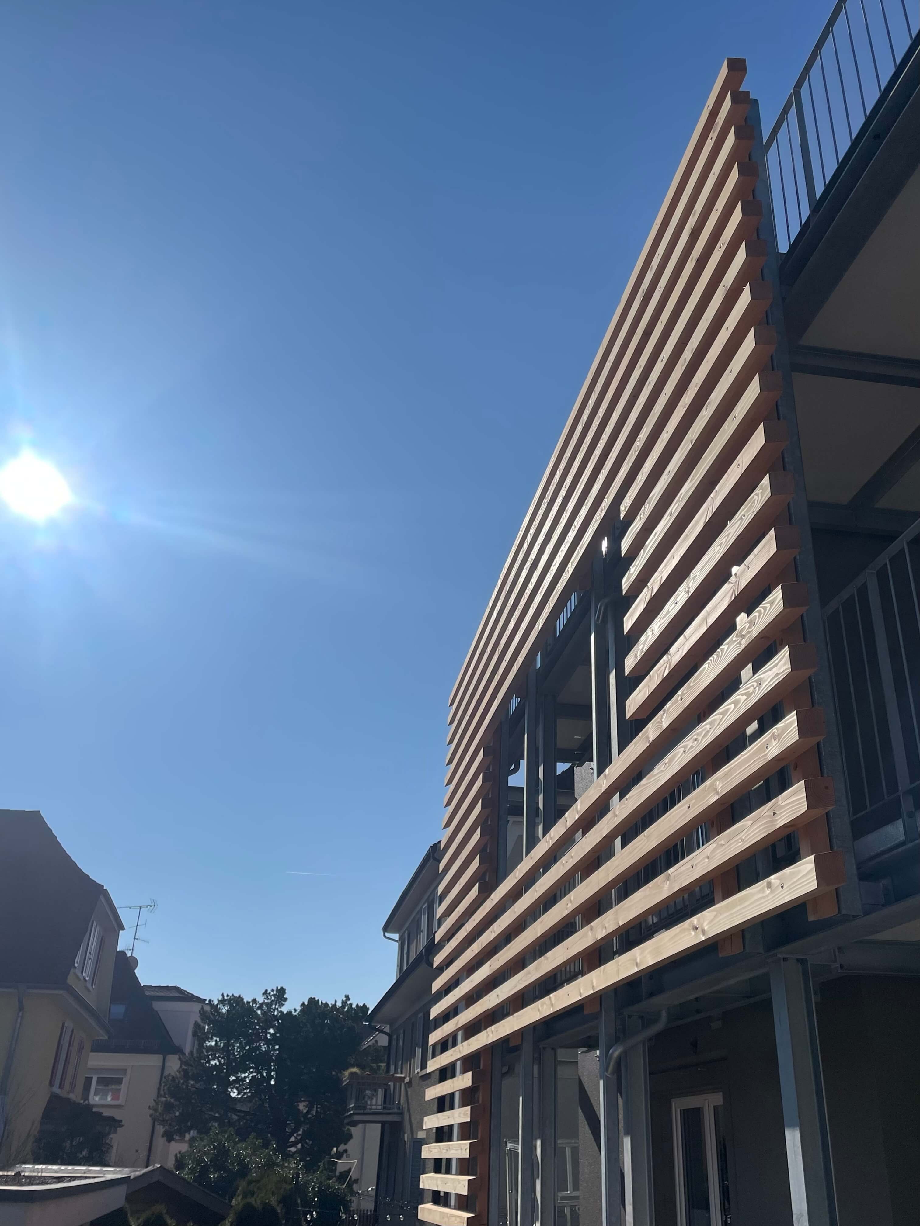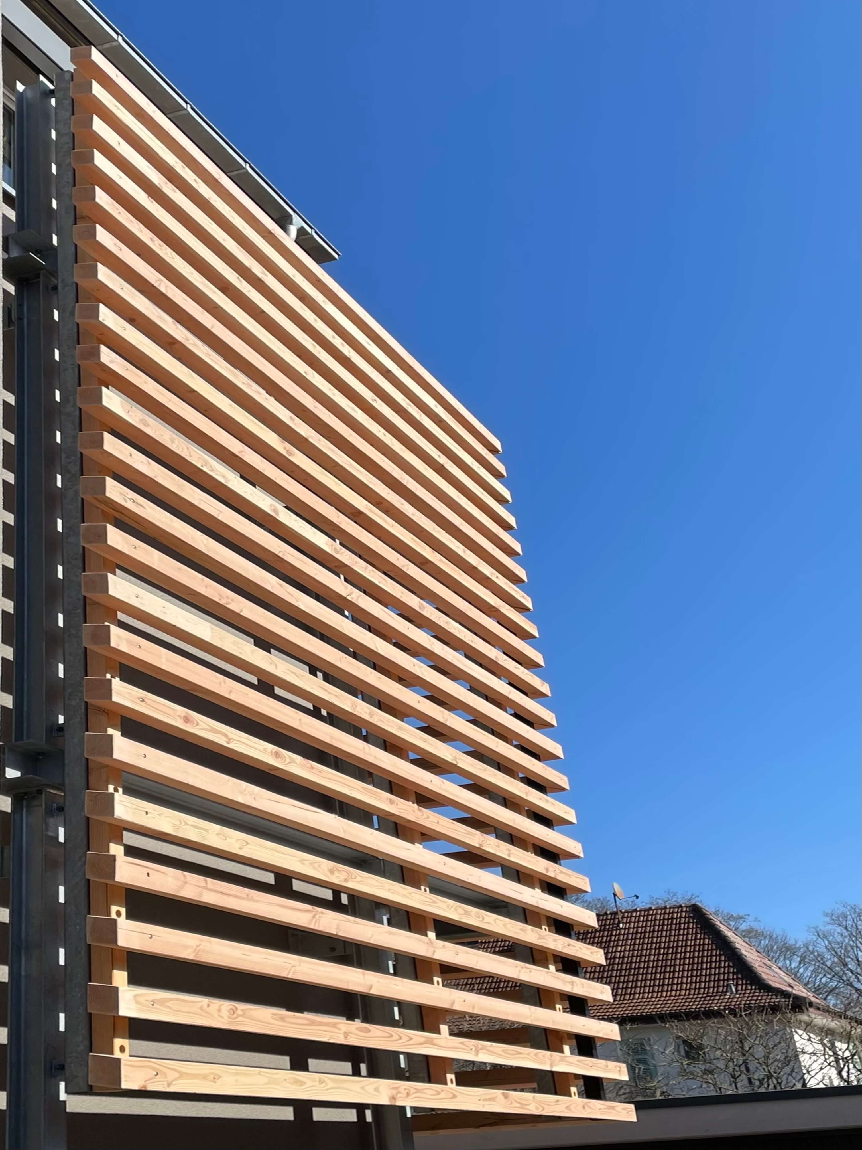 Sanierung und Erweiterung eines Mehrfamilienwohnhauses. Balkonanlage auf der Gartenseite in Stahl-Holz-Konstruktion. Das Holz dient hier als Sichtschutz und Rankhilfe für die Bepflanzung