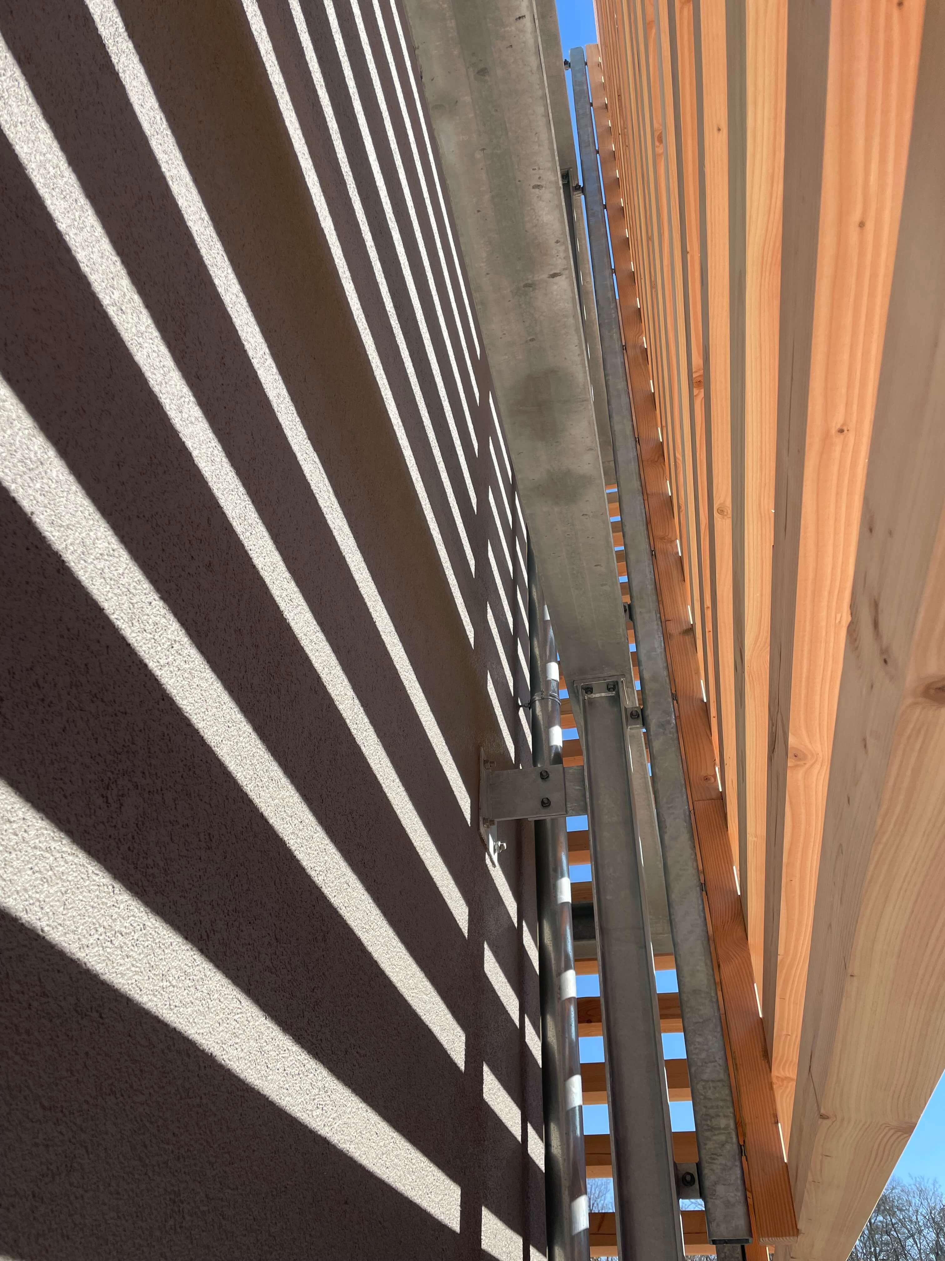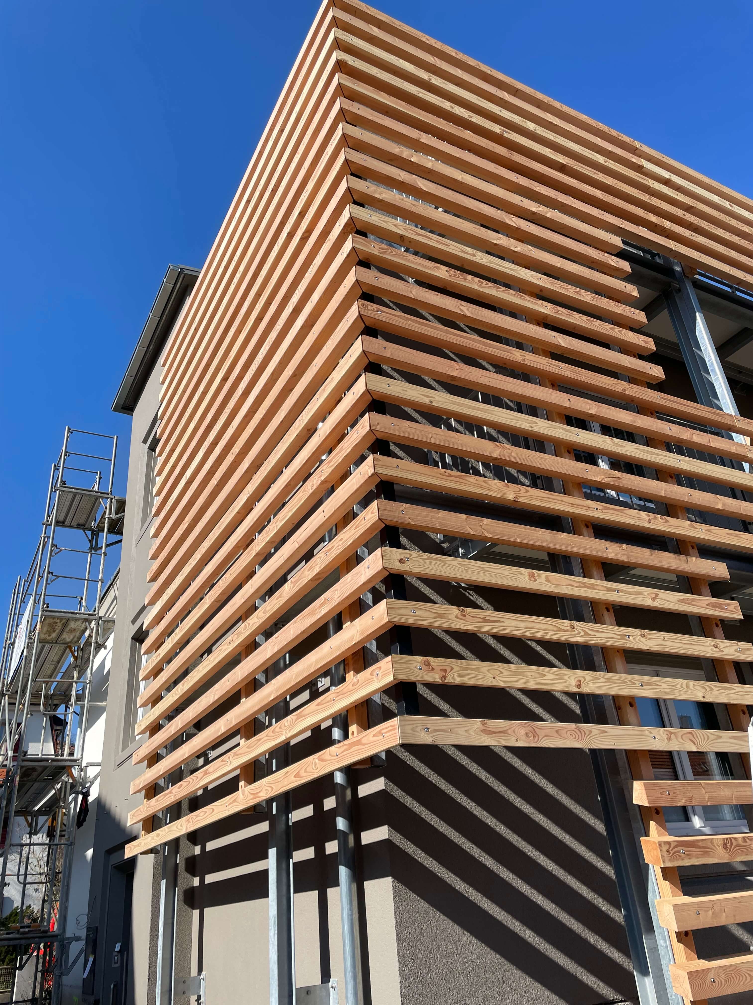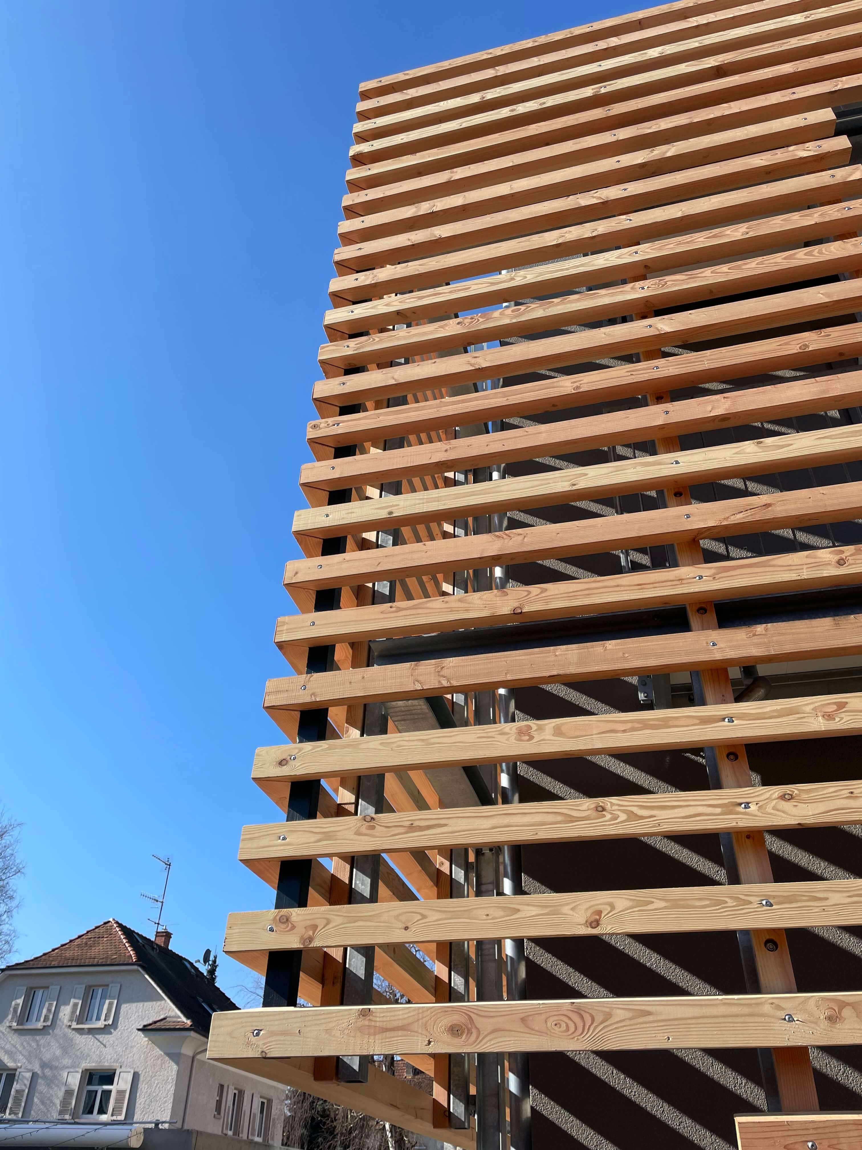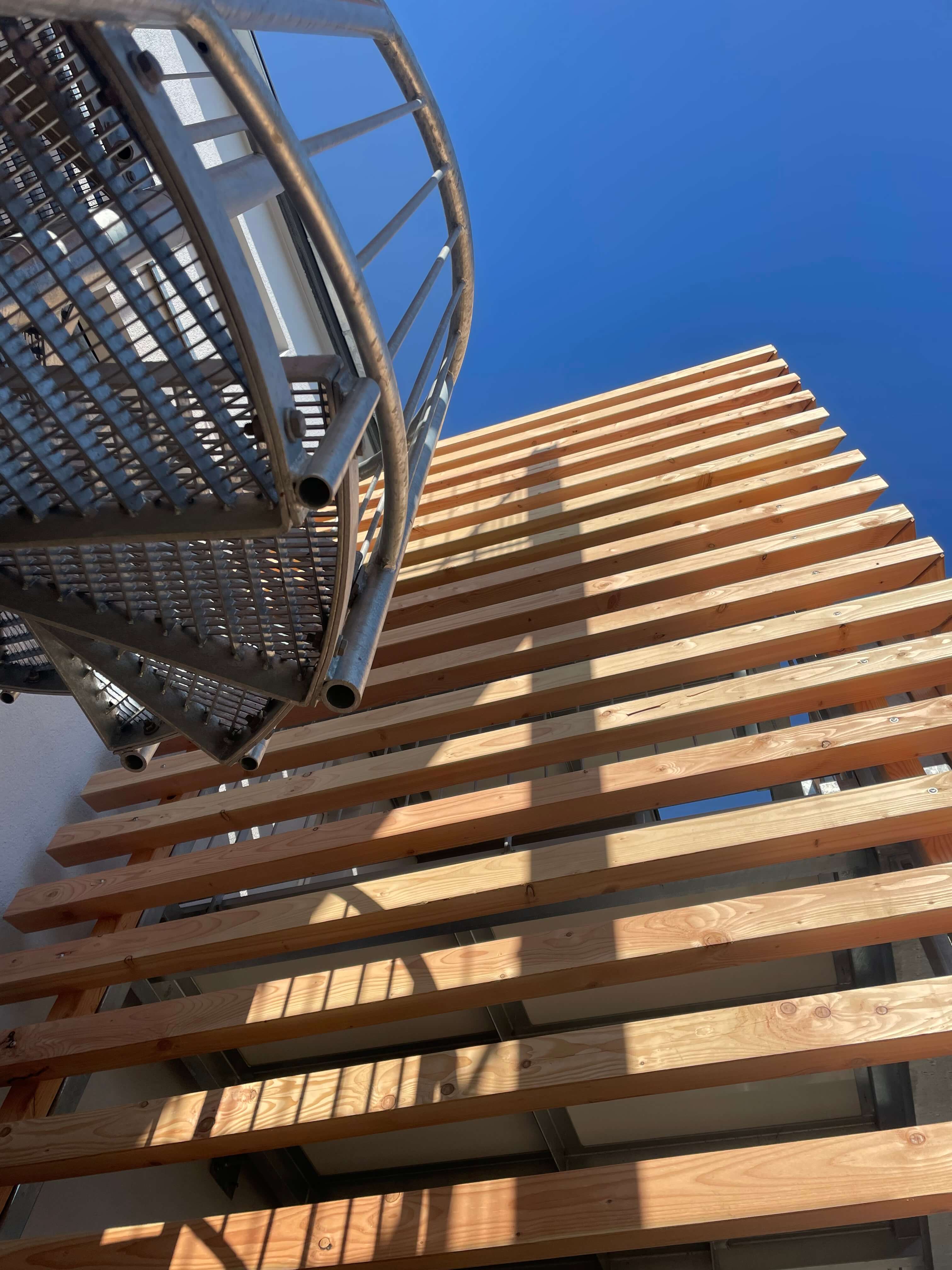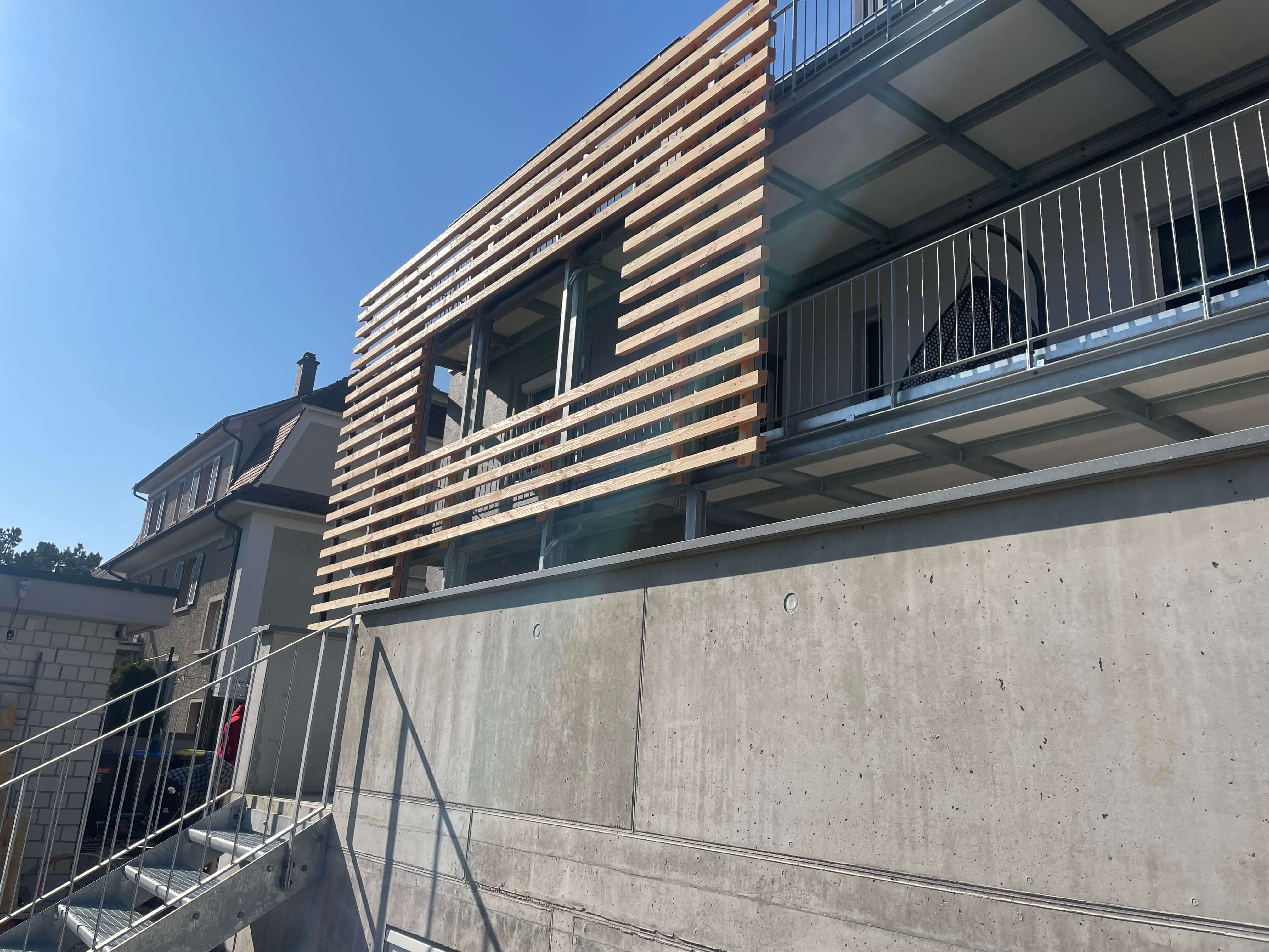Sanierung und Erweiterung eines Mehrfamilienwohnhauses. Balkonanlage auf der Gartenseite in Stahl-Holz-Konstruktion. Das Holz dient hier als Sichtschutz und Rankhilfe für die Bepflanzung