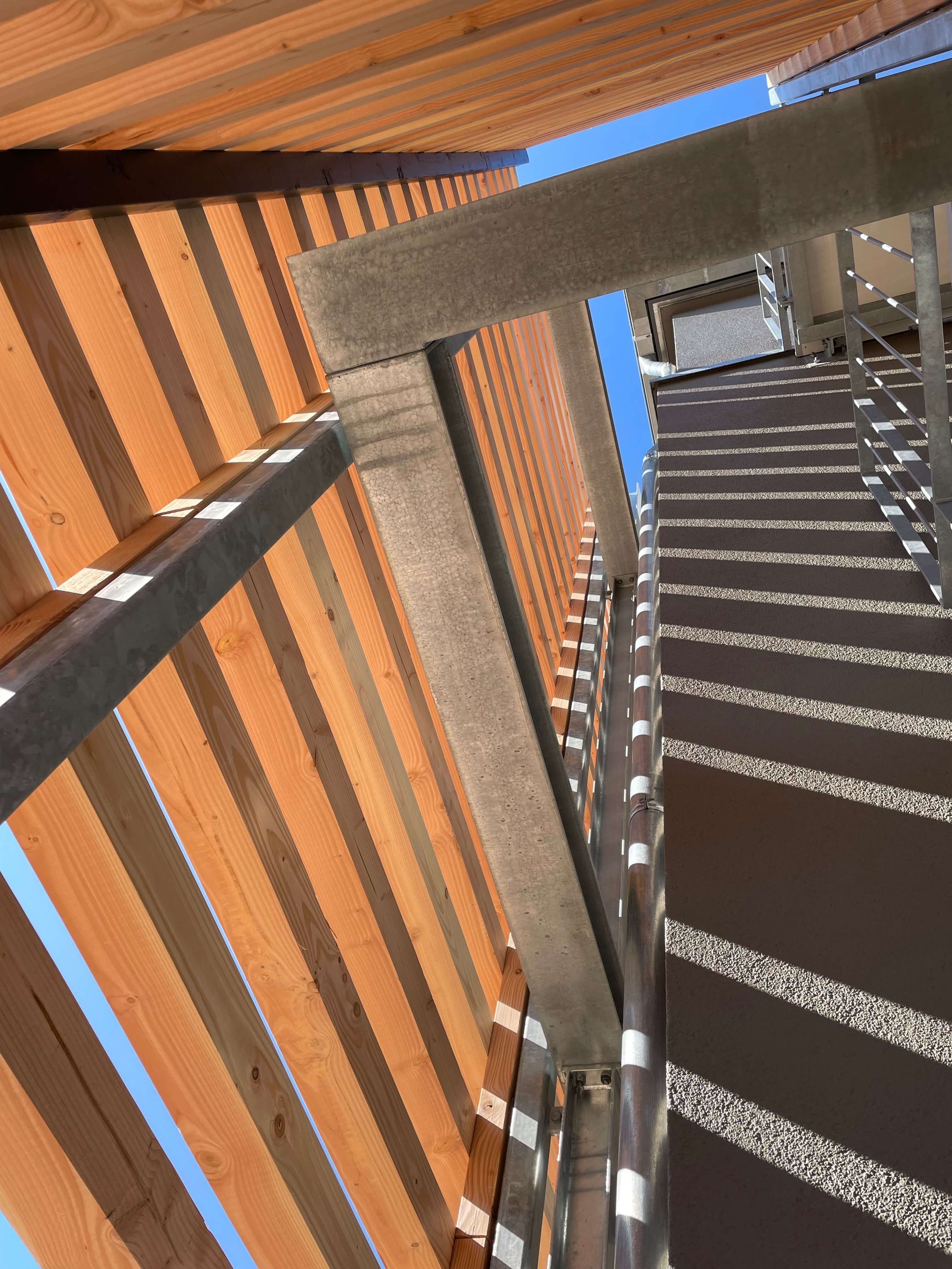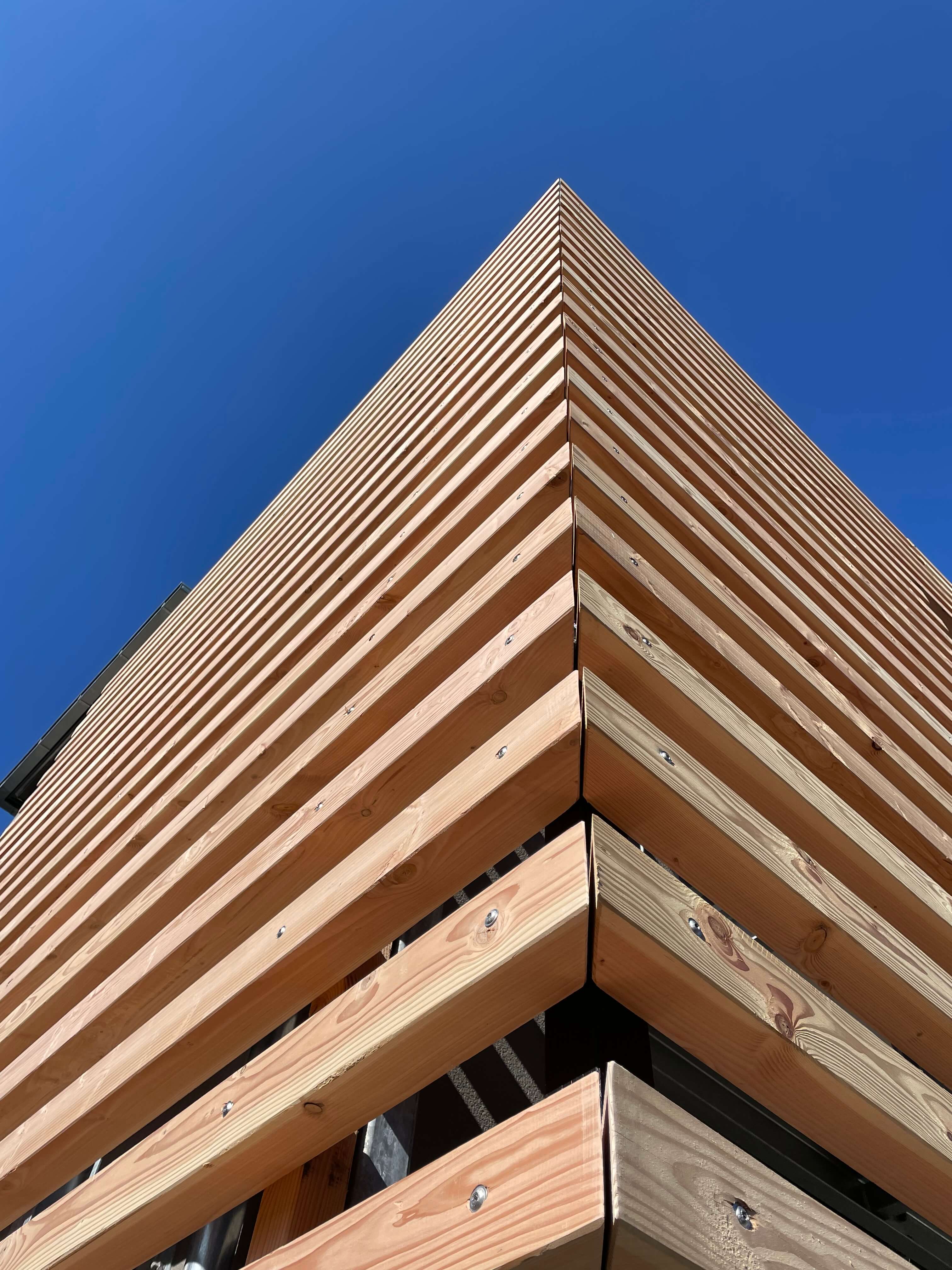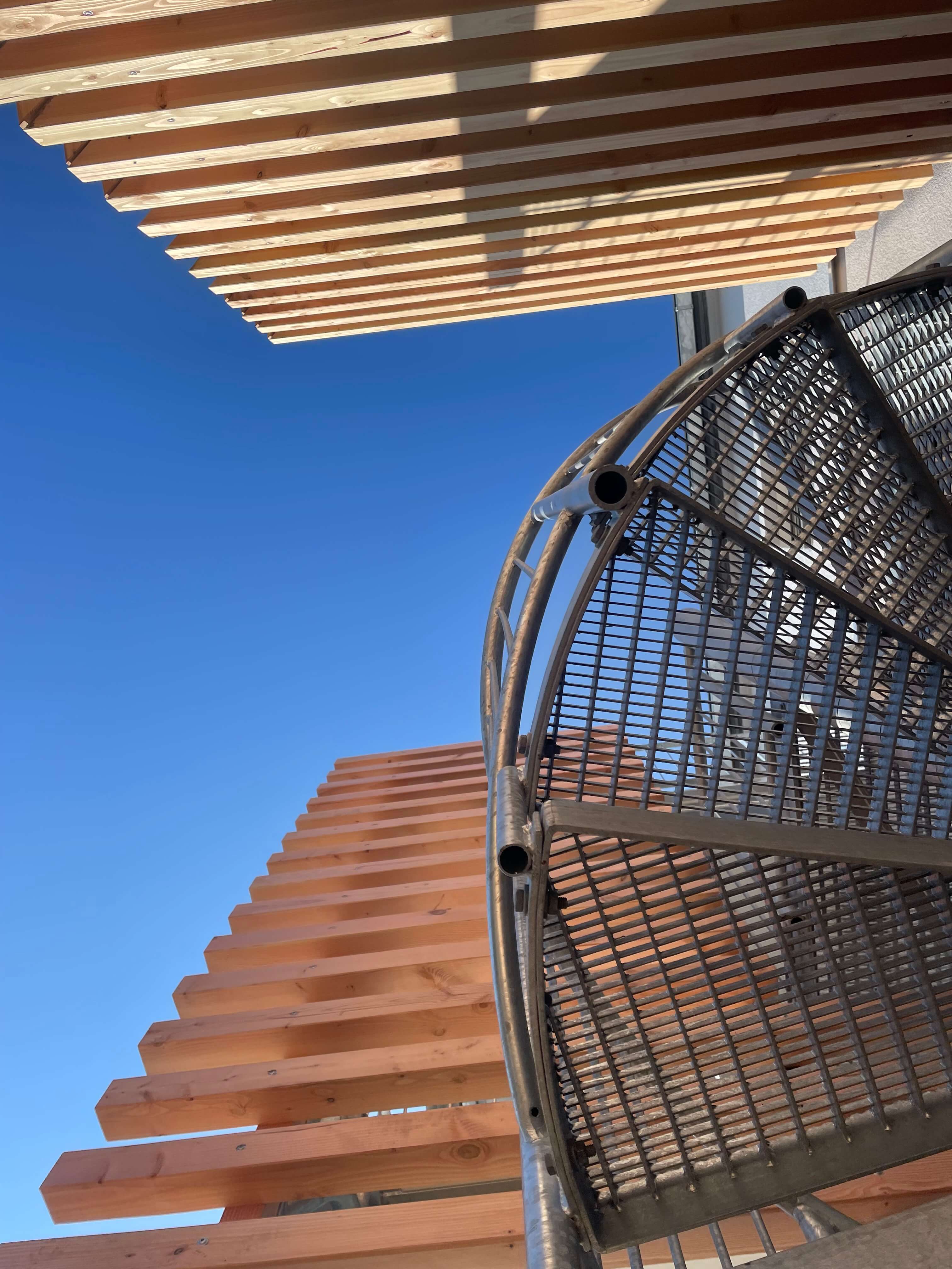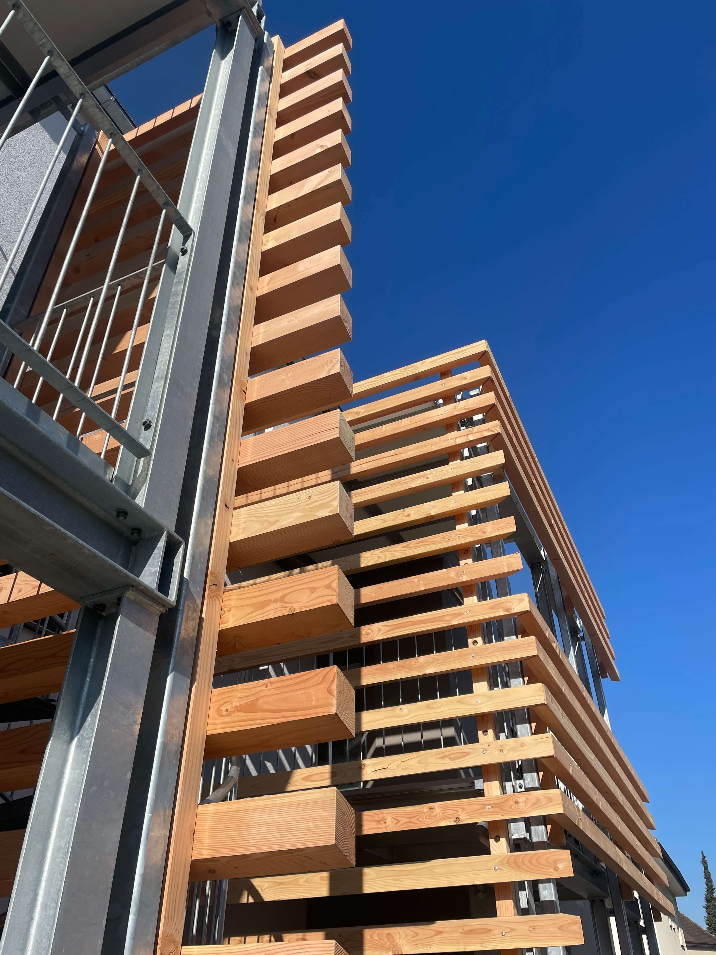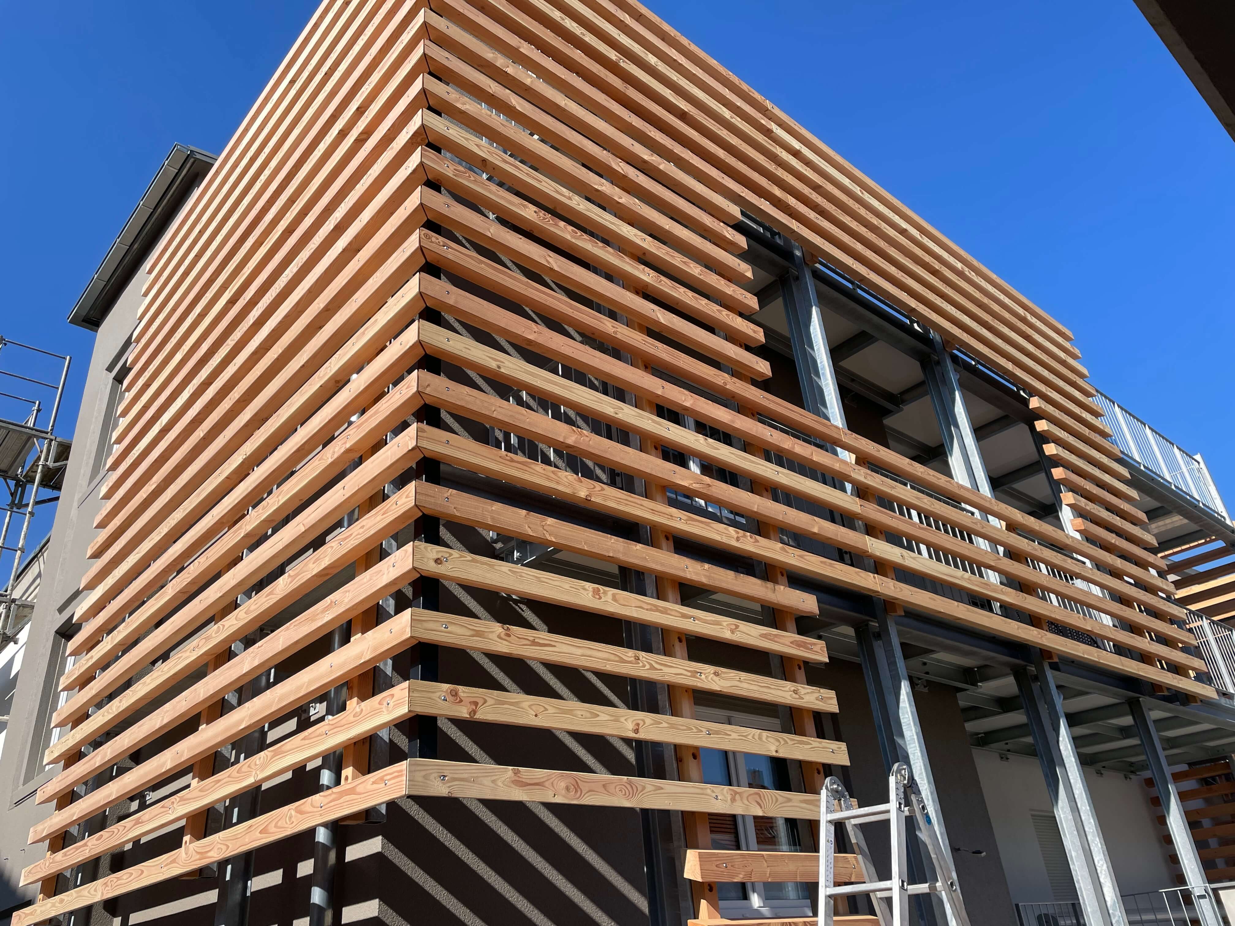 Sanierung und Erweiterung eines Mehrfamilienwohnhauses. Balkonanlage auf der Gartenseite in Stahl-Holz-Konstruktion. Das Holz dient hier als Sichtschutz und Rankhilfe für die Bepflanzung