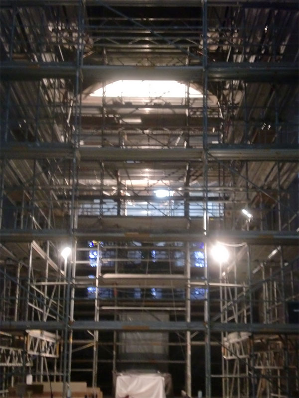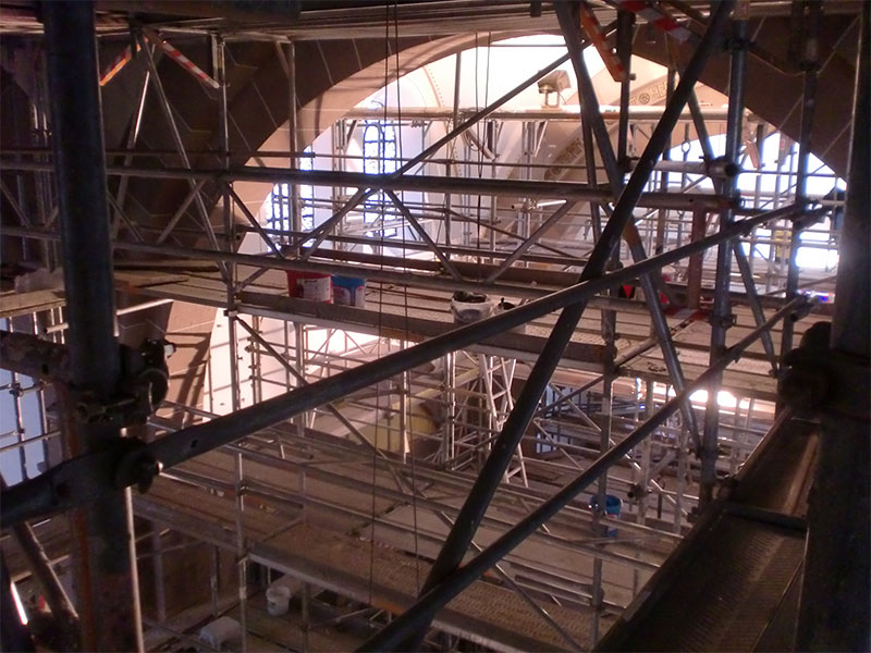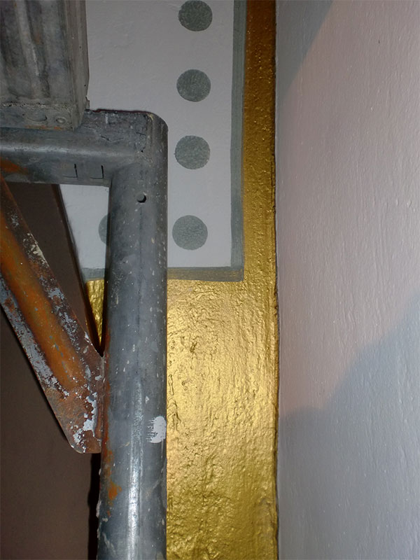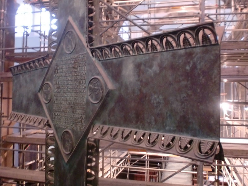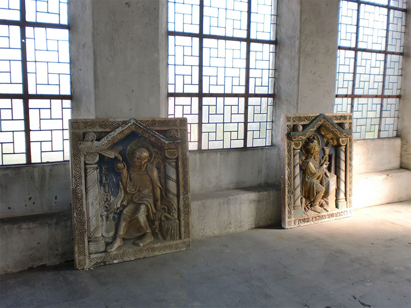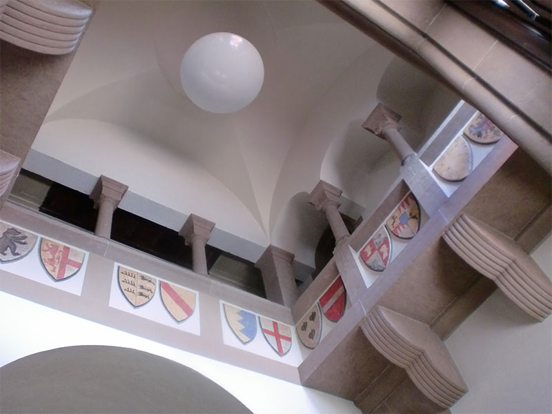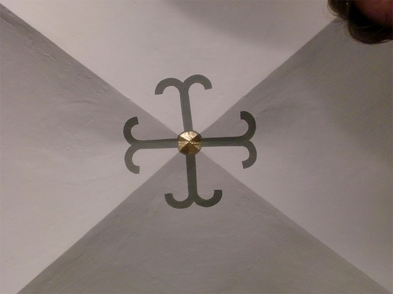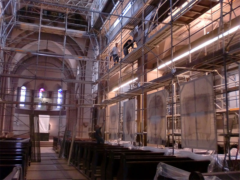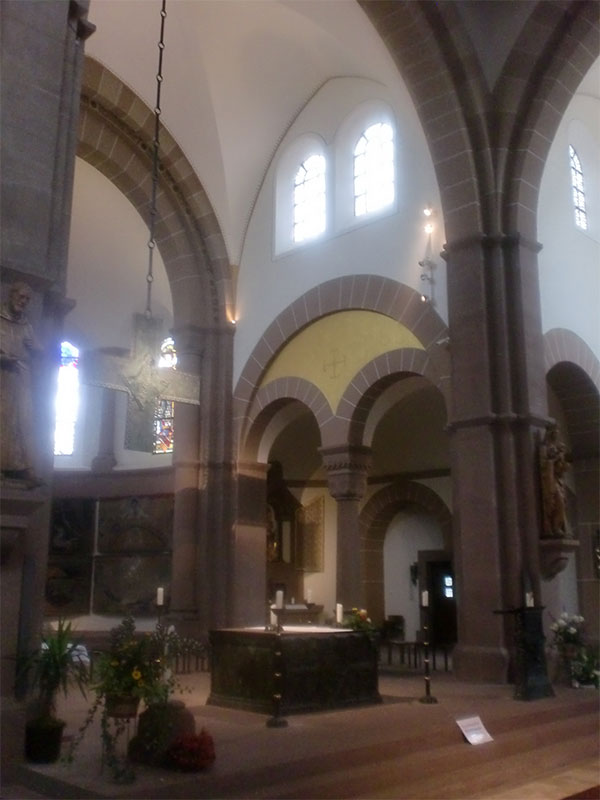 Sanierung der Raumschale der neoromanischen Herz-Jesu-Kirche in Singen. Unsere Planung umfasste nicht nur die Innenarchitektur sondern auch den Vorplatz mit dem Labyrinth. Das Zentrum des Labyrinths bildet ein Ankerkreuz, welches sich im Inneren der Kirche an der Decke und rechts und links des Chores in der Goldfläche wiederholt.