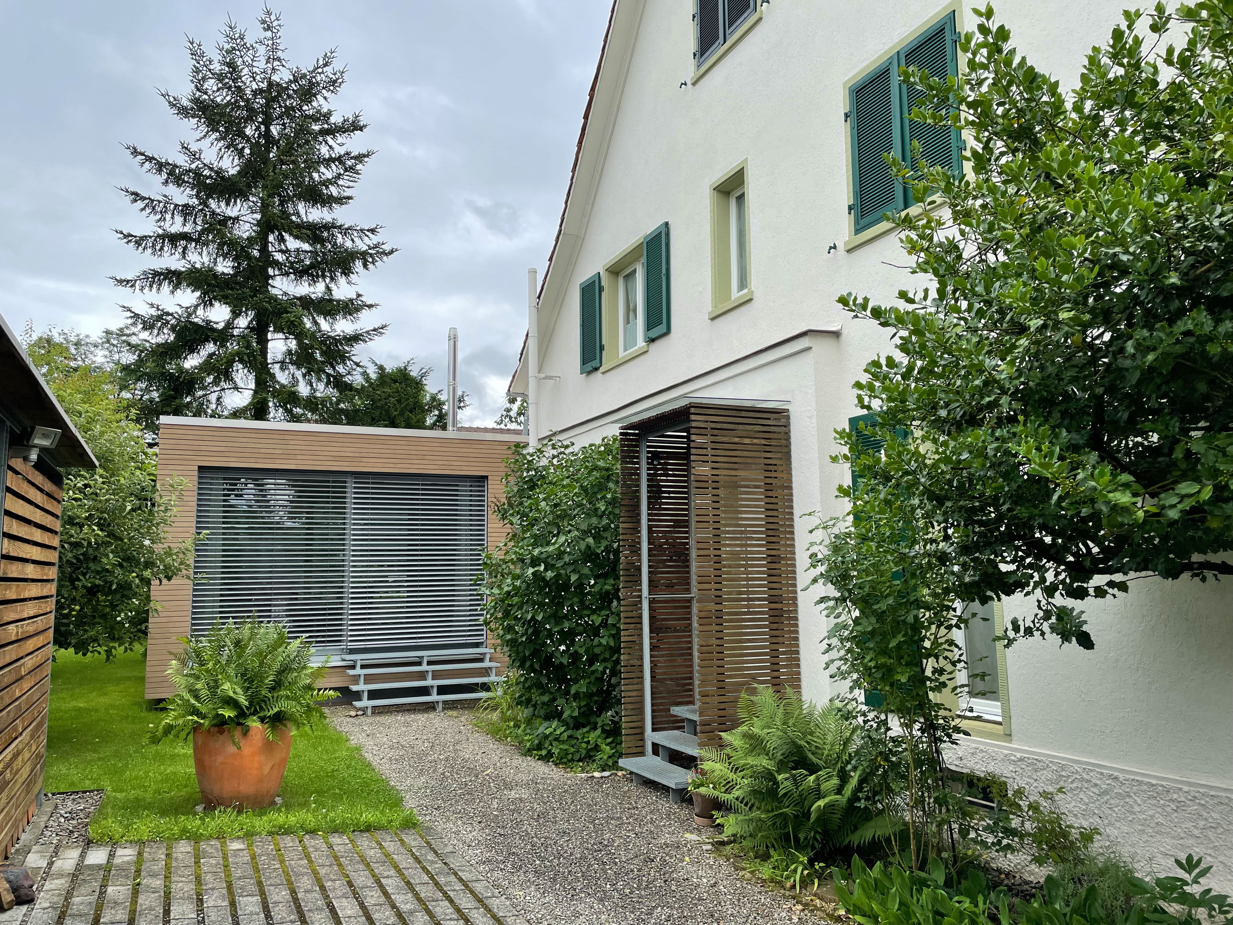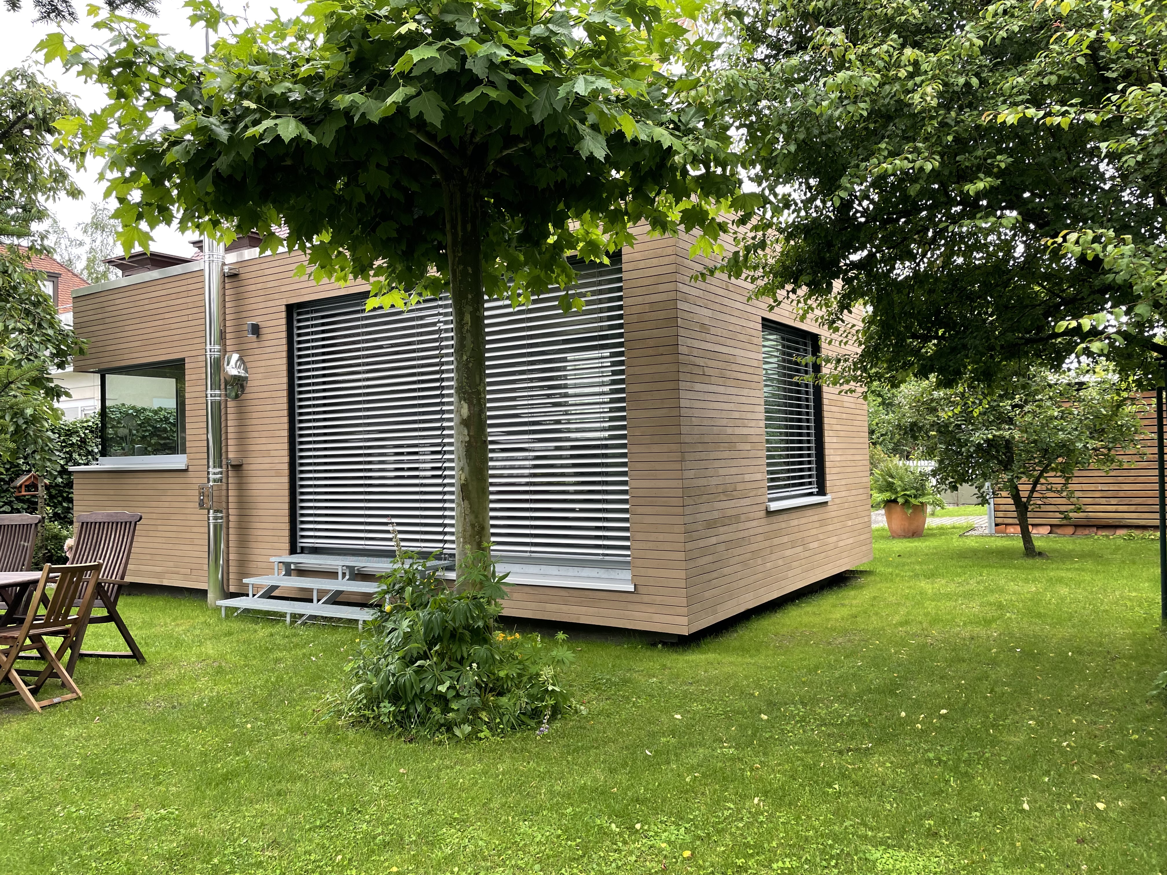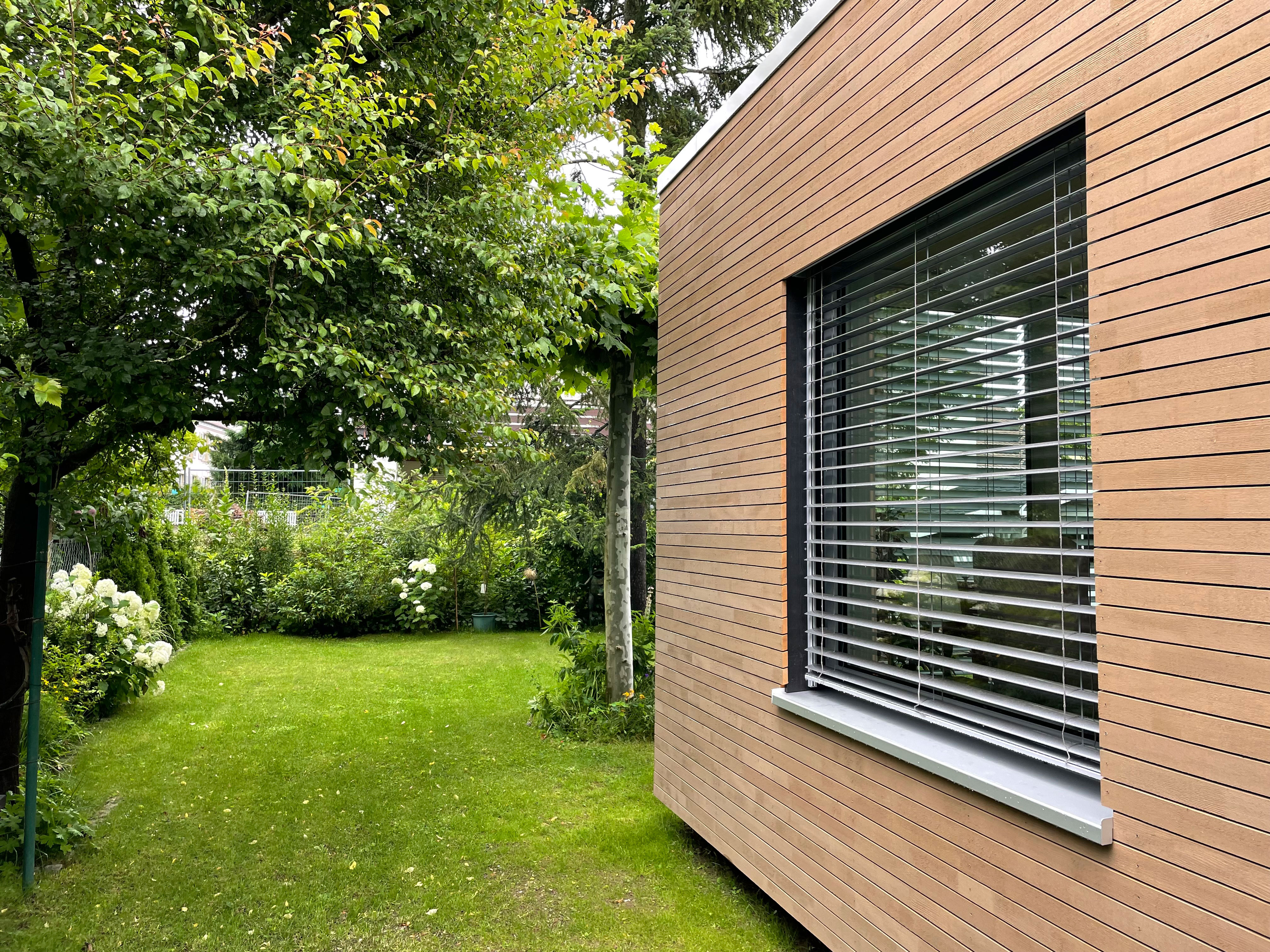 Erweiterung eines bestehenden Wohnhauses durch ein Garten- / Wohnzimmer. Holzkonstruktion, Fassade mit Rhombusleisten. Zurückhaltende Holzarchitektur mit direktem Gartenbezug.
