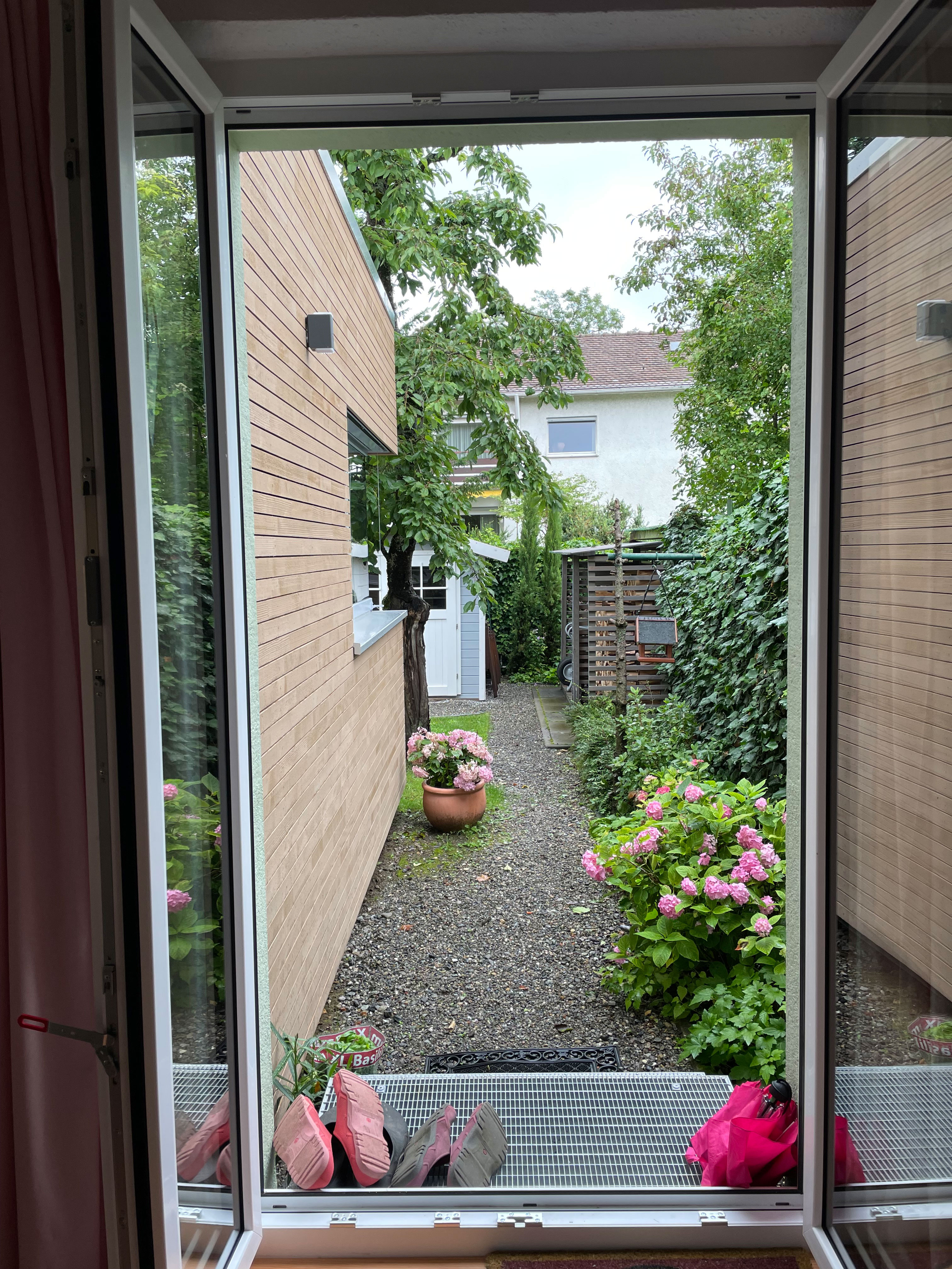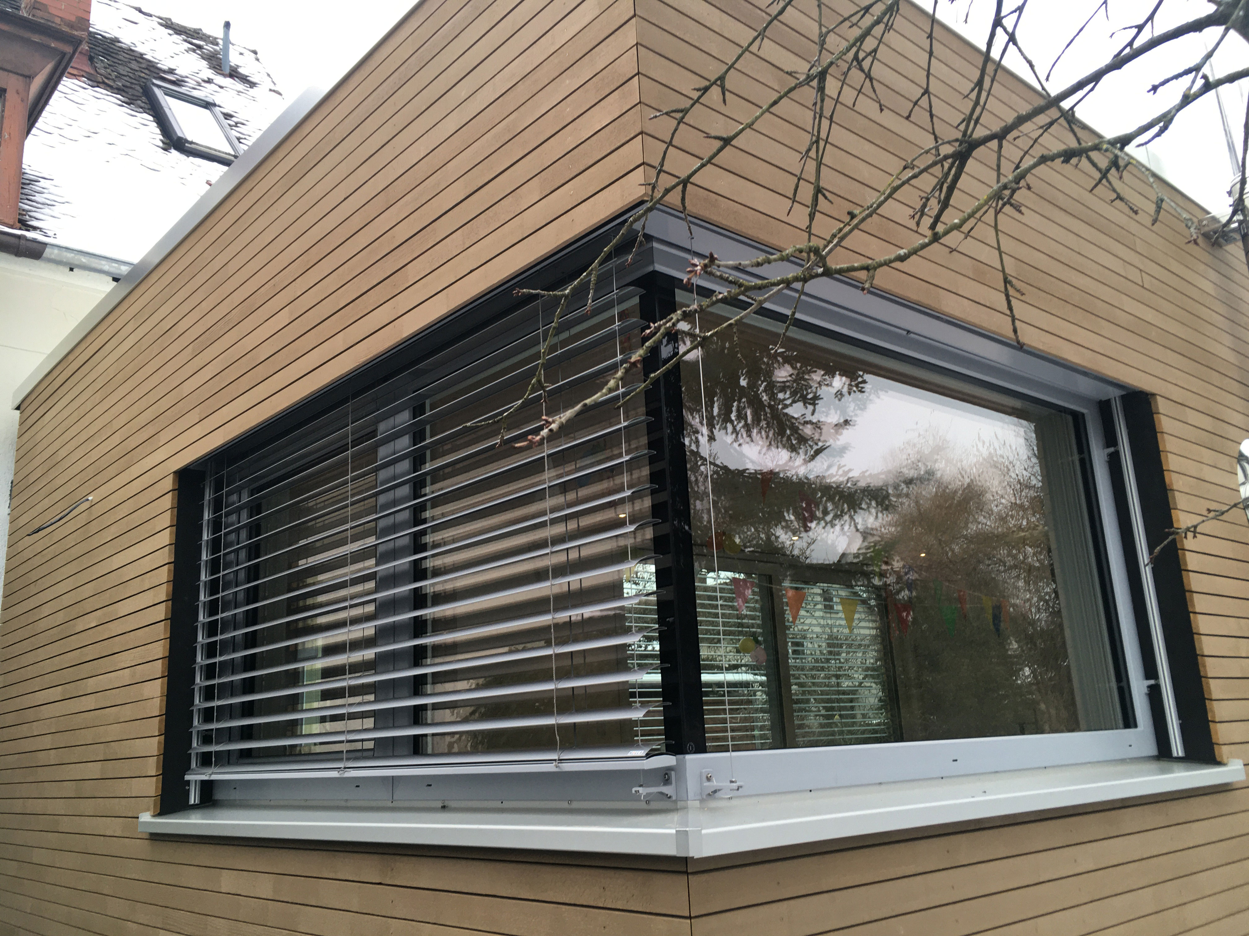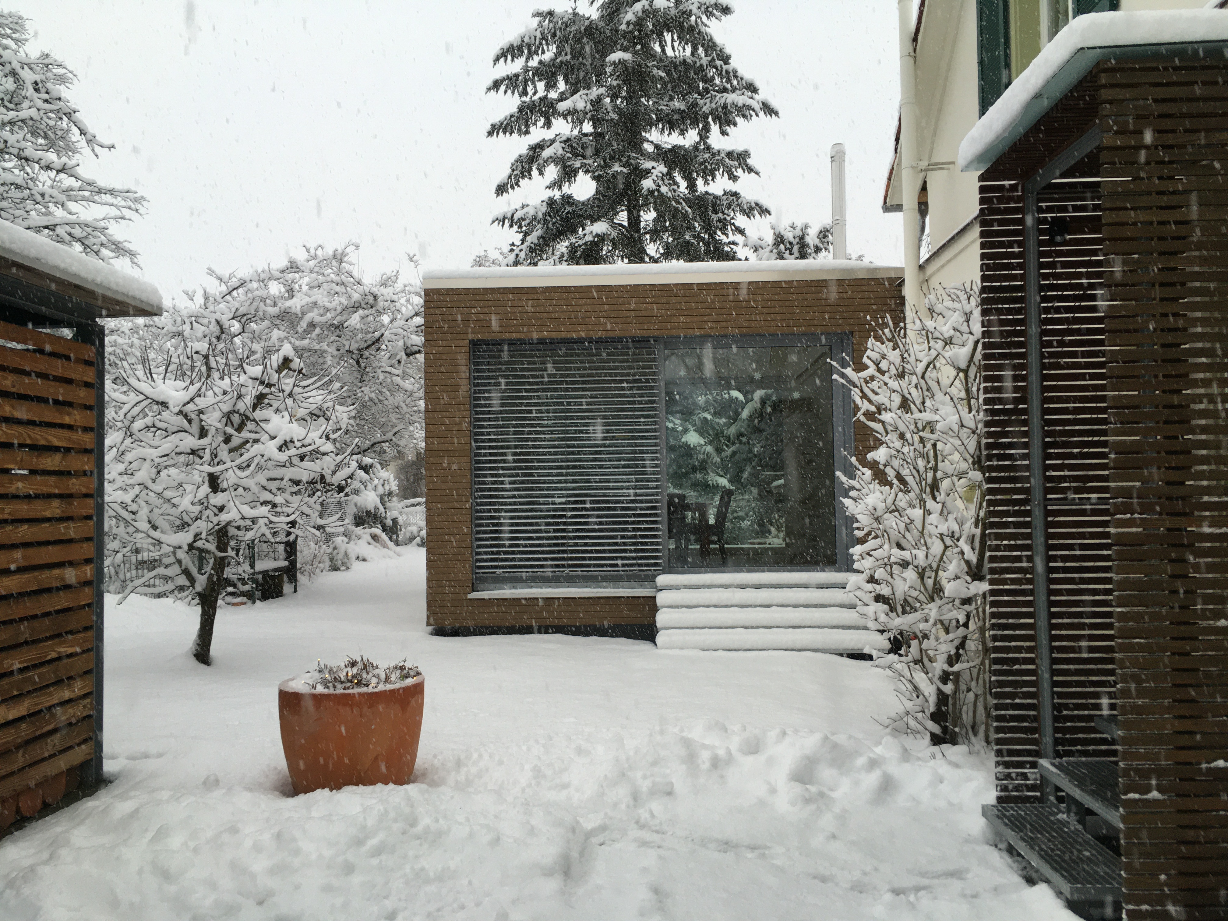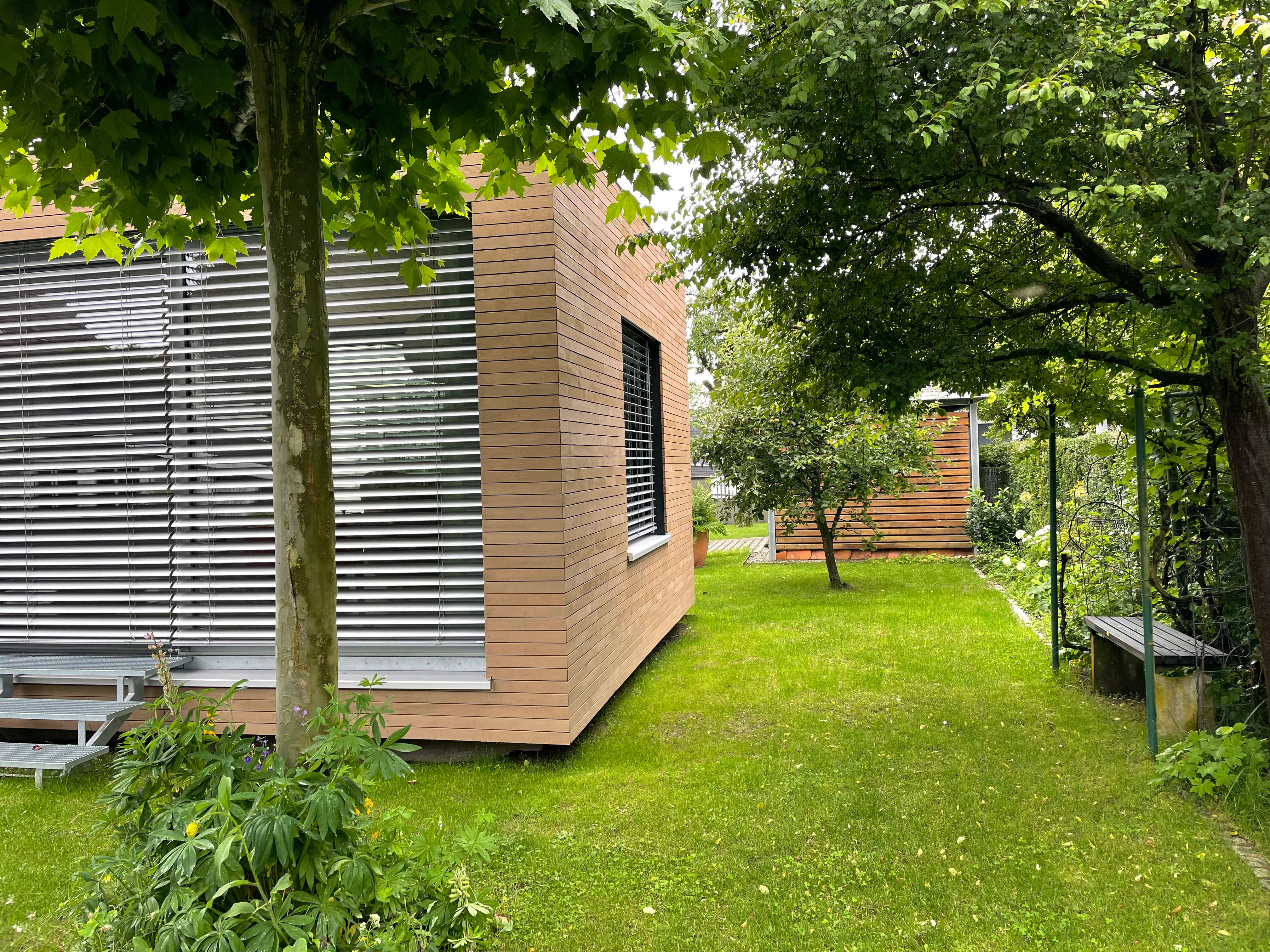 Erweiterung eines bestehenden Wohnhauses durch ein Garten- / Wohnzimmer. Holzkonstruktion, Fassade mit Rhombusleisten. Zurückhaltende Holzarchitektur mit direktem Gartenbezug.