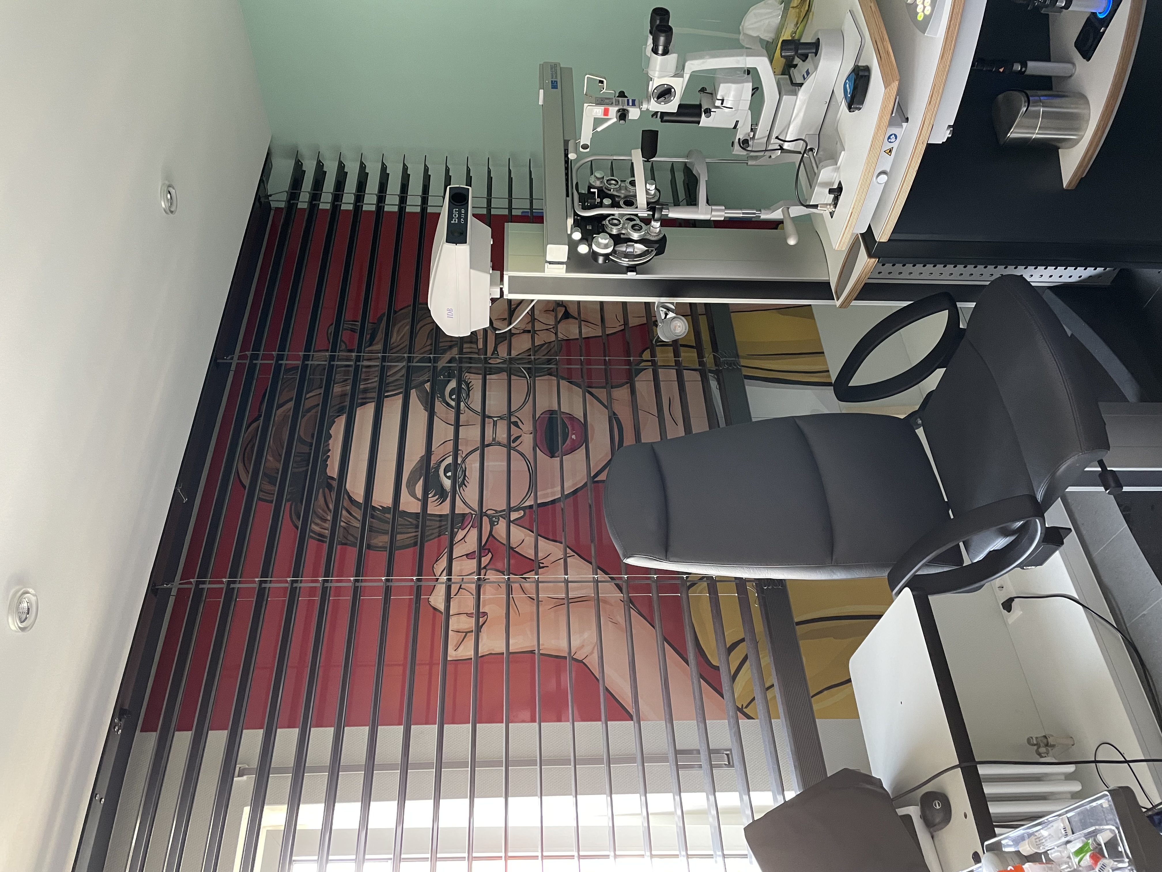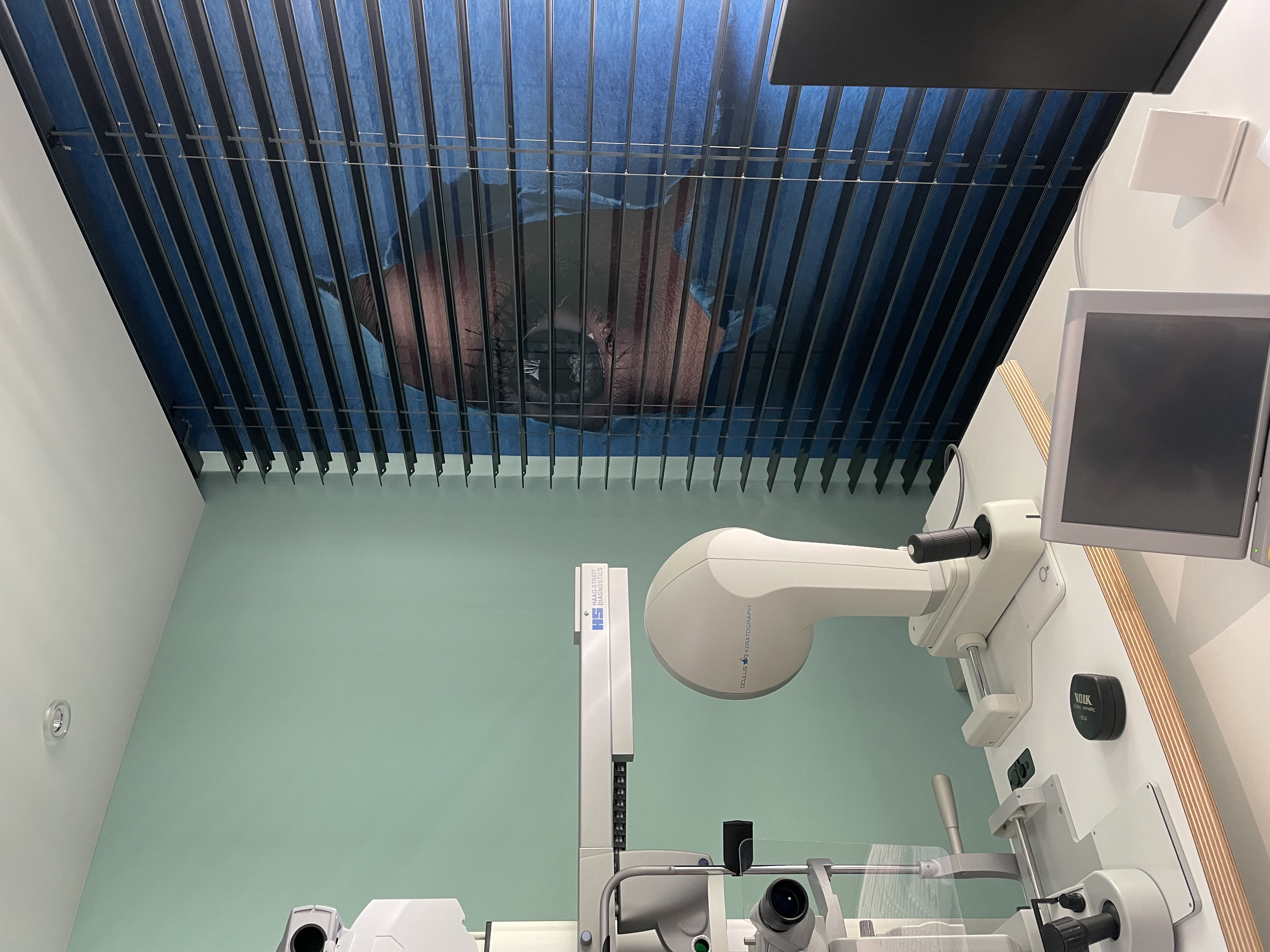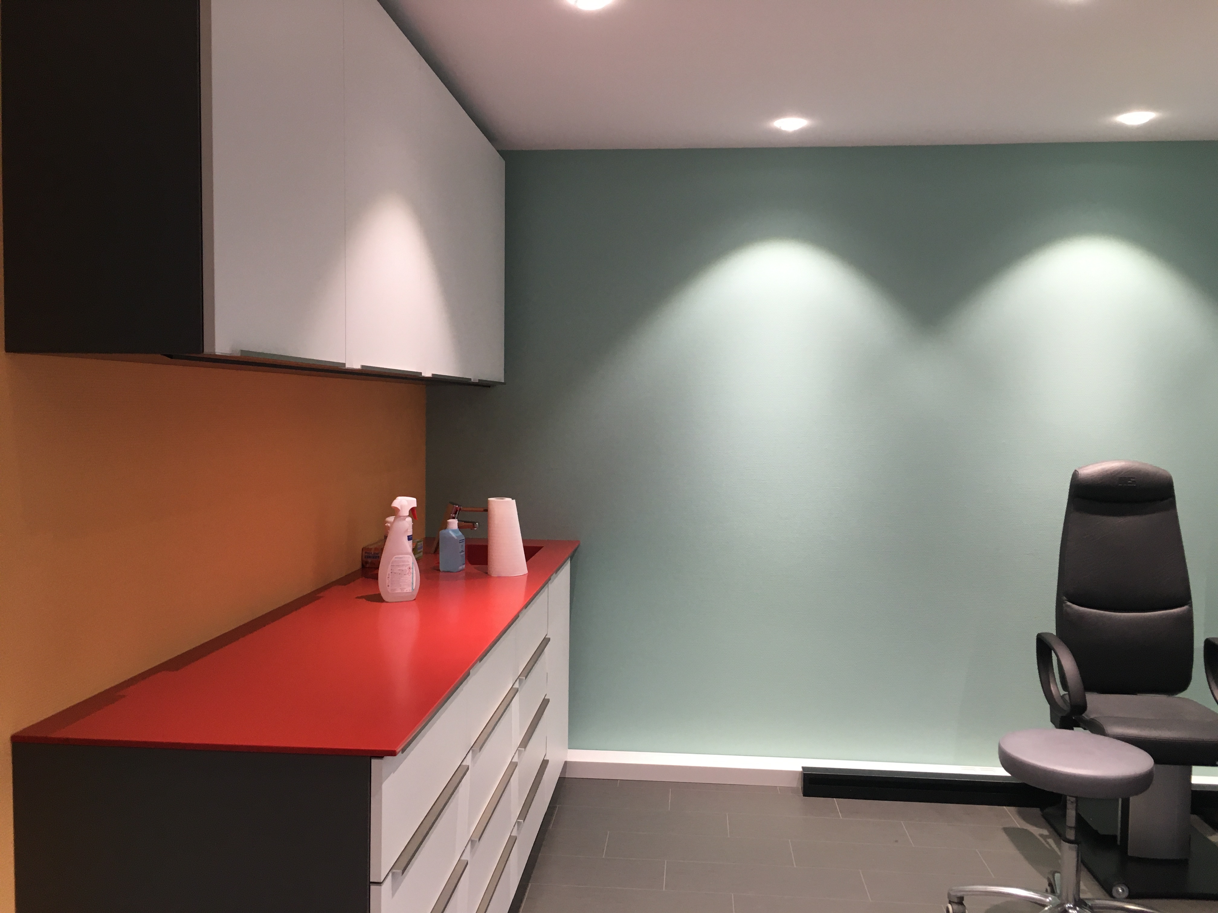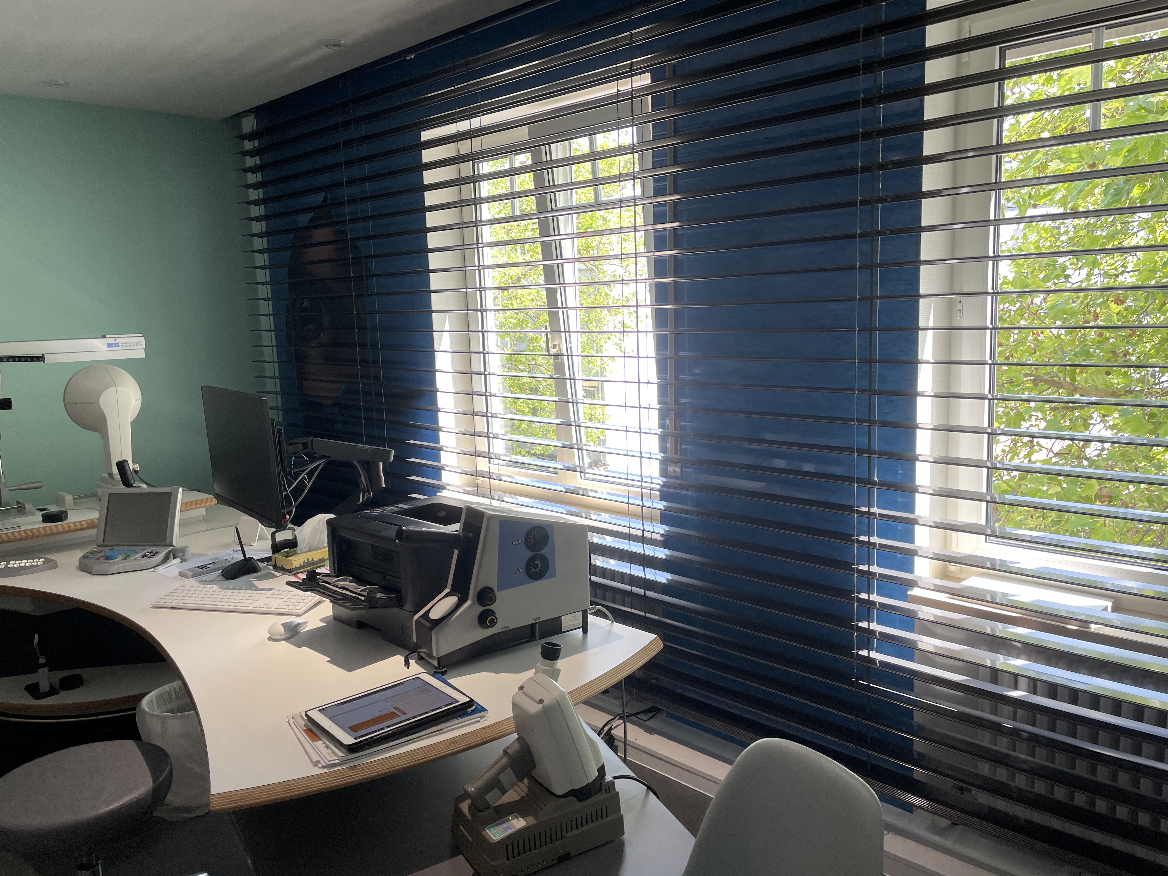 Innenarchitektur einer Augenarztpraxis zu einer modernen Augenarztpraxis. Farbkonzept mit Pastelltönen. Bilder hinter der Raumverdunkelung. Raumverdunkelung mit Raffstoren (Z-Lamelle)