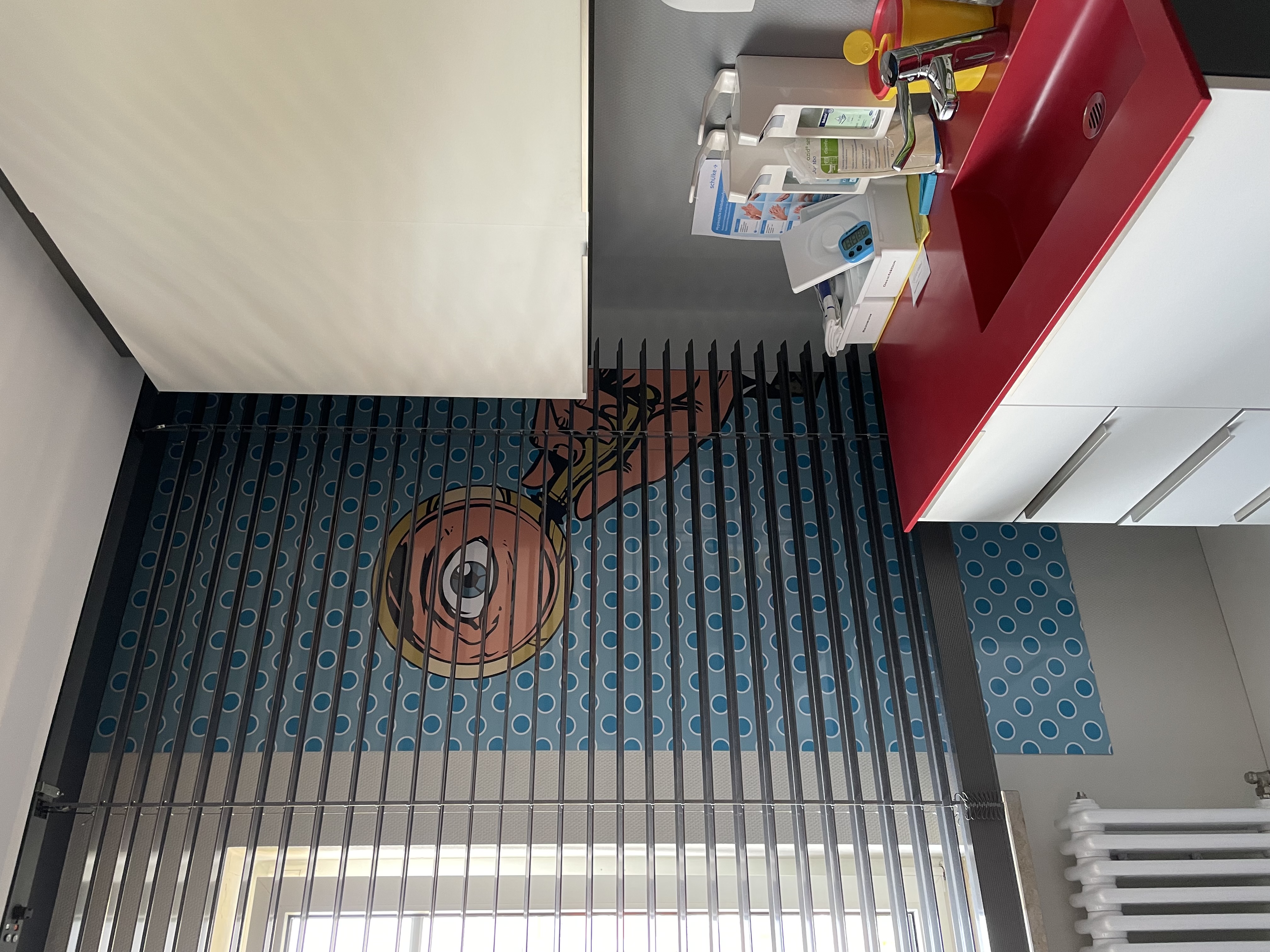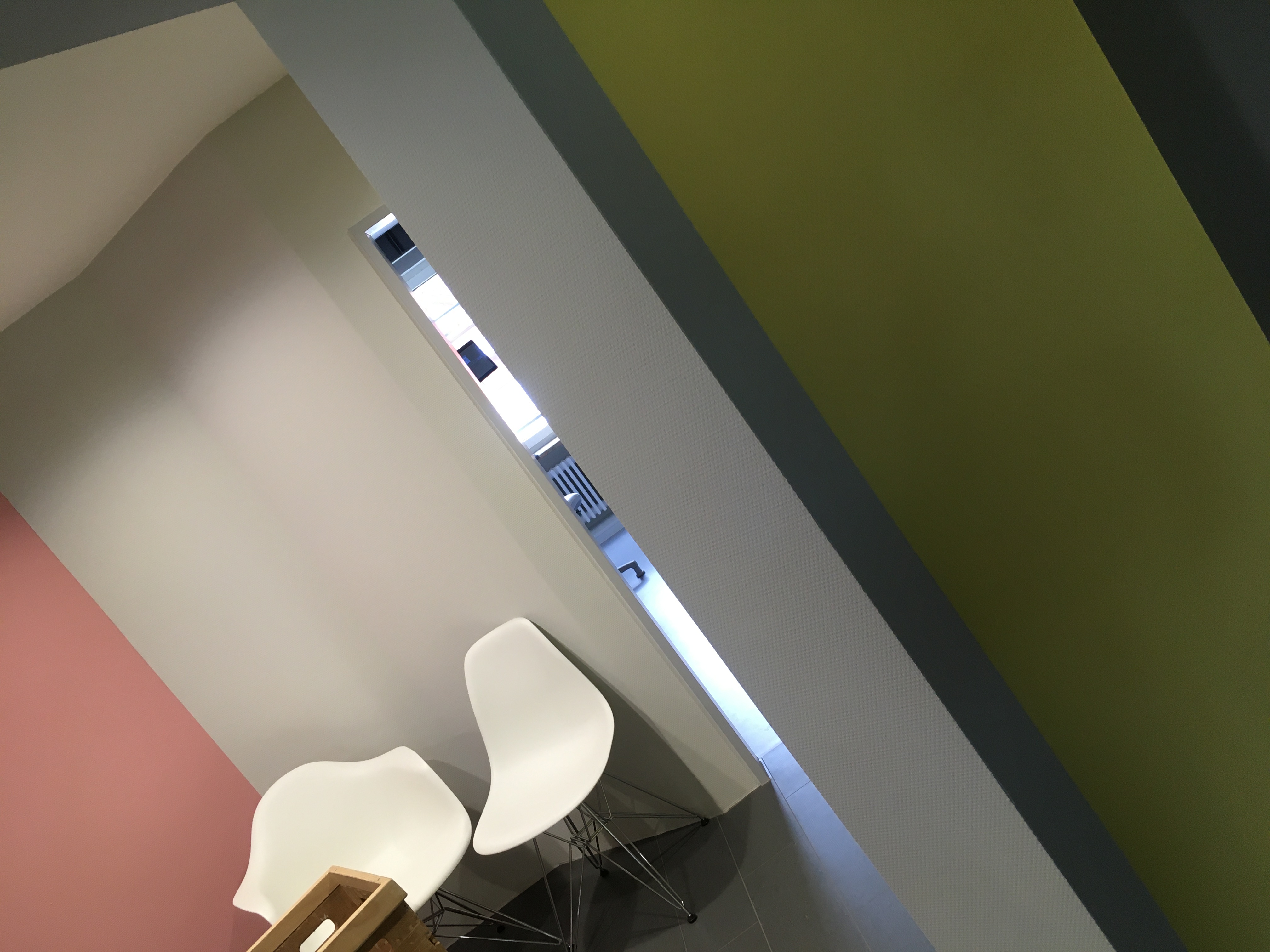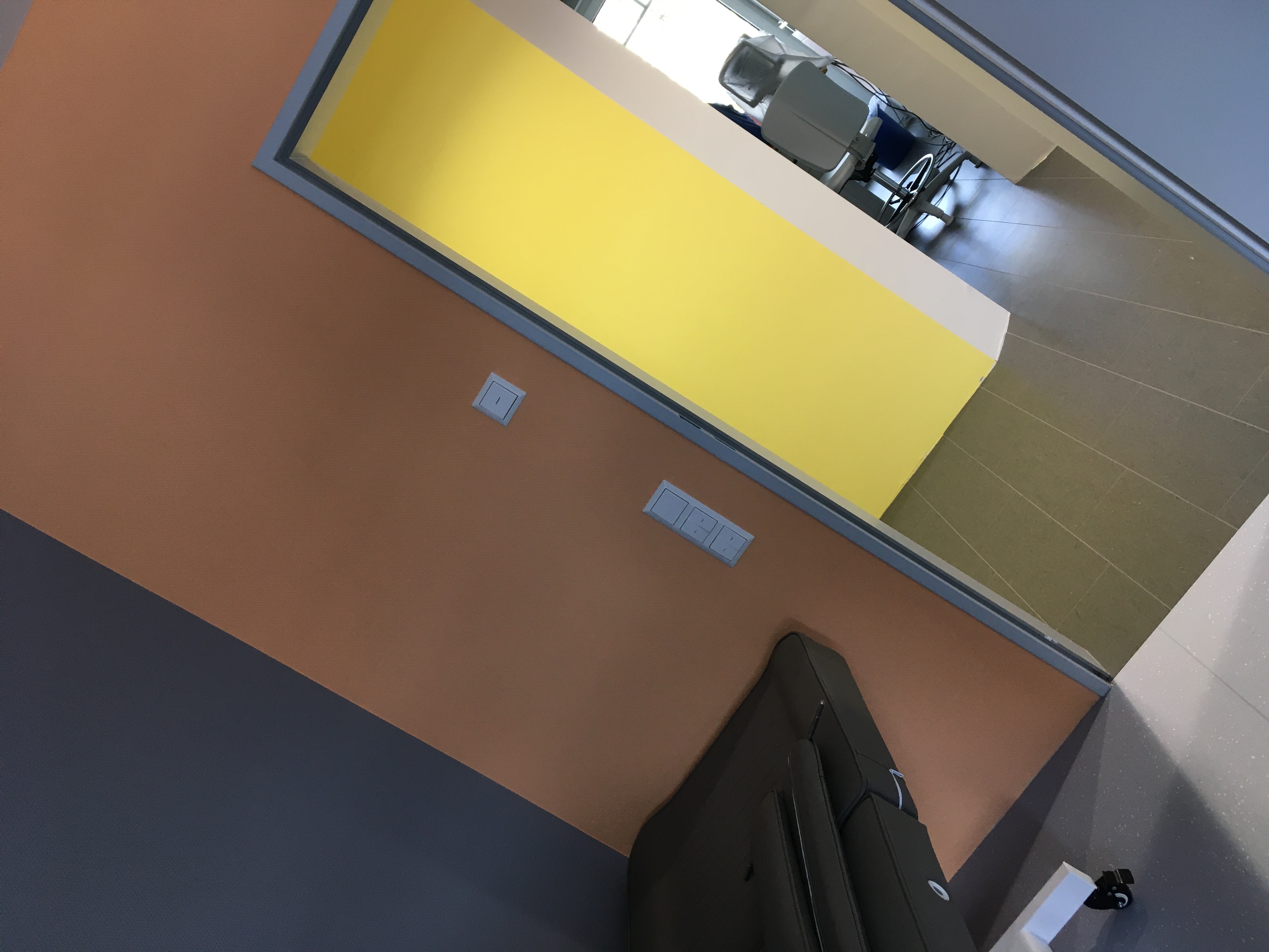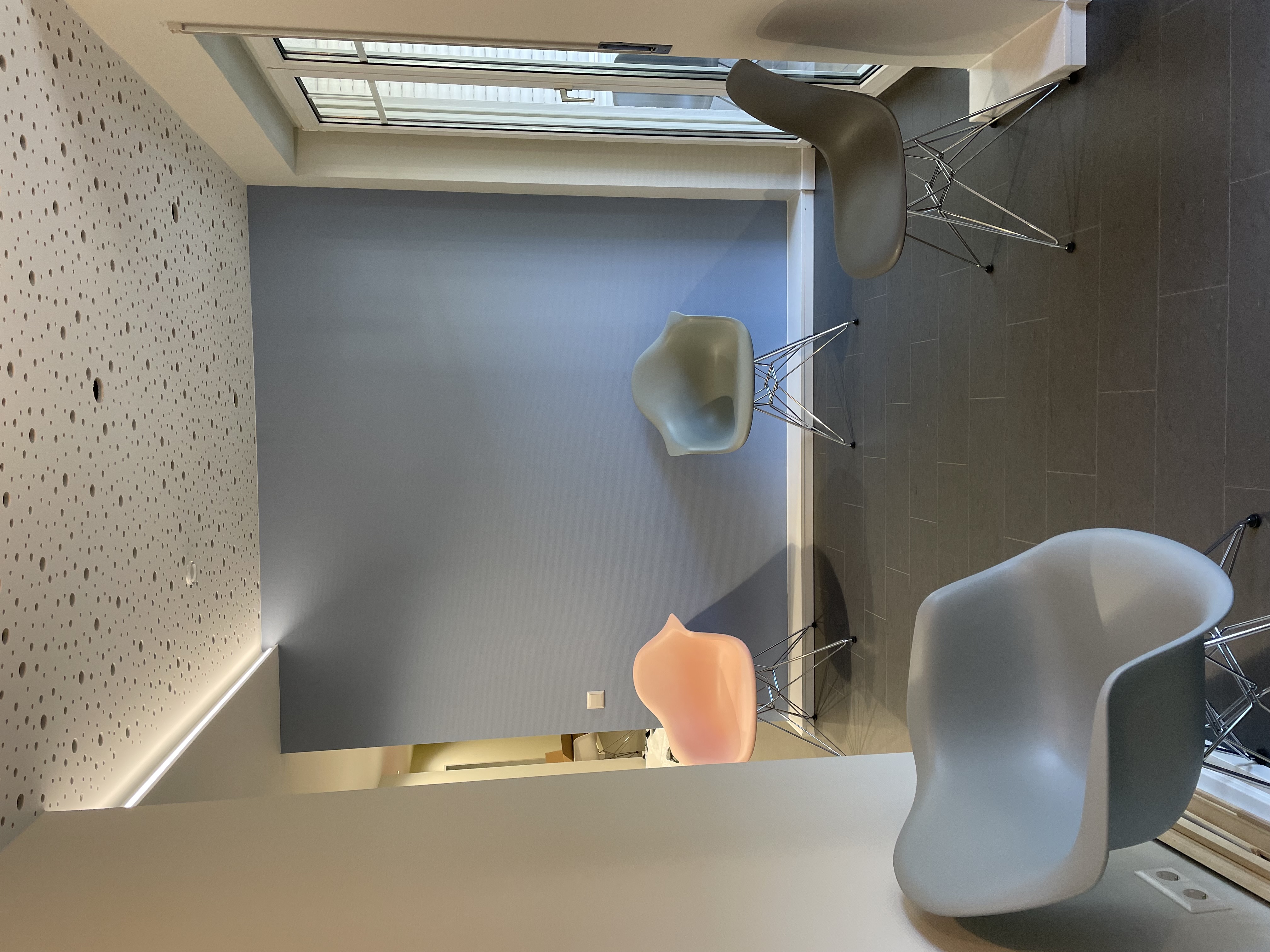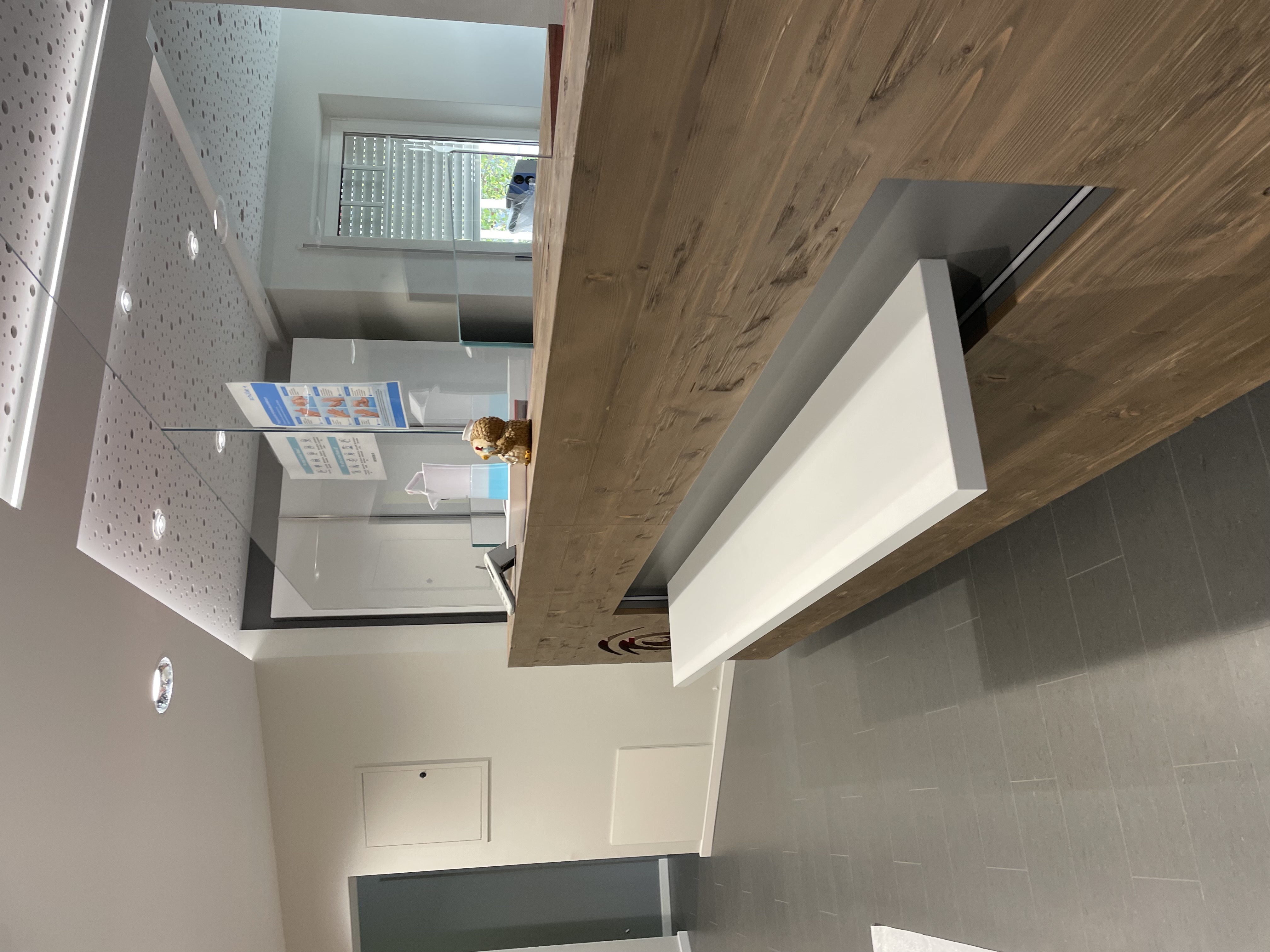 Innenarchitektur einer Augenarztpraxis zu einer modernen Augenarztpraxis. Farbkonzept mit Pastelltönen. Bilder hinter der Raumverdunkelung. Raumverdunkelung mit Raffstoren (Z-Lamelle)