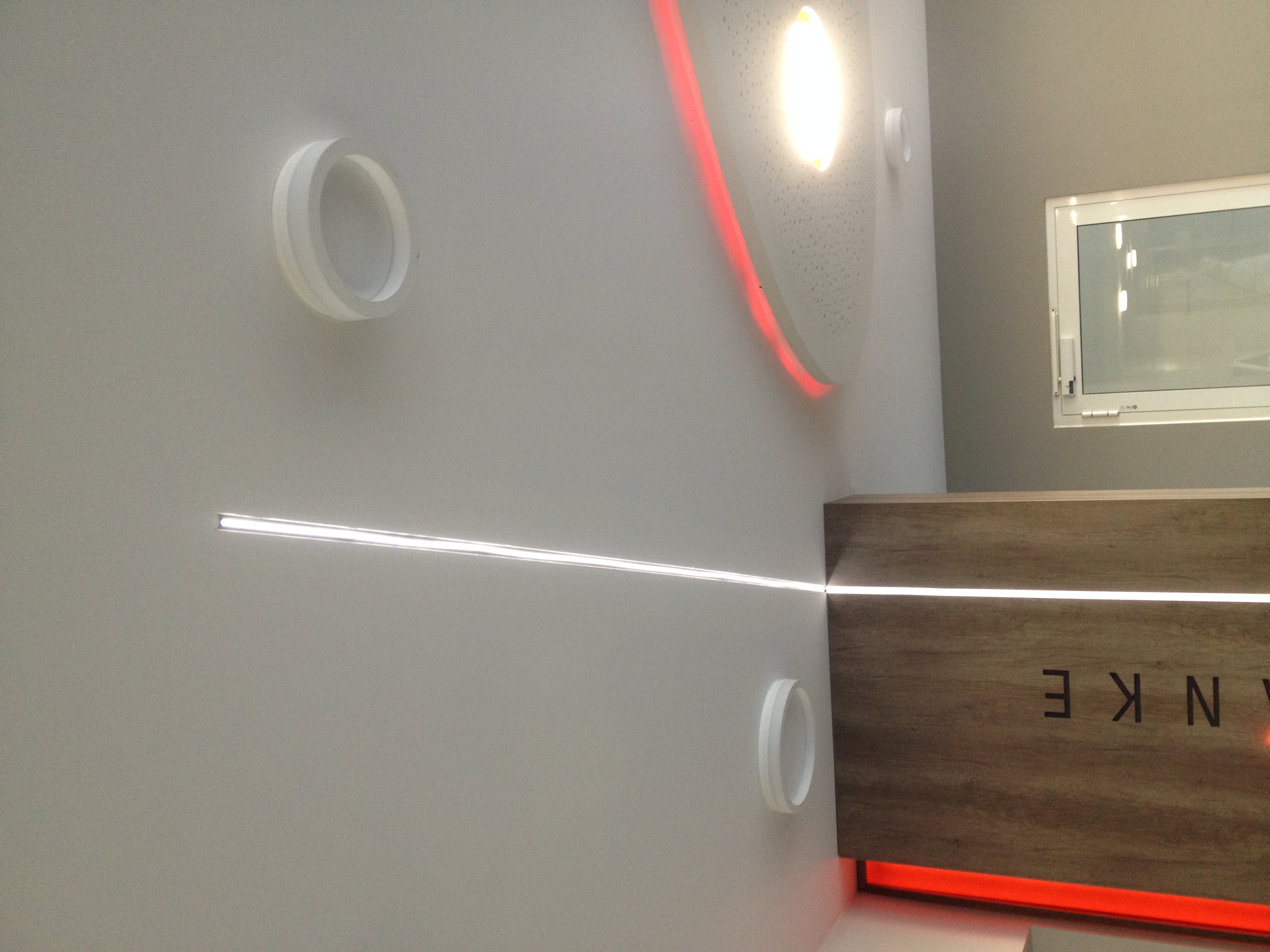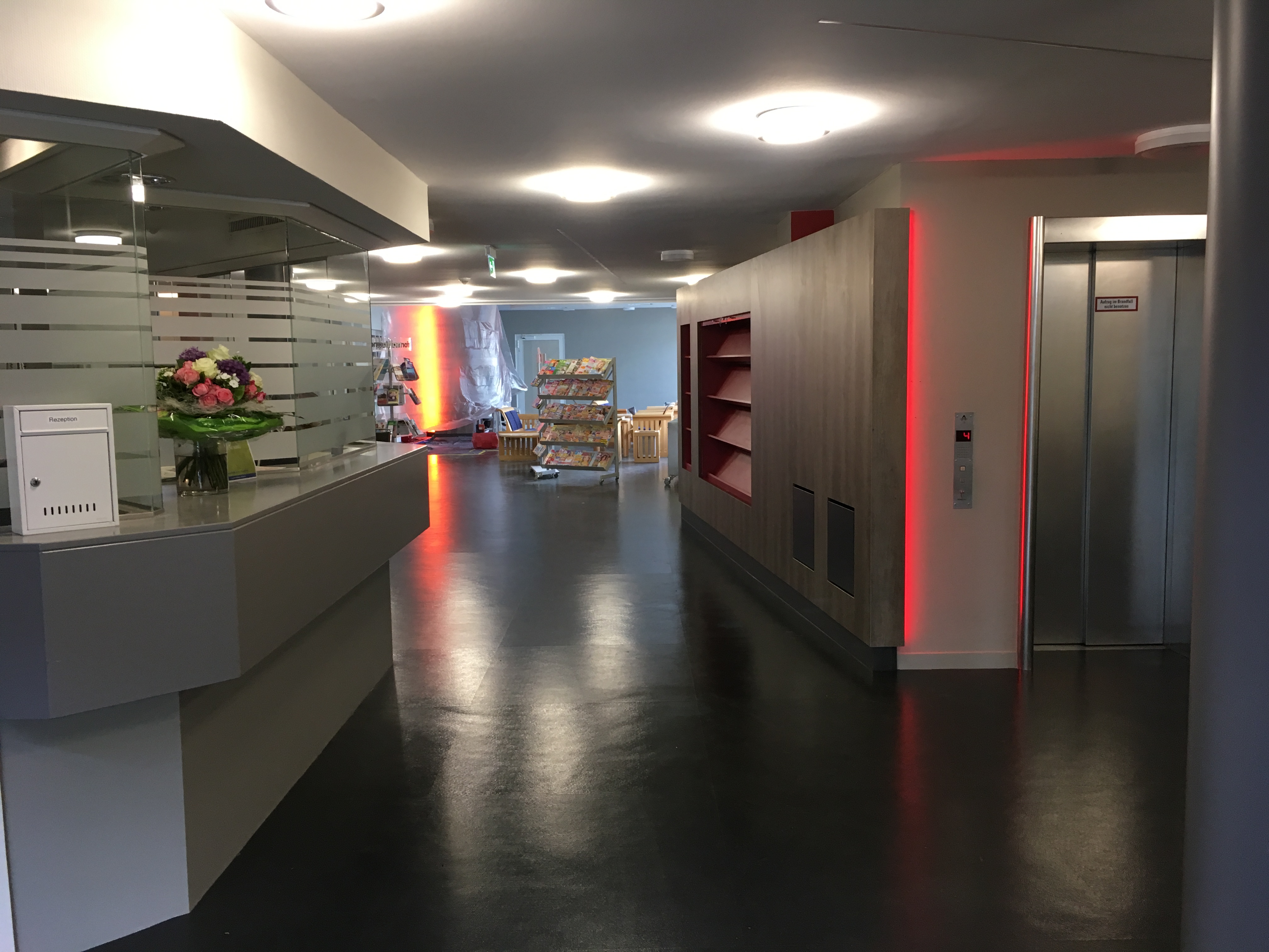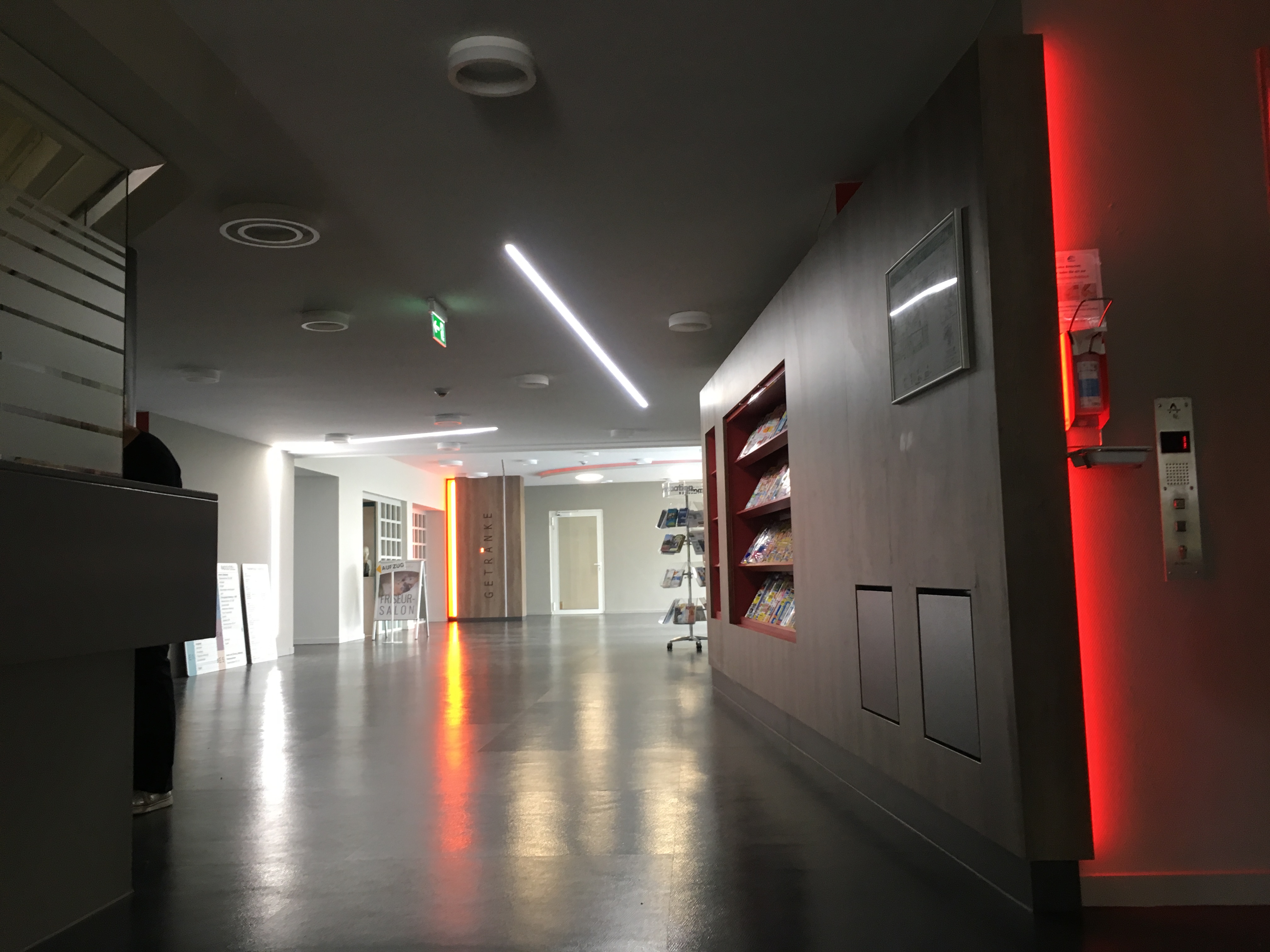 Umgestaltung des Eingangsbereichs/Foyers im Hegau-Bodensee-Klinikums (Radolfzell). Der Umbau wurde im Rahmen der Umsetzung des Brandschutzkonzeptes durchgeführt. Beleuchtungskonzept mit LED Technik.